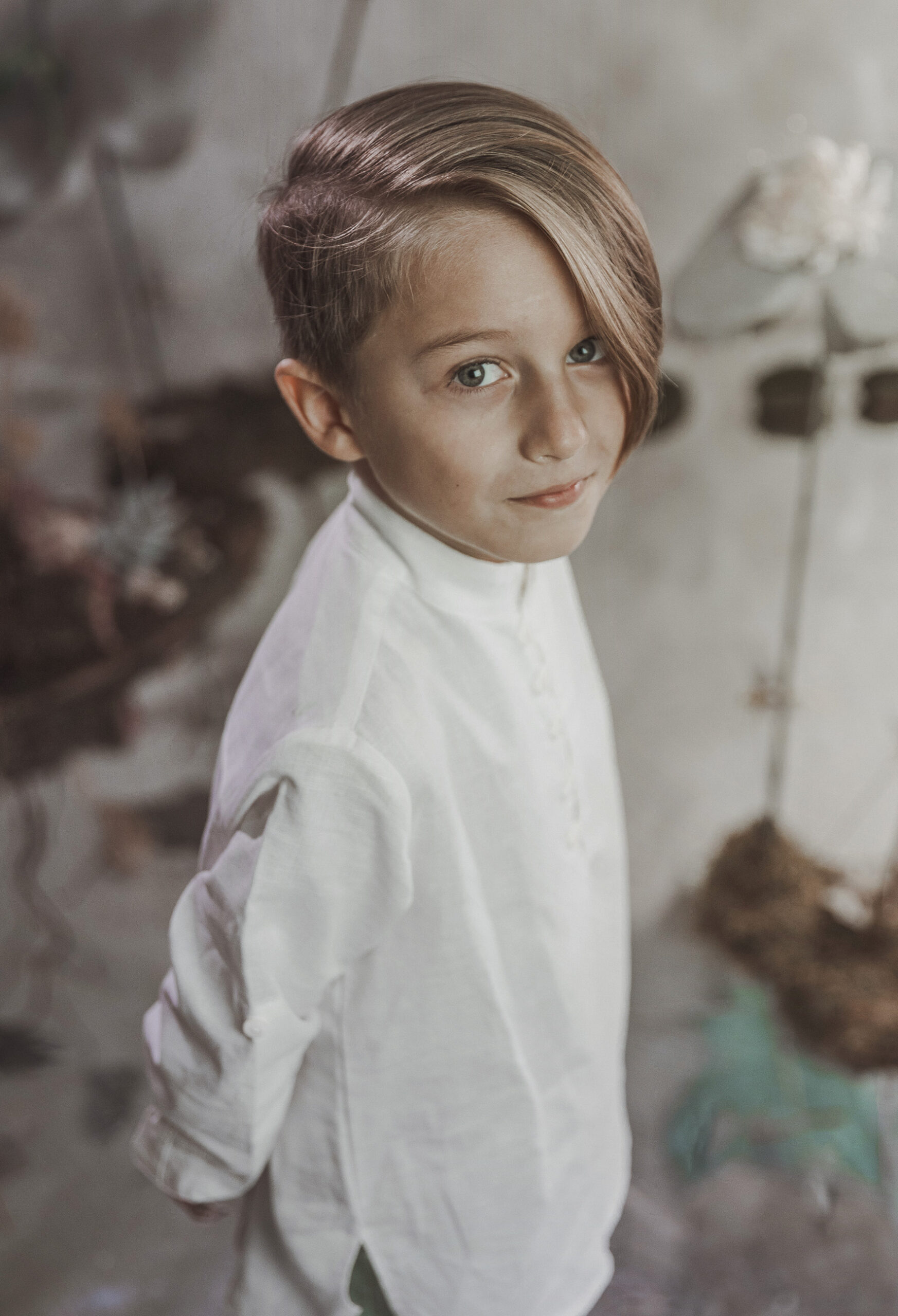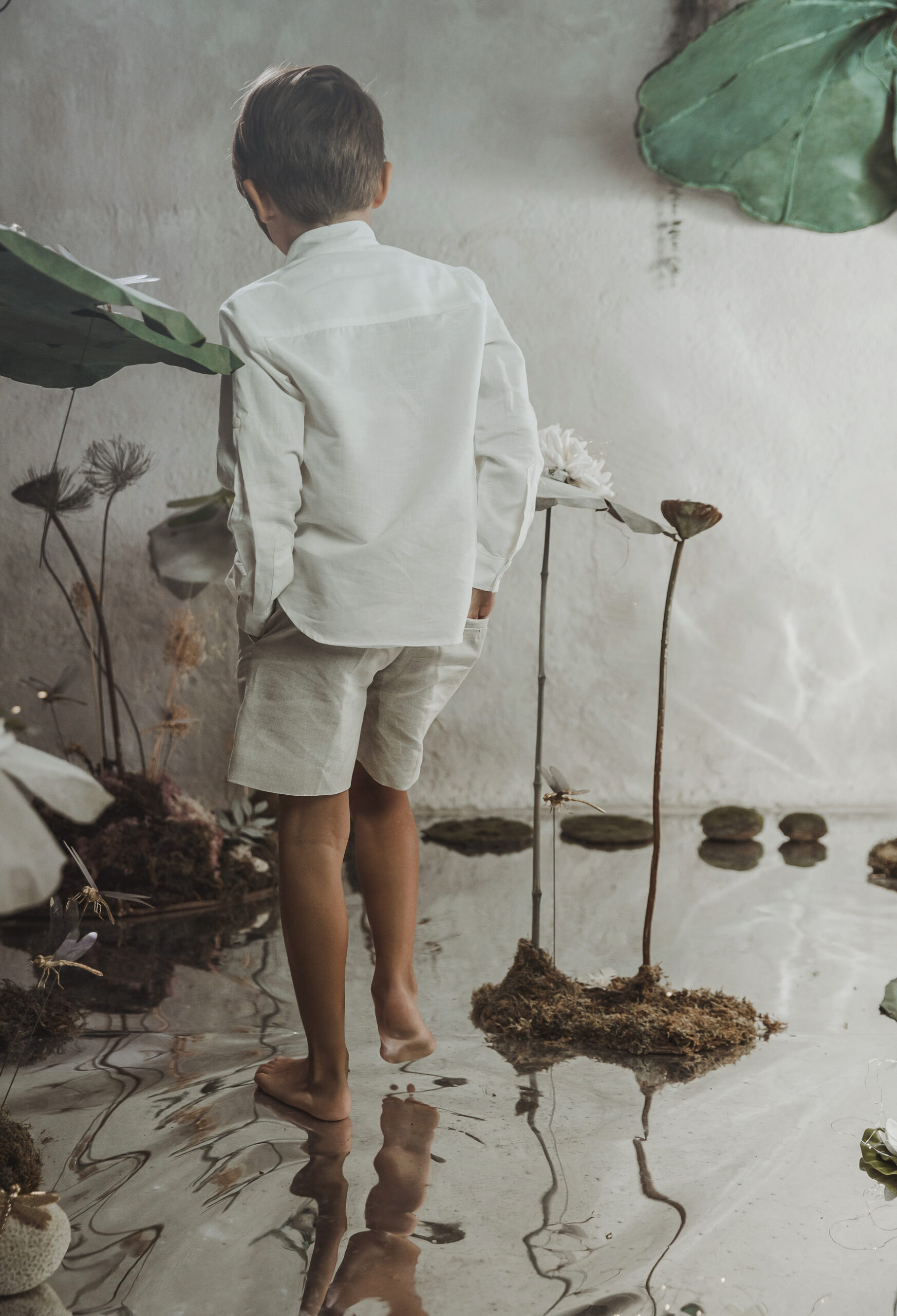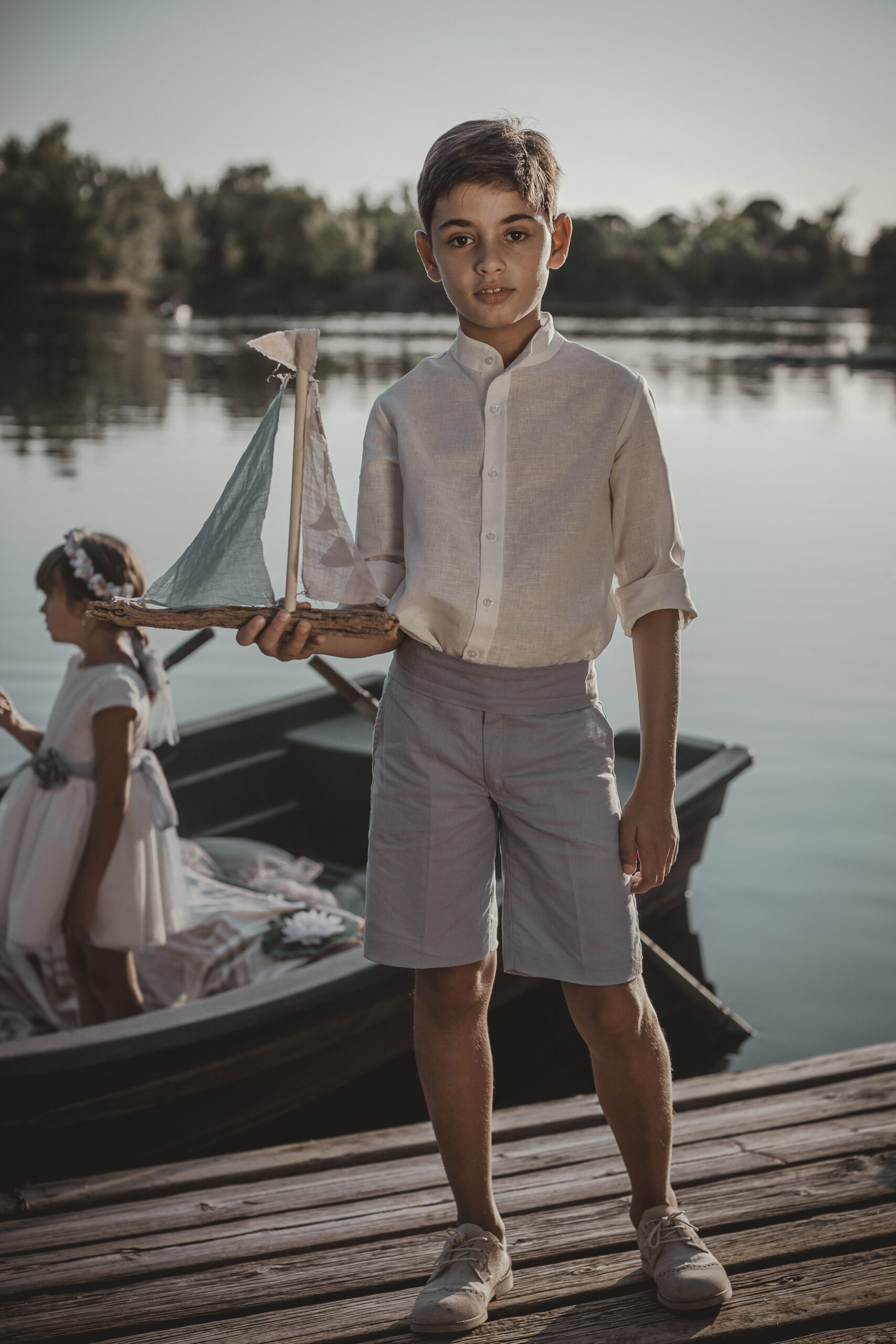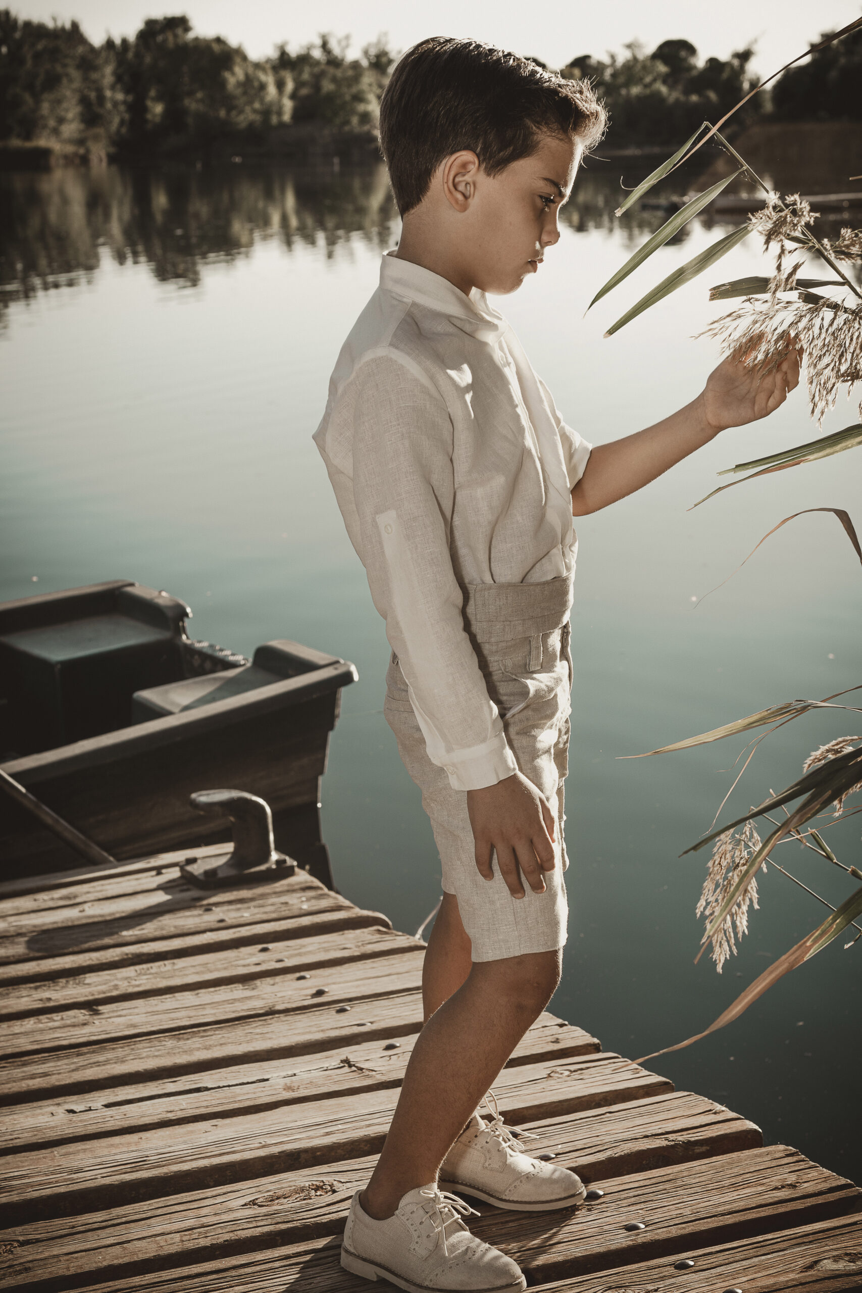 Conjunto de lino niño. Camisa de cuello mao en lino crudo y pantalón y fajín de jaretas de lino tostado.