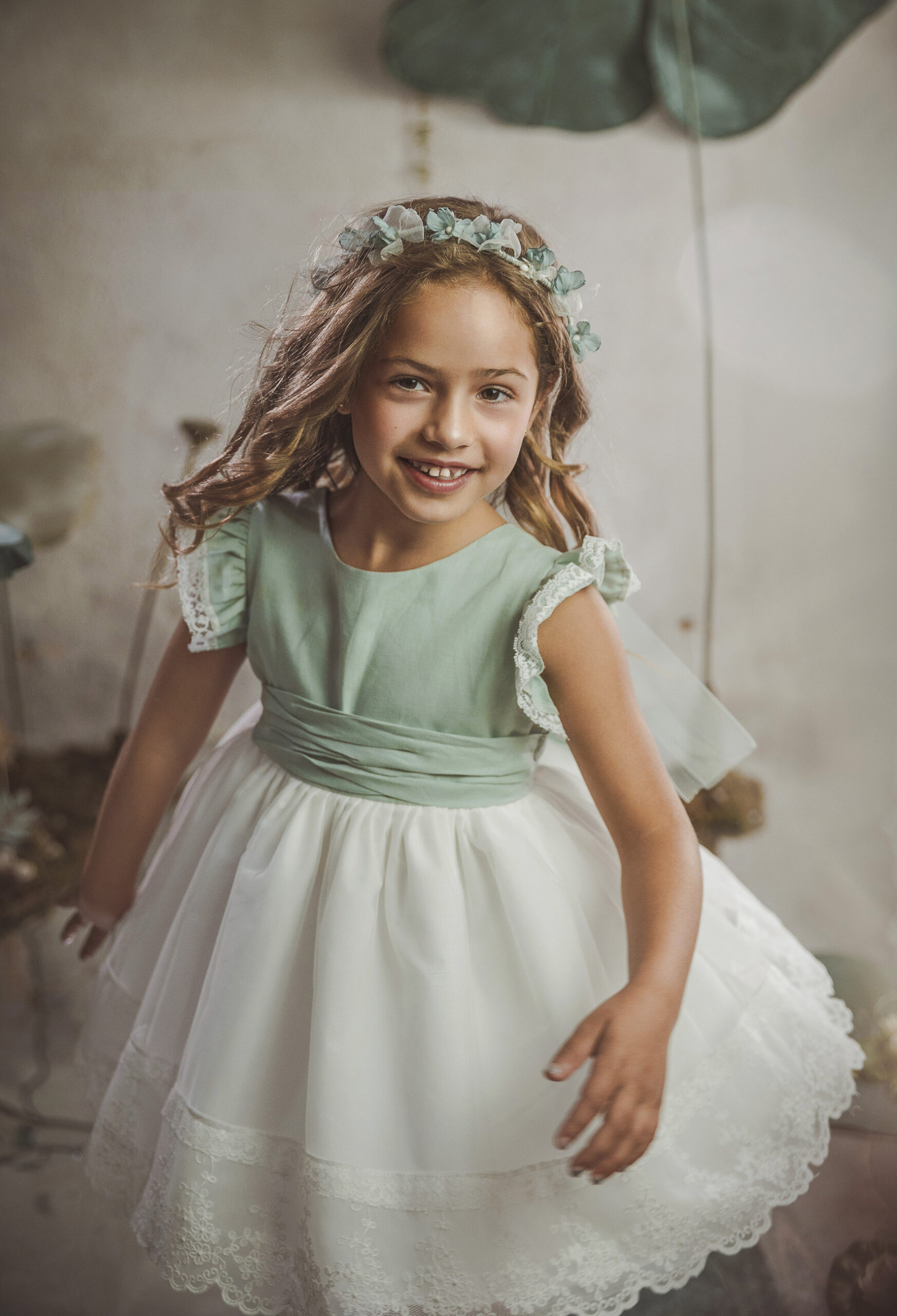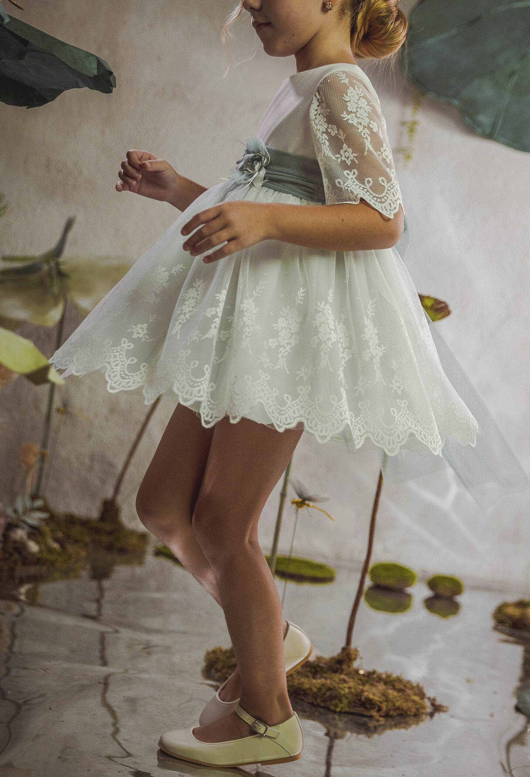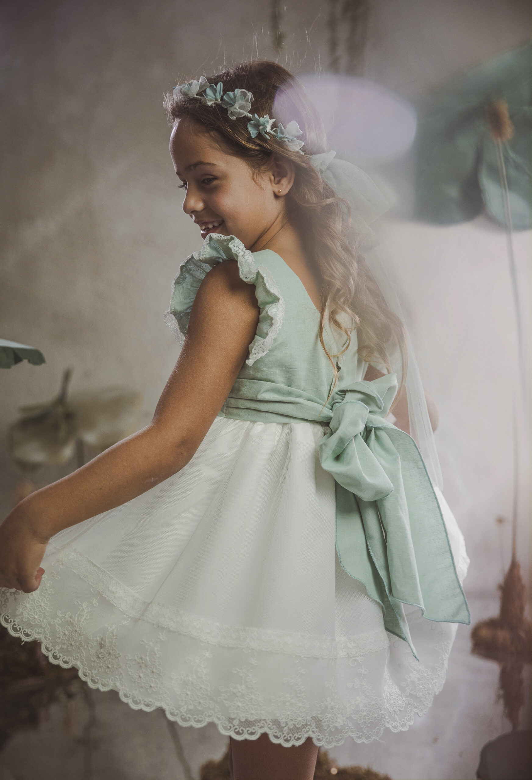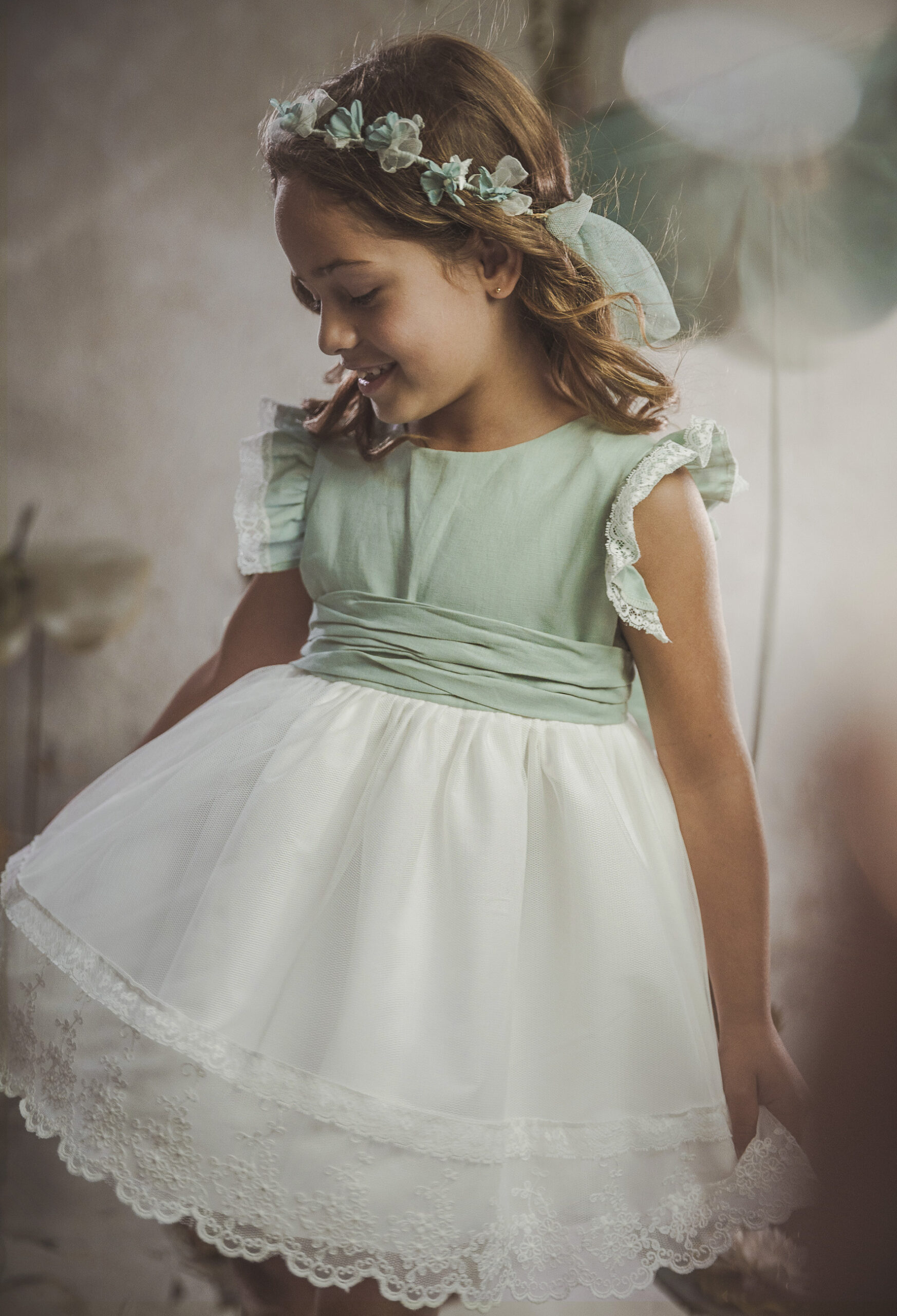 Vestido de ceremonia con el cuerpo en lino verde agua y la falda en tul blanco roto, decorado por una bonita puntilla.