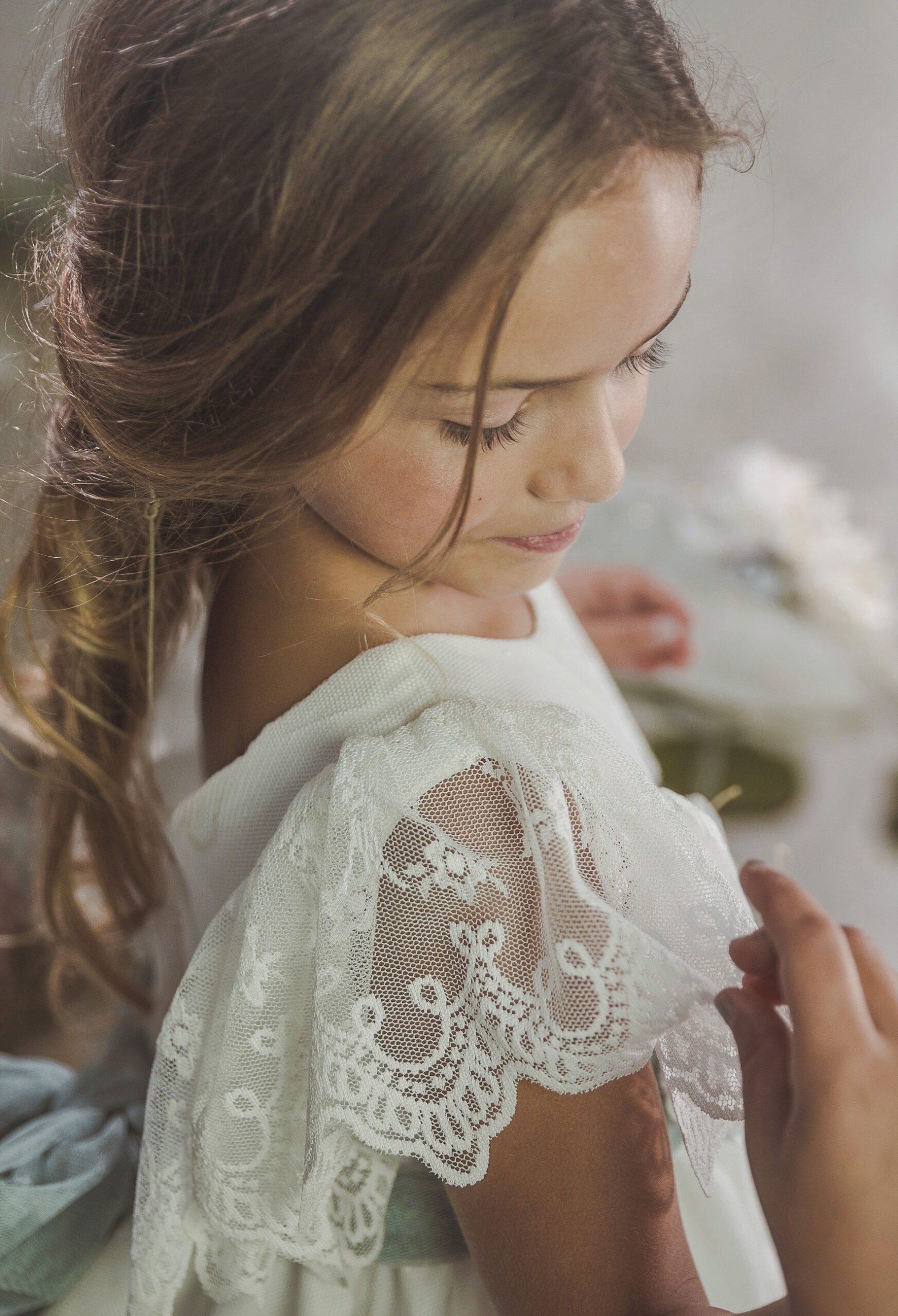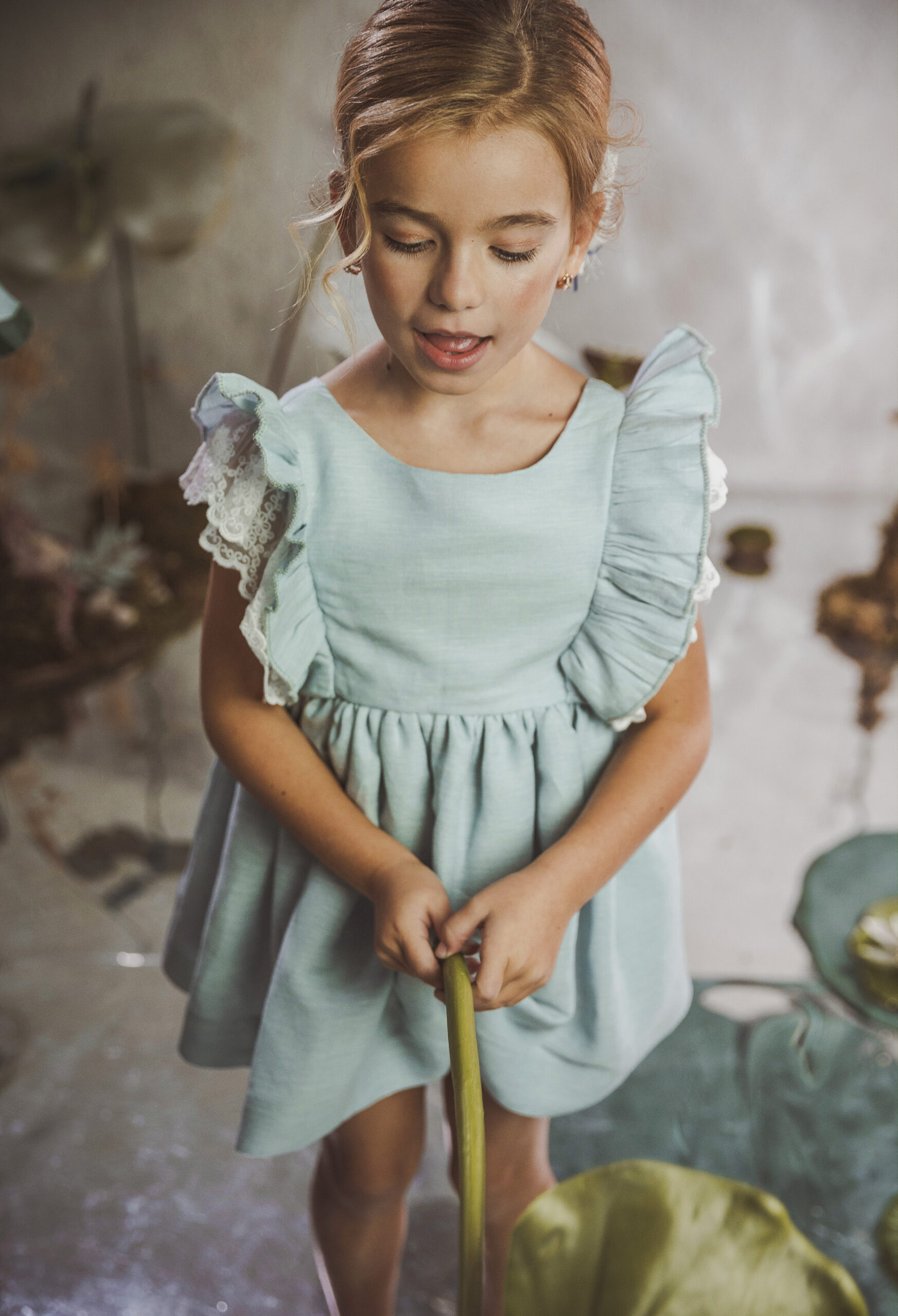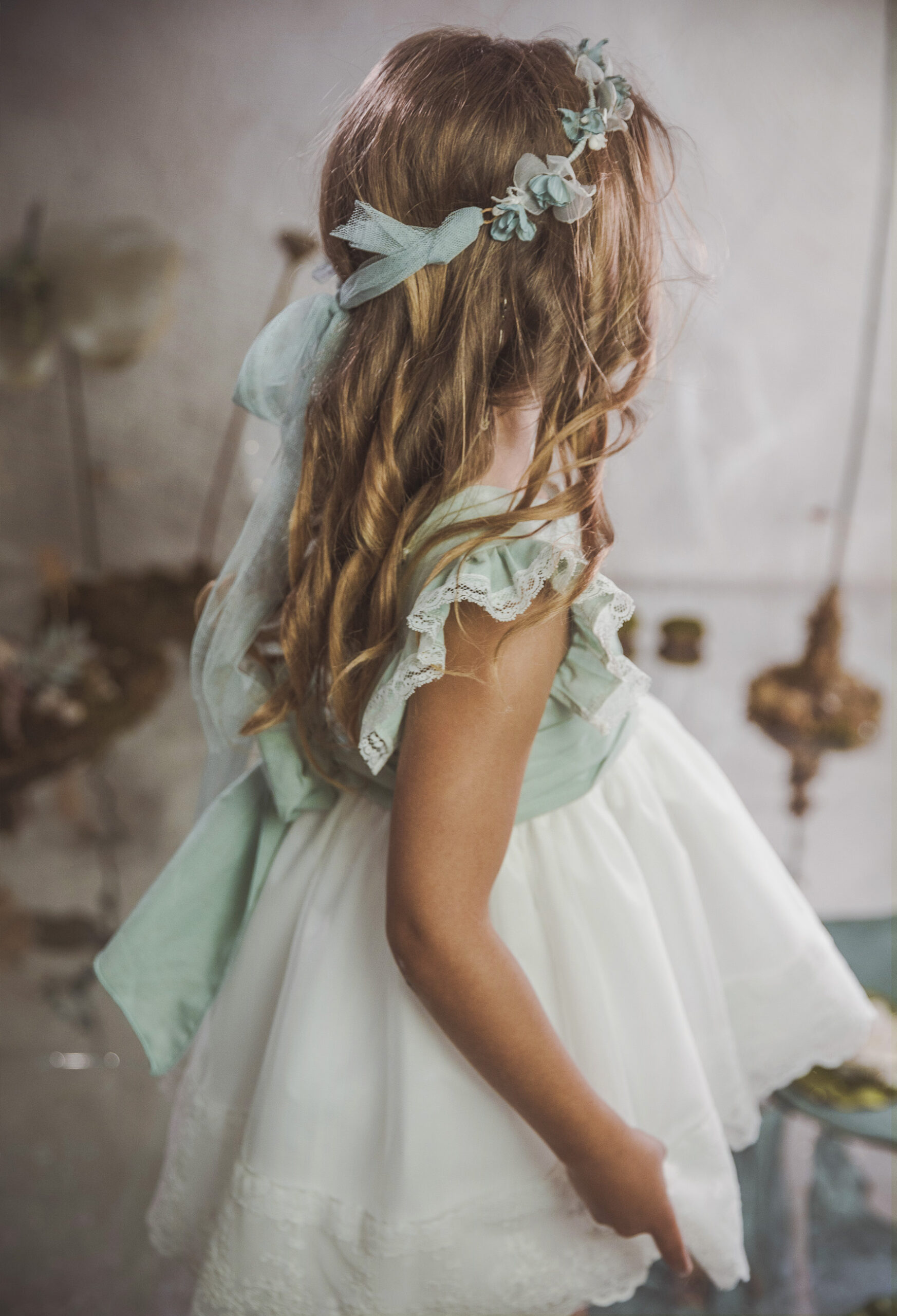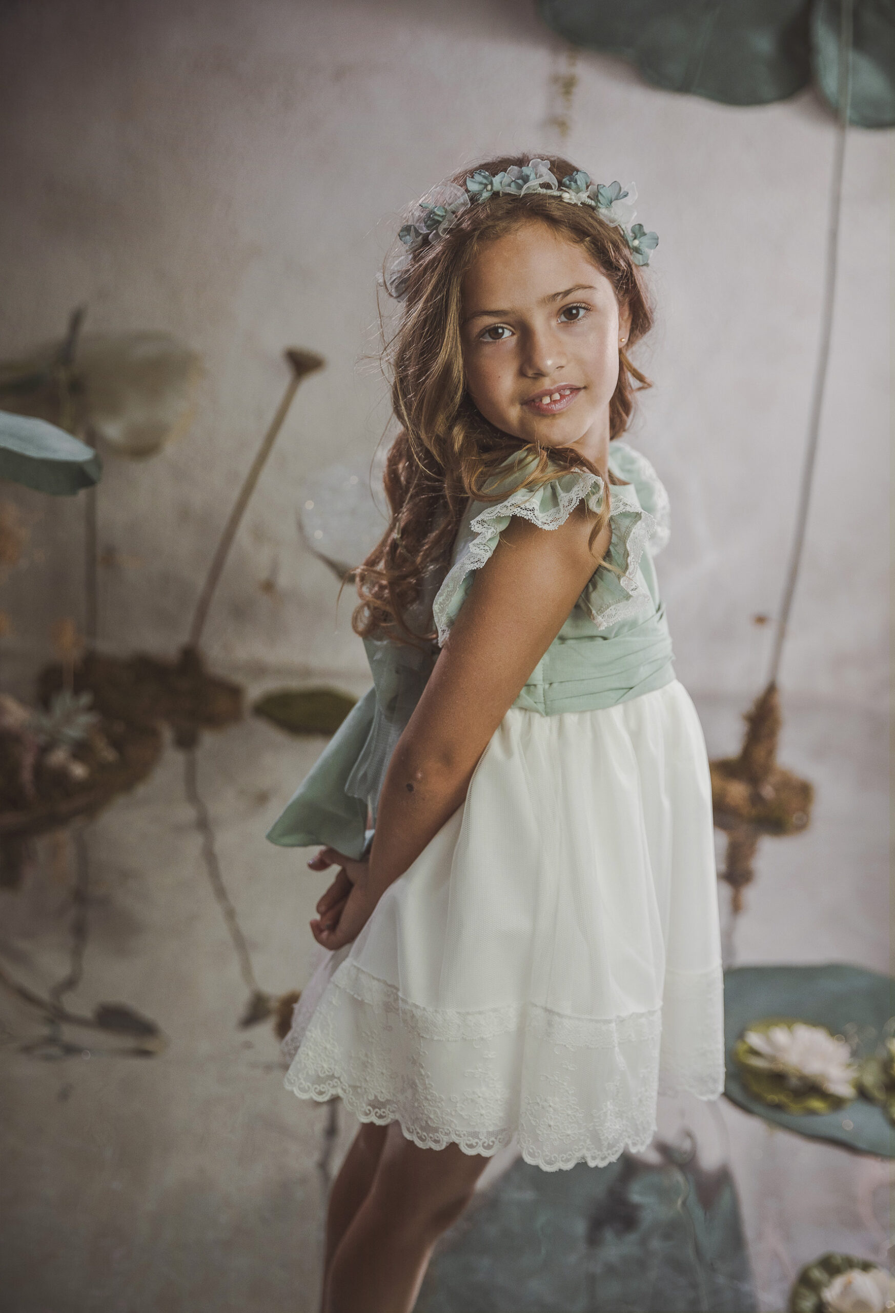 Vestido de ceremonia con el cuerpo en lino verde agua y la falda en tul blanco roto, decorado por una bonita puntilla.