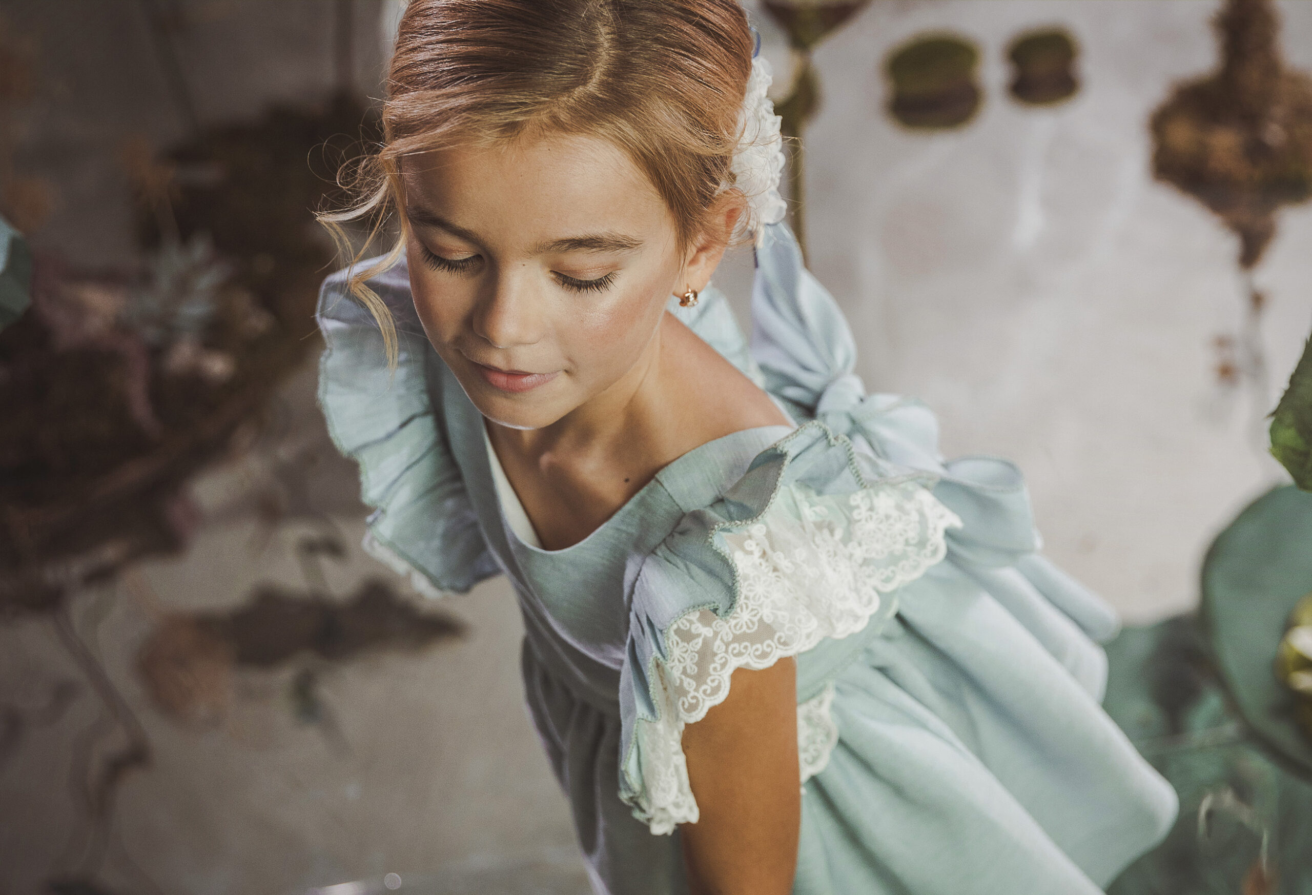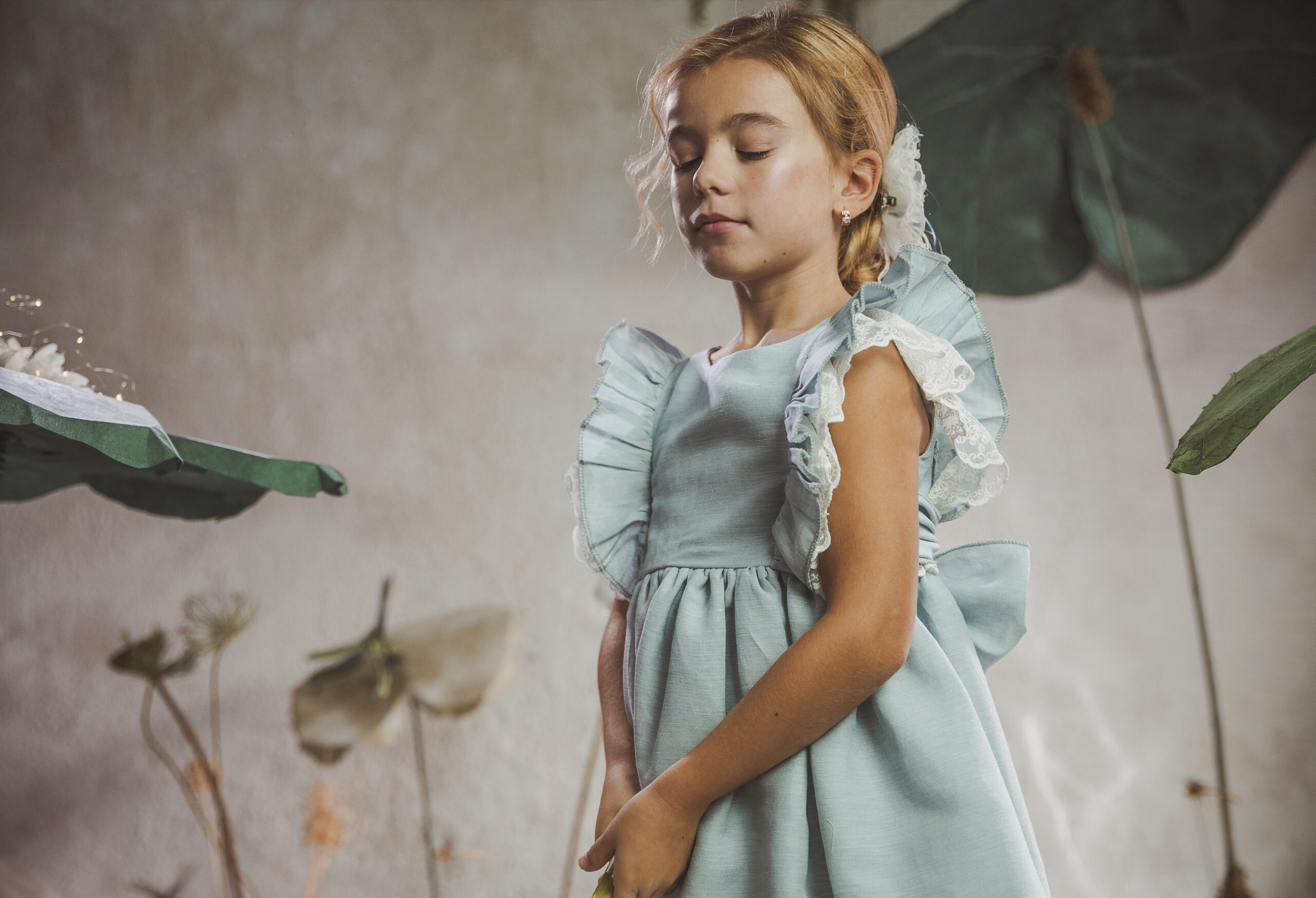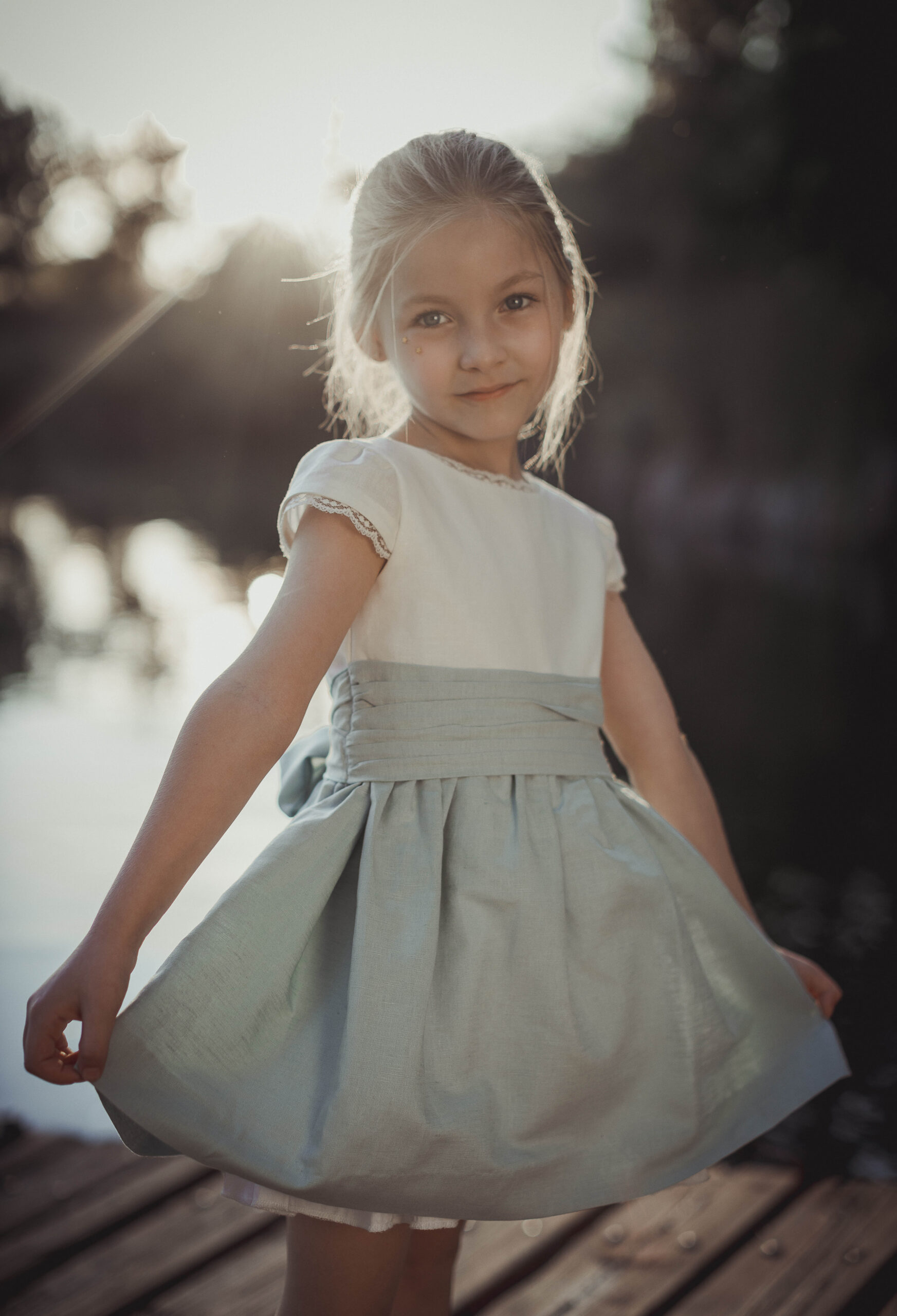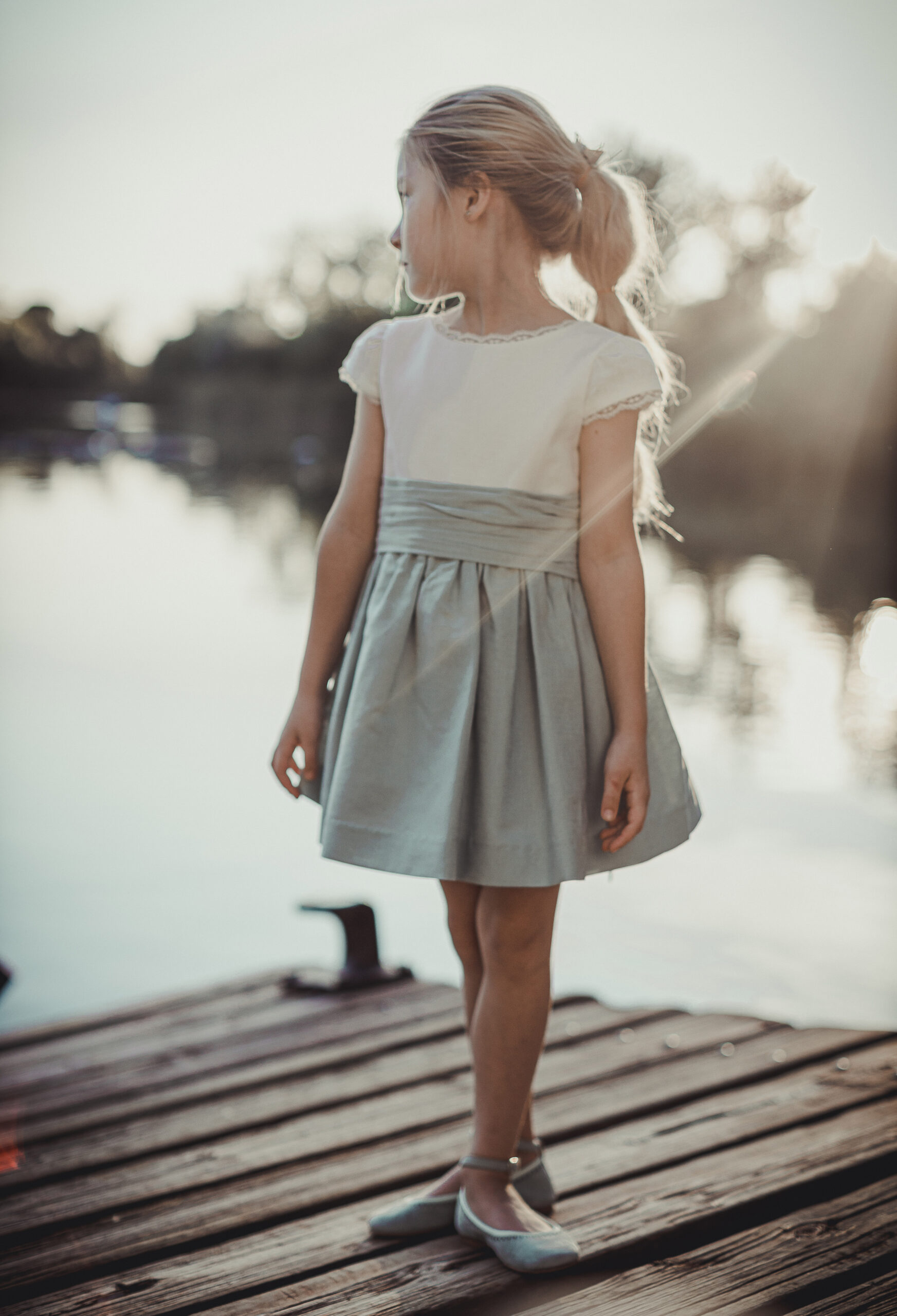 Vestido de ceremonia con el cuerpo en lino verde agua y la falda en tul blanco roto, decorado por una bonita puntilla.