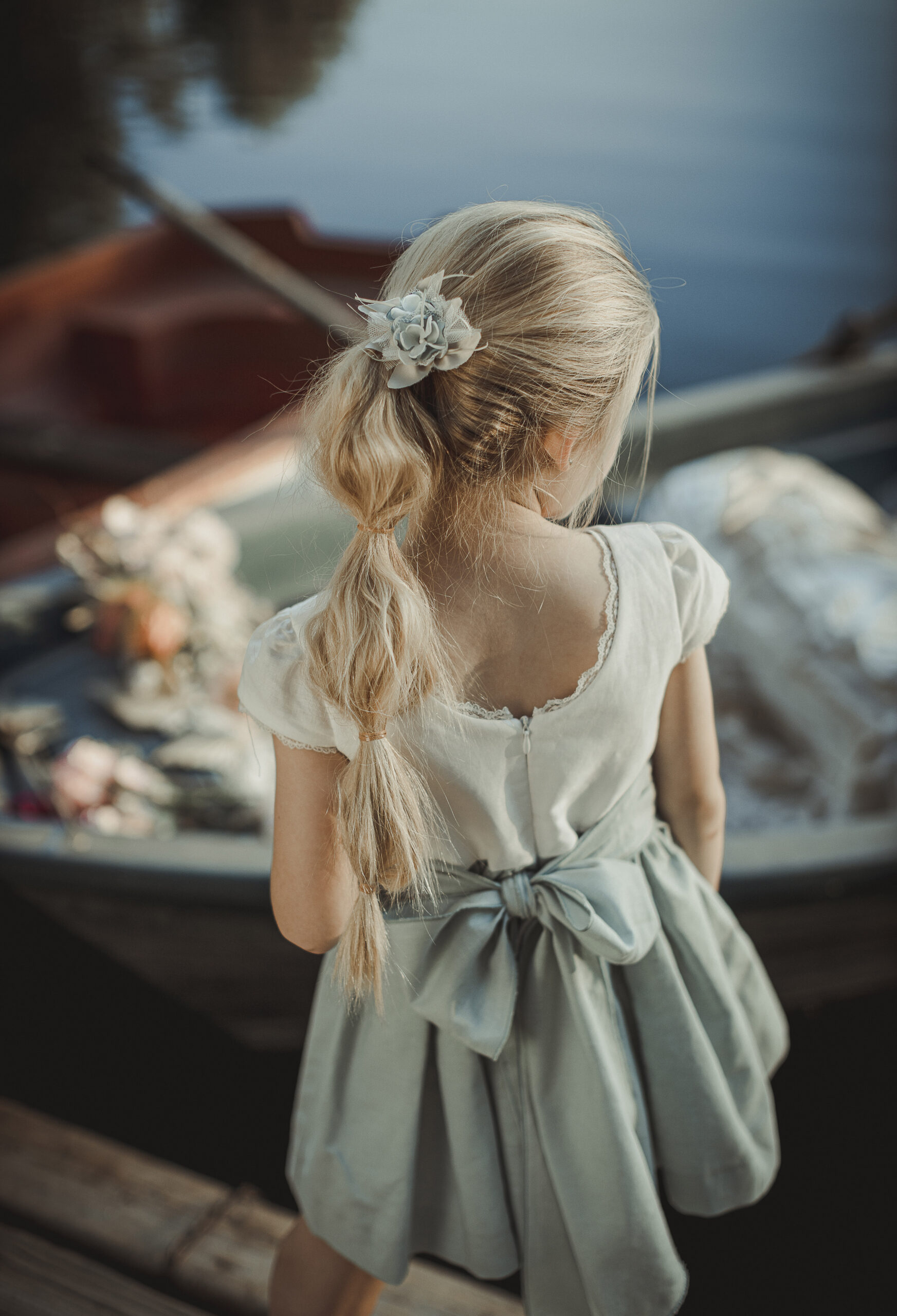 Vestido de ceremonia en lino azul océano claro. Todo en lino, lleva un escote en la espalda cuadrado, y la manga es de volante, decorado por una bonita puntilla.