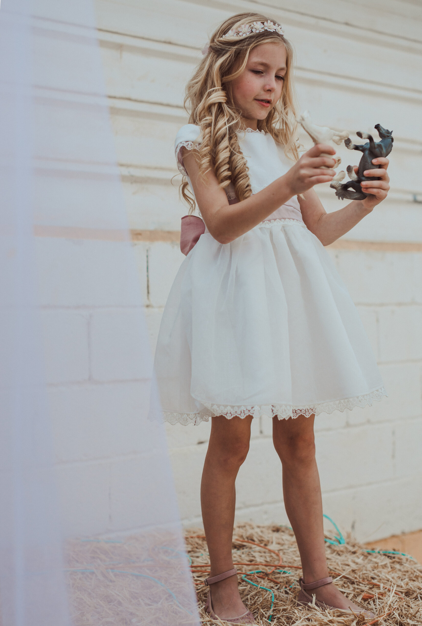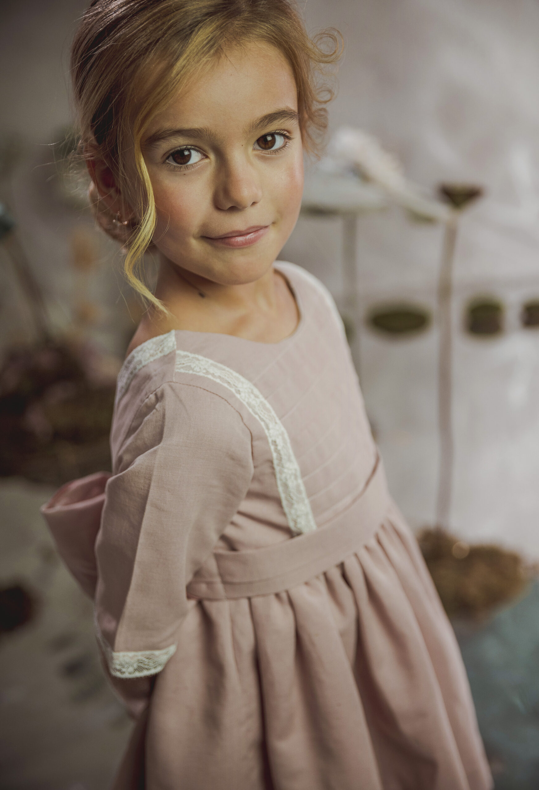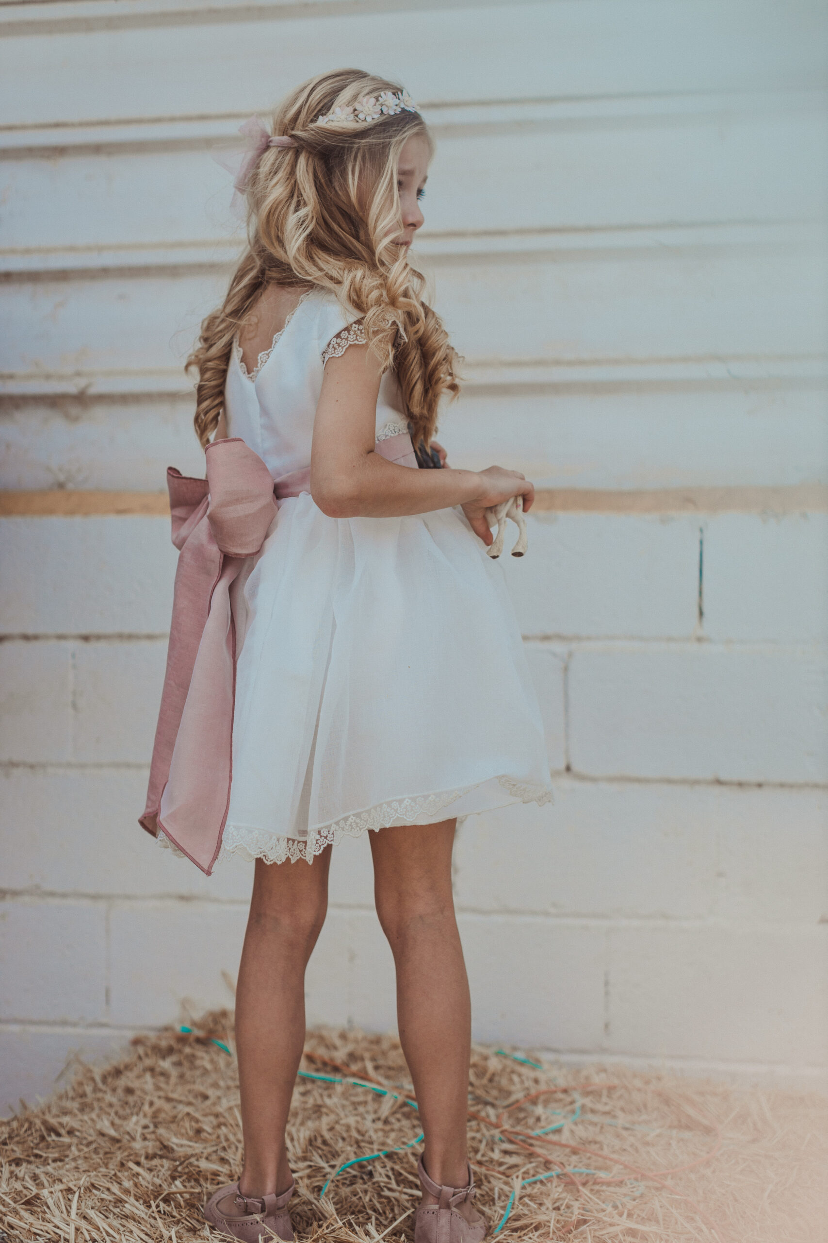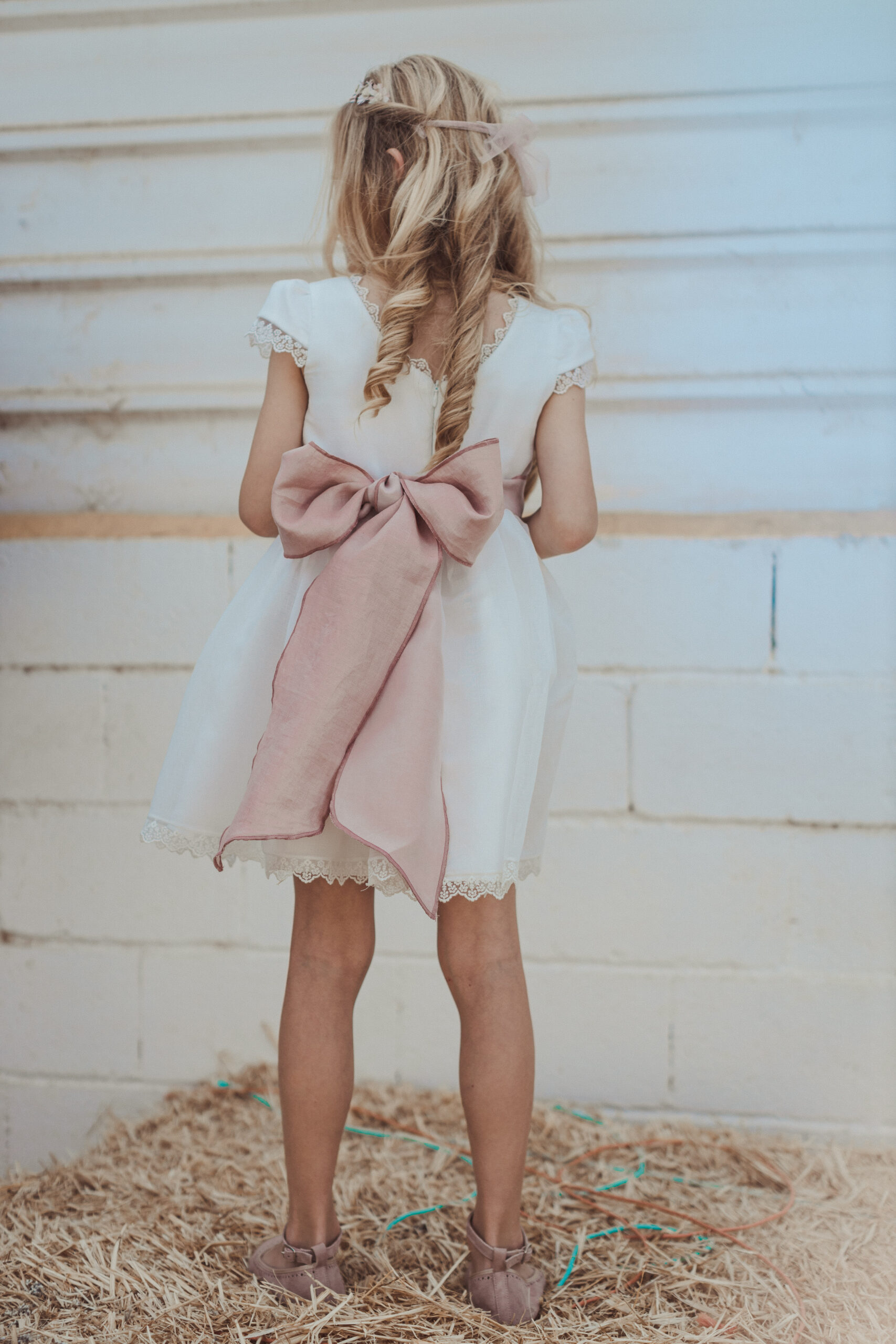 Vestido de ceremonia de manga corta en organza blanco roto. El fajín es de color rosa maquillaje, compuesto por lino y organza, decorado por unas bonitas puntillas. La falda fruncida de organza, con remate de la misma puntilla. Lazada trasera en lino con organza blanco roto..