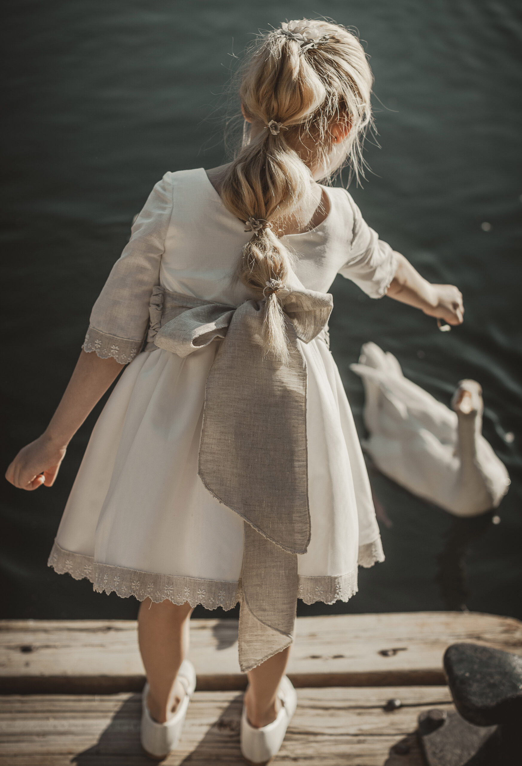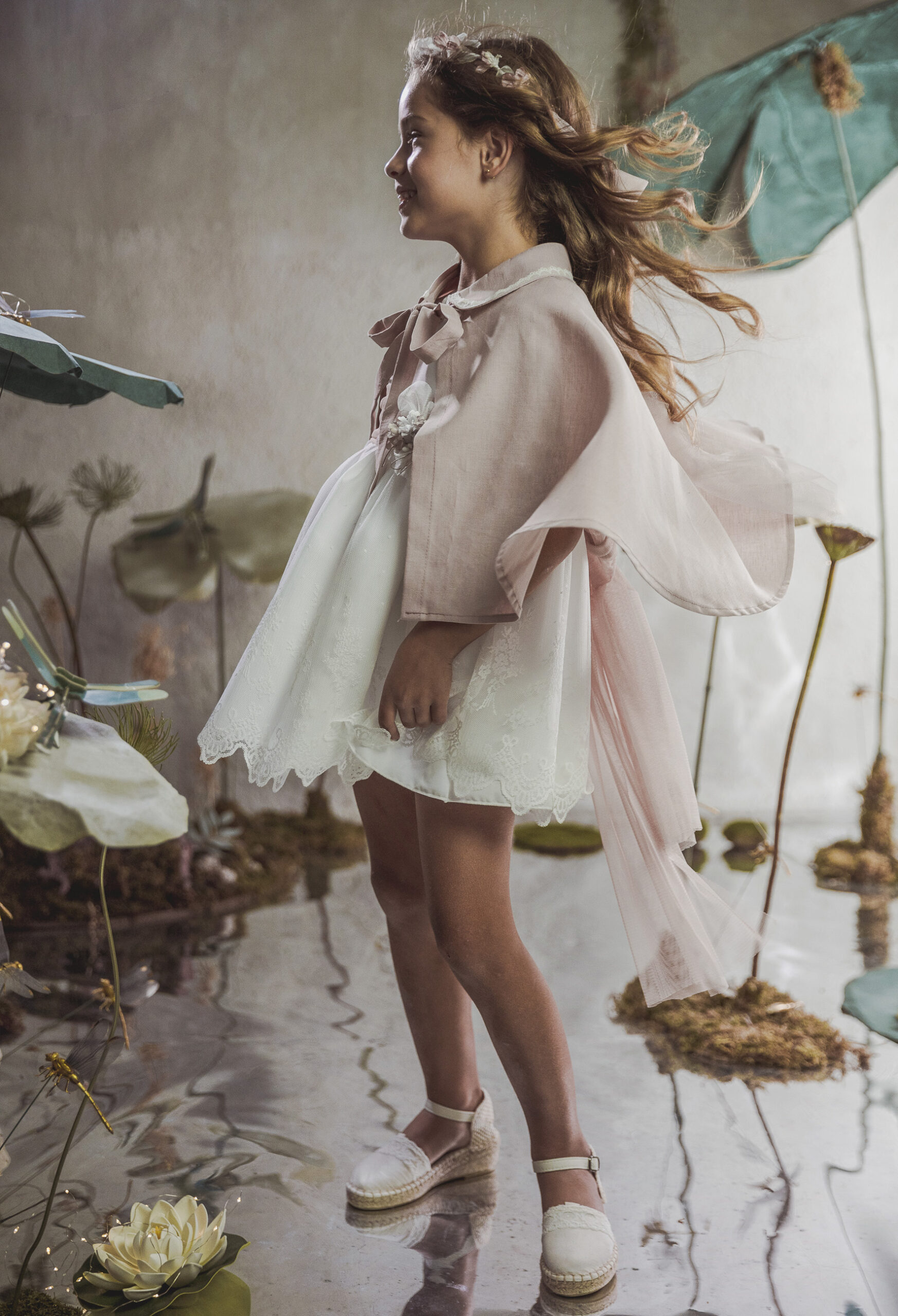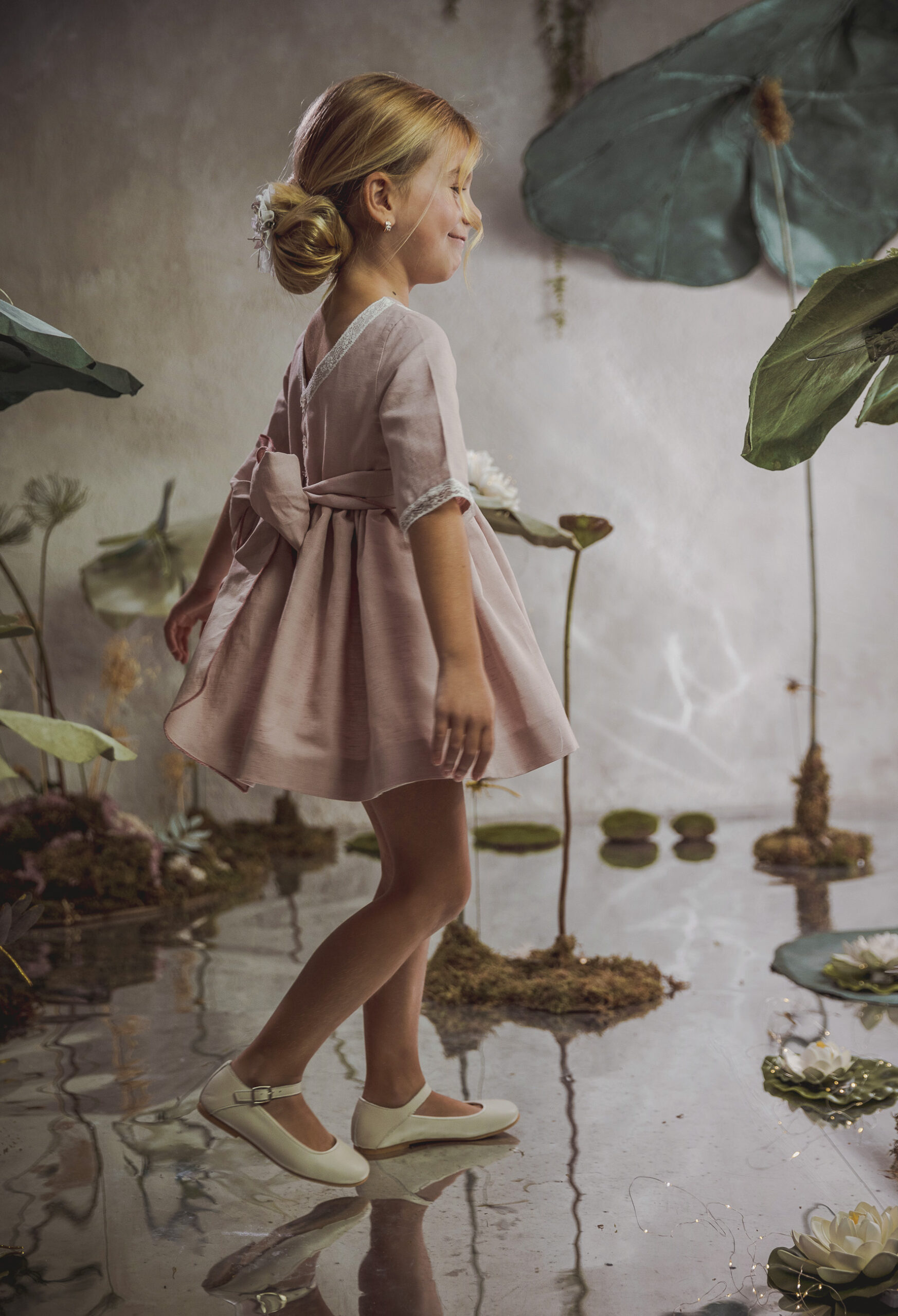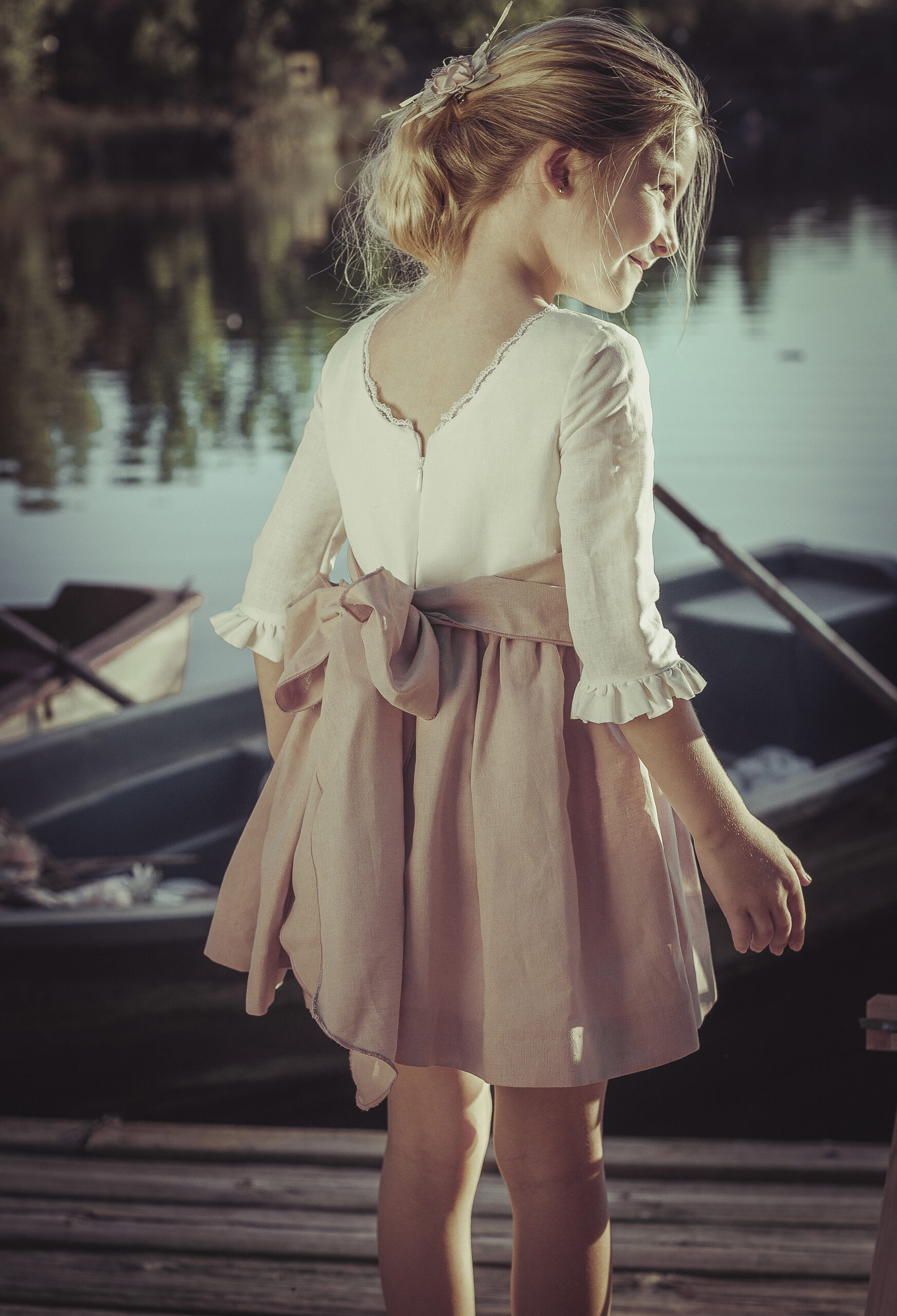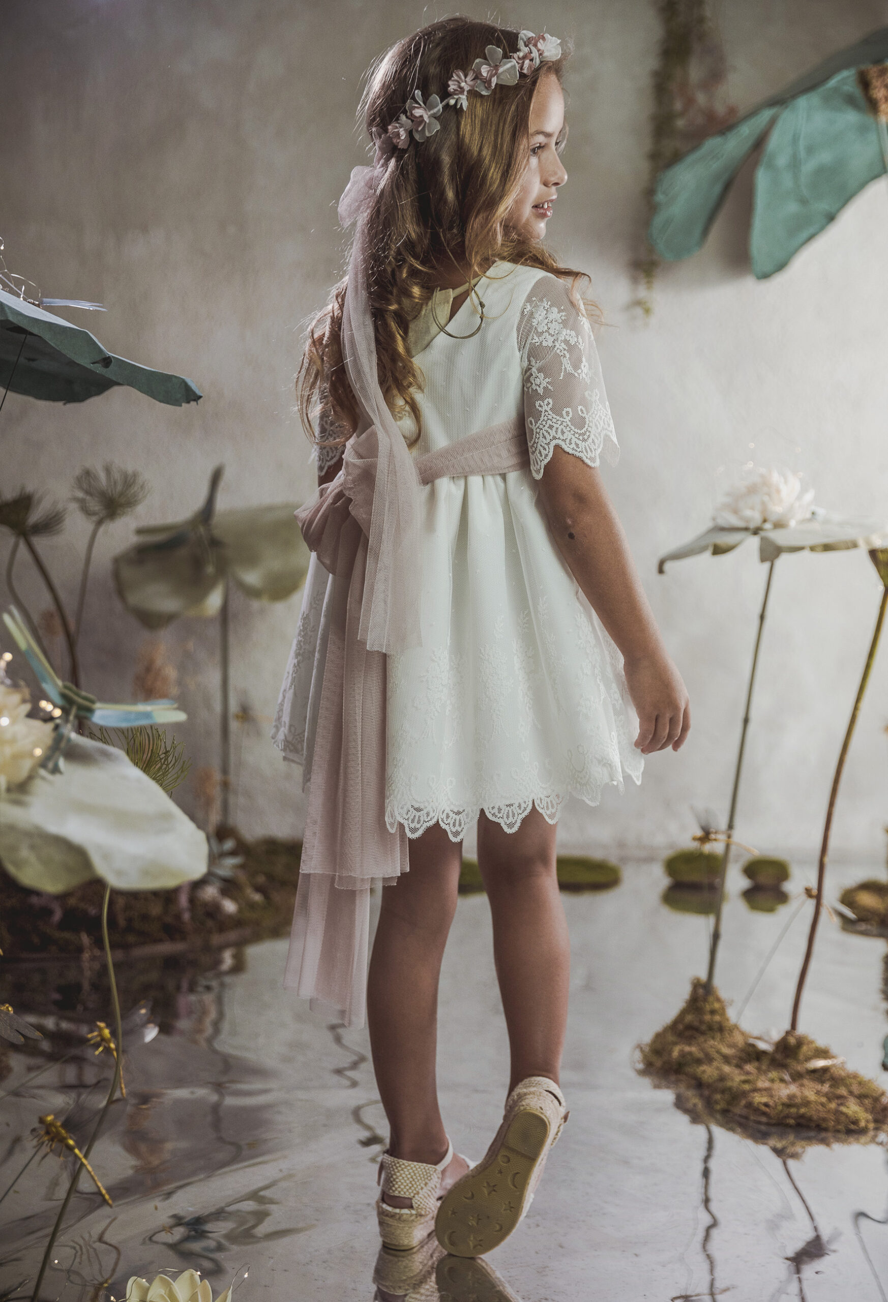 Vestido de ceremonia de manga corta en organza blanco roto. El fajín es de color rosa maquillaje, compuesto por lino y organza, decorado por unas bonitas puntillas. La falda fruncida de organza, con remate de la misma puntilla. Lazada trasera en lino con organza blanco roto..