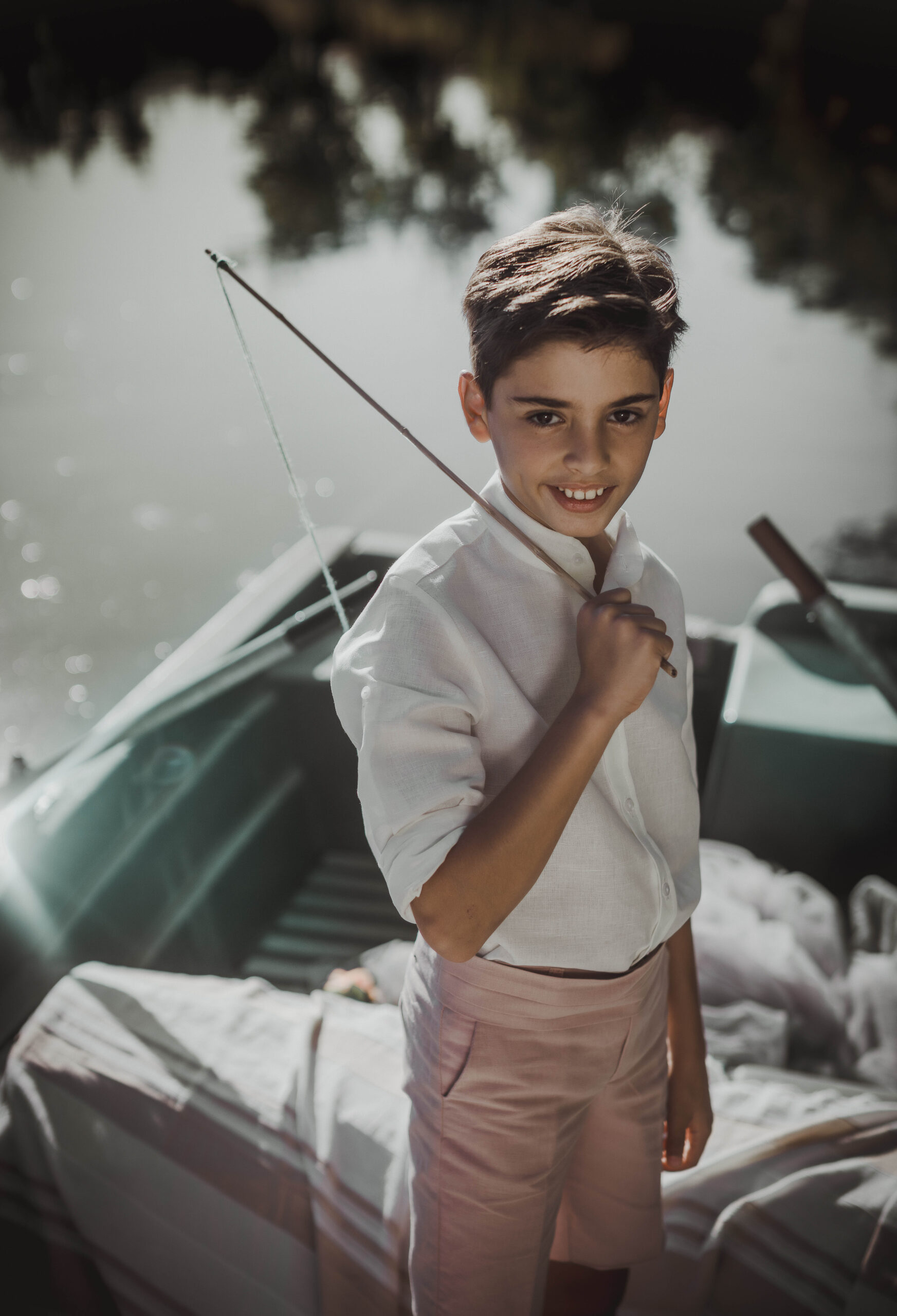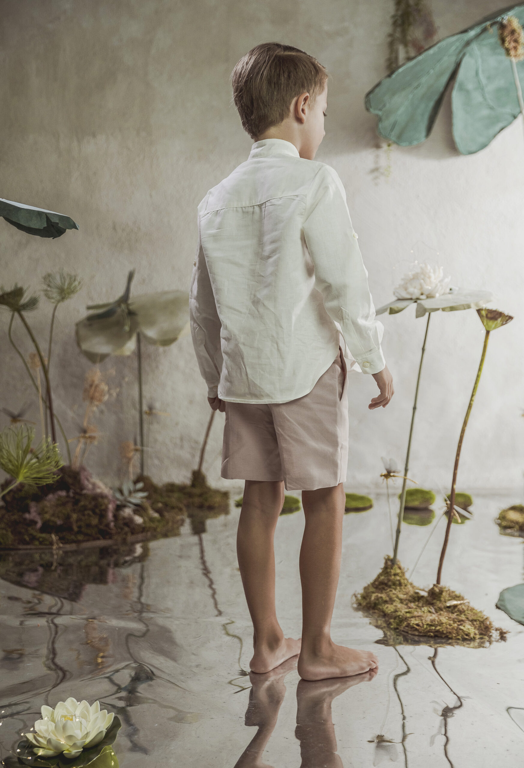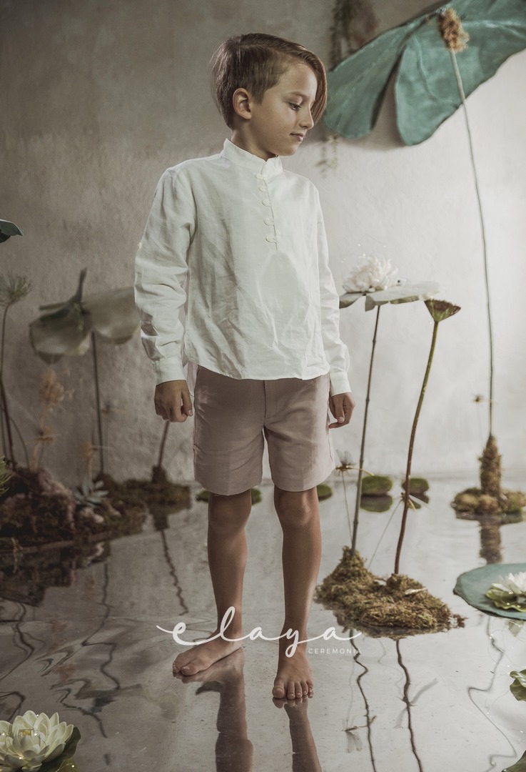 Conjunto de lino niño. Camisa de cuello mao en lino crudo y pantalón y fajín de jaretas de lino rosa maquillaje.
