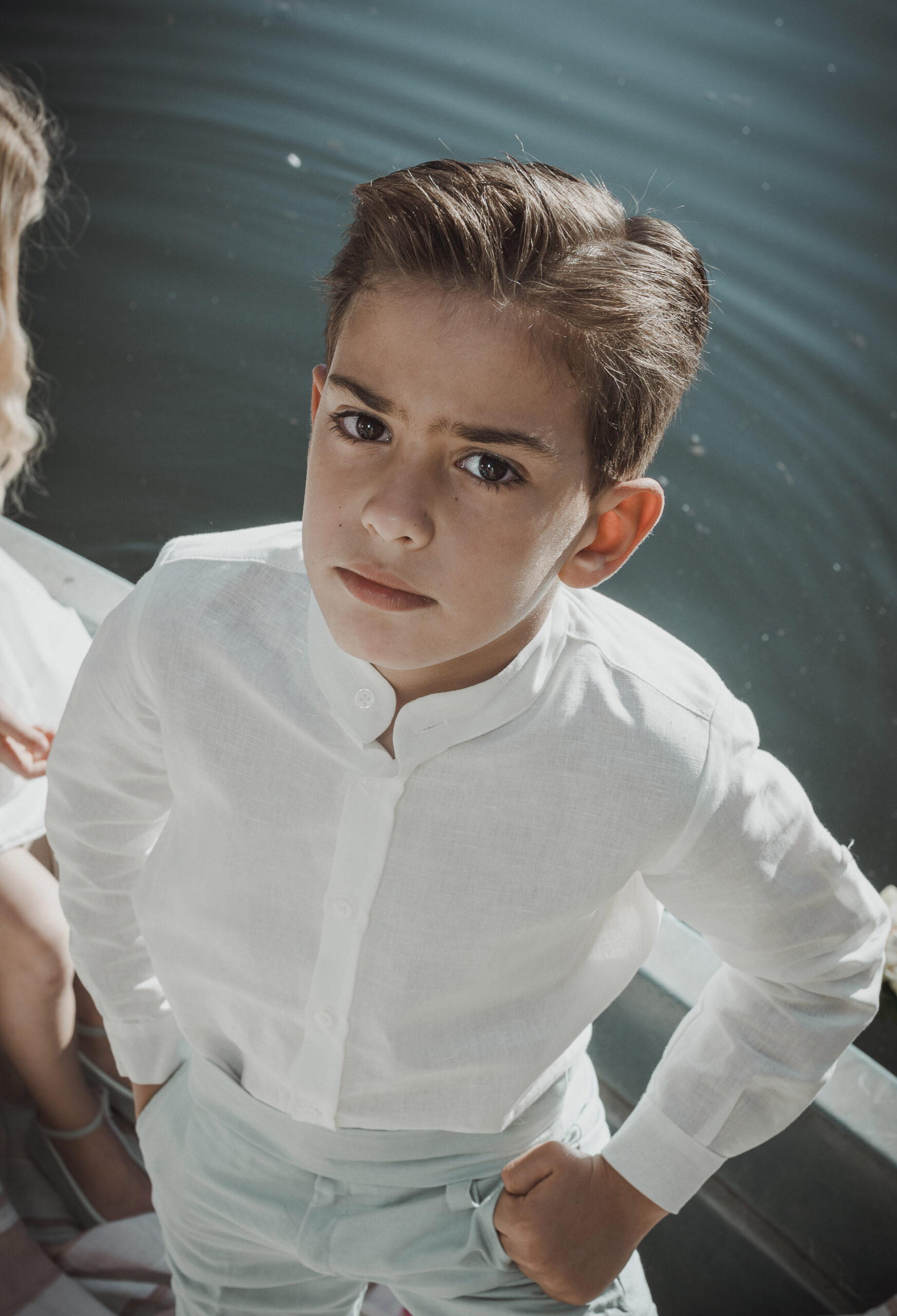 Conjunto de lino niño. Camisa de cuello mao en lino crudo y pantalón y fajín de jaretas de lino verde agua.