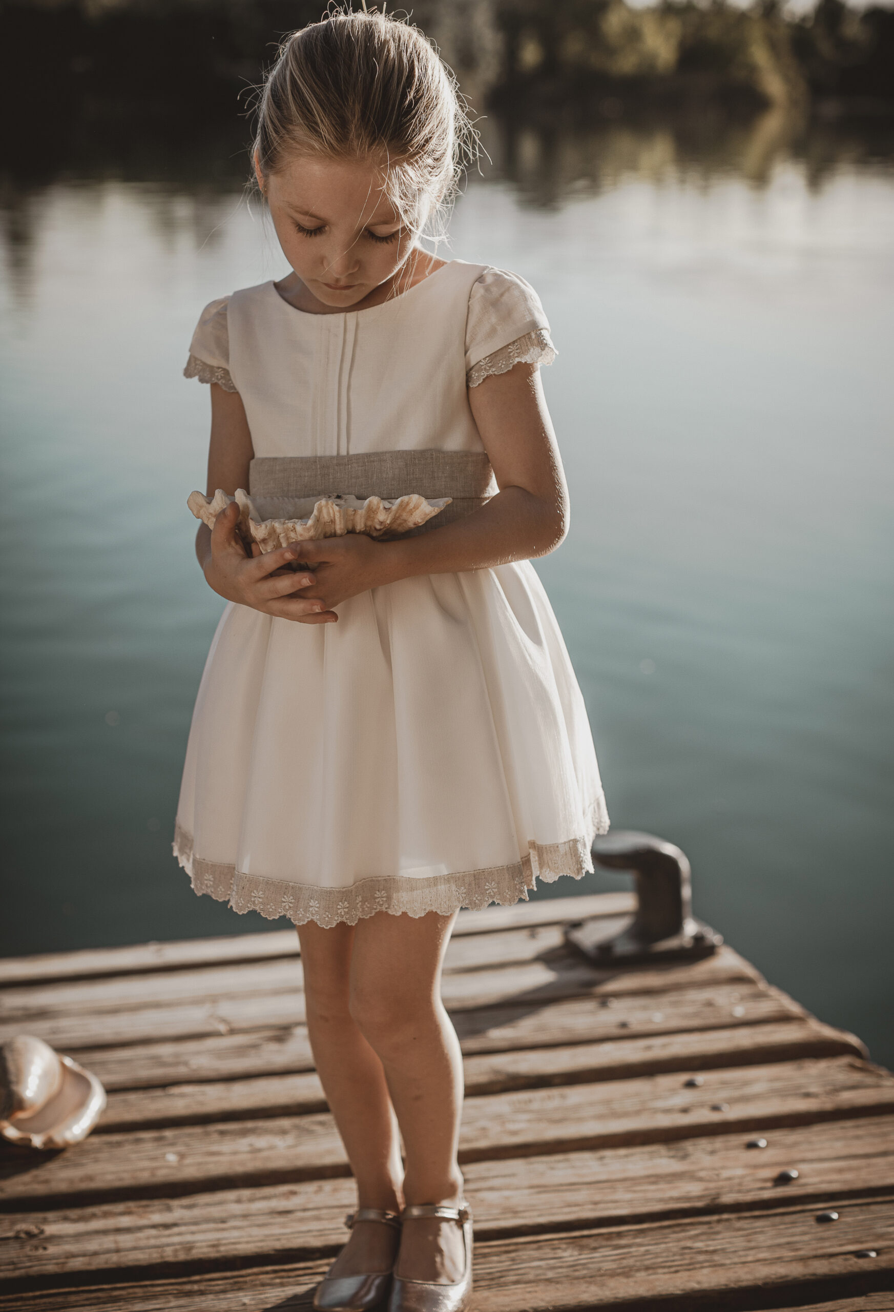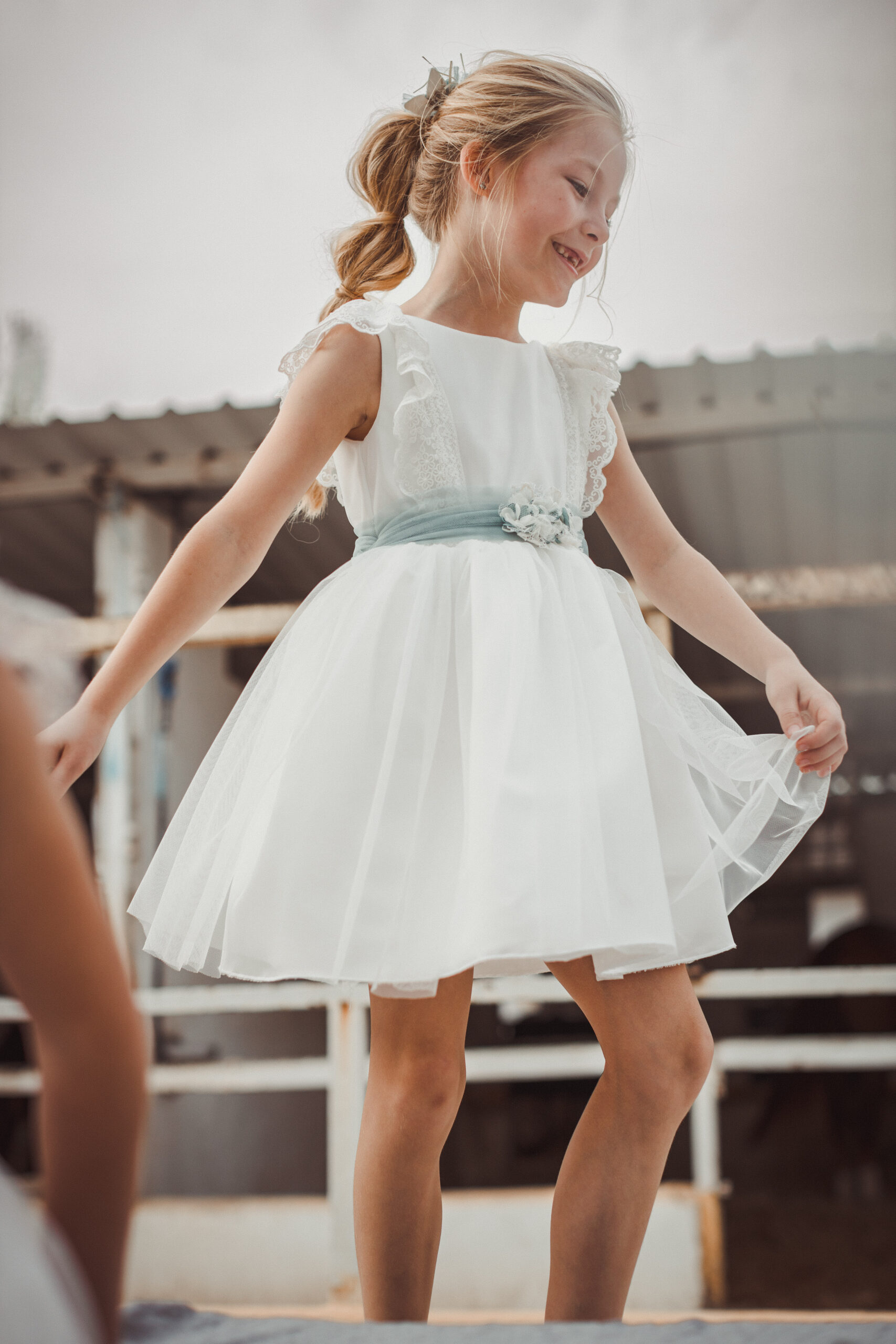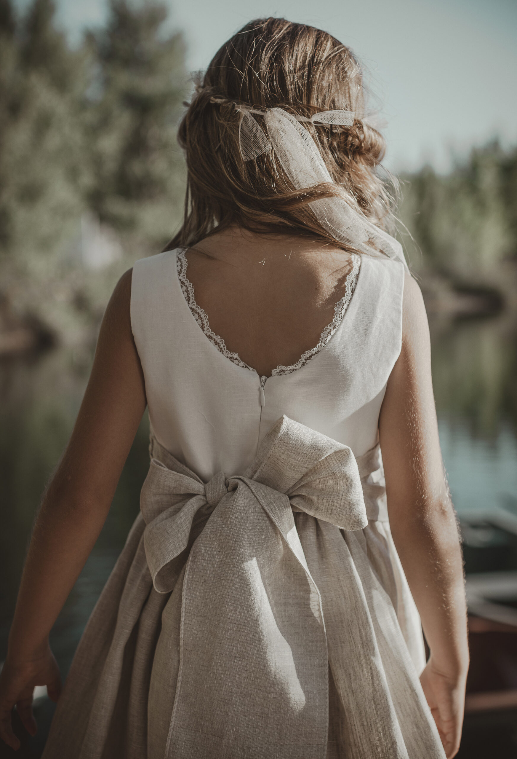 Vestido de ceremonia en tul blanco roto y fajín tostado. Es de corte a la cintura de manga francesa. Todo de color blanco roto, con unas bonitas puntillas en tostado en la manga y terminación de la falda. El fajín es de lino en tostado. La espalda lleva escote a pico redondeado.