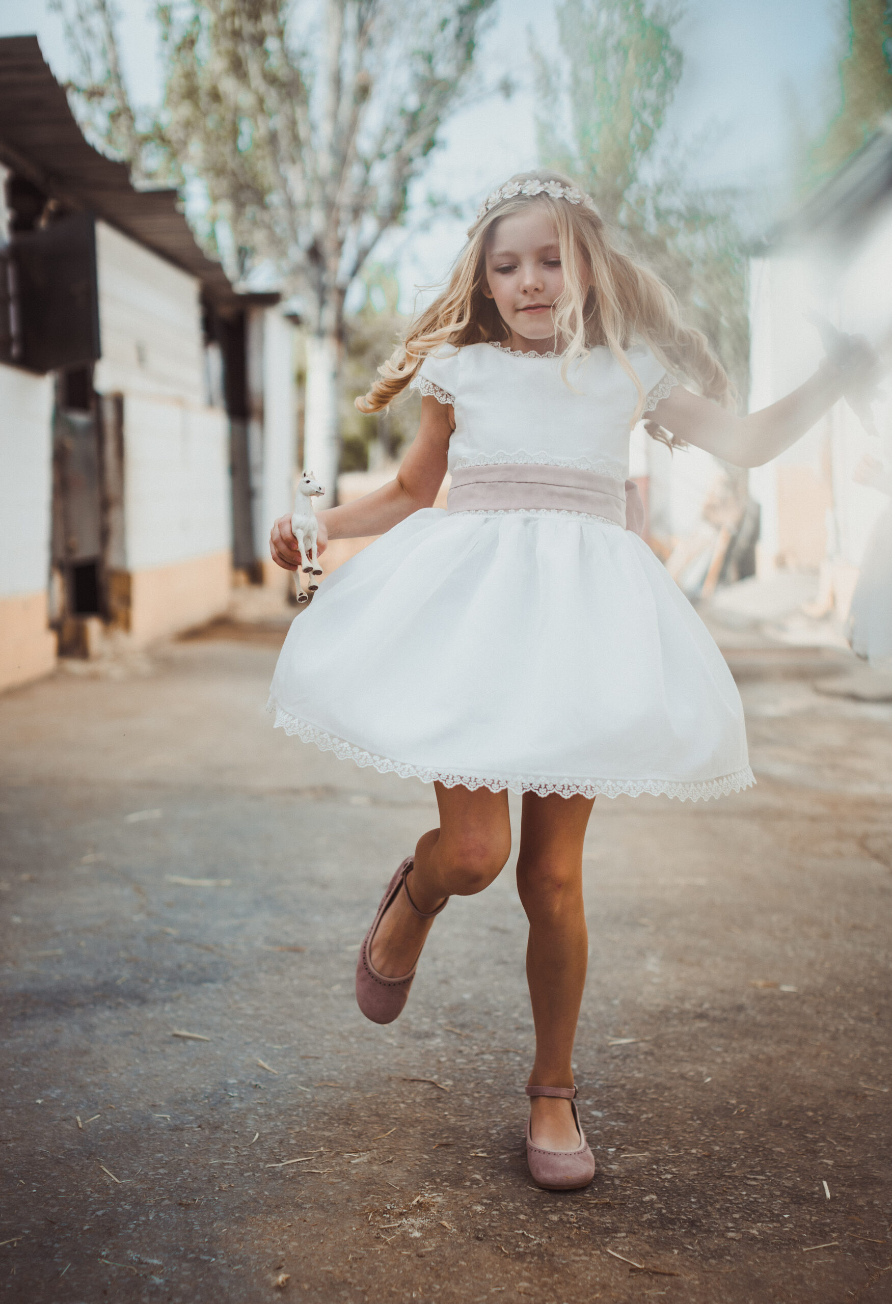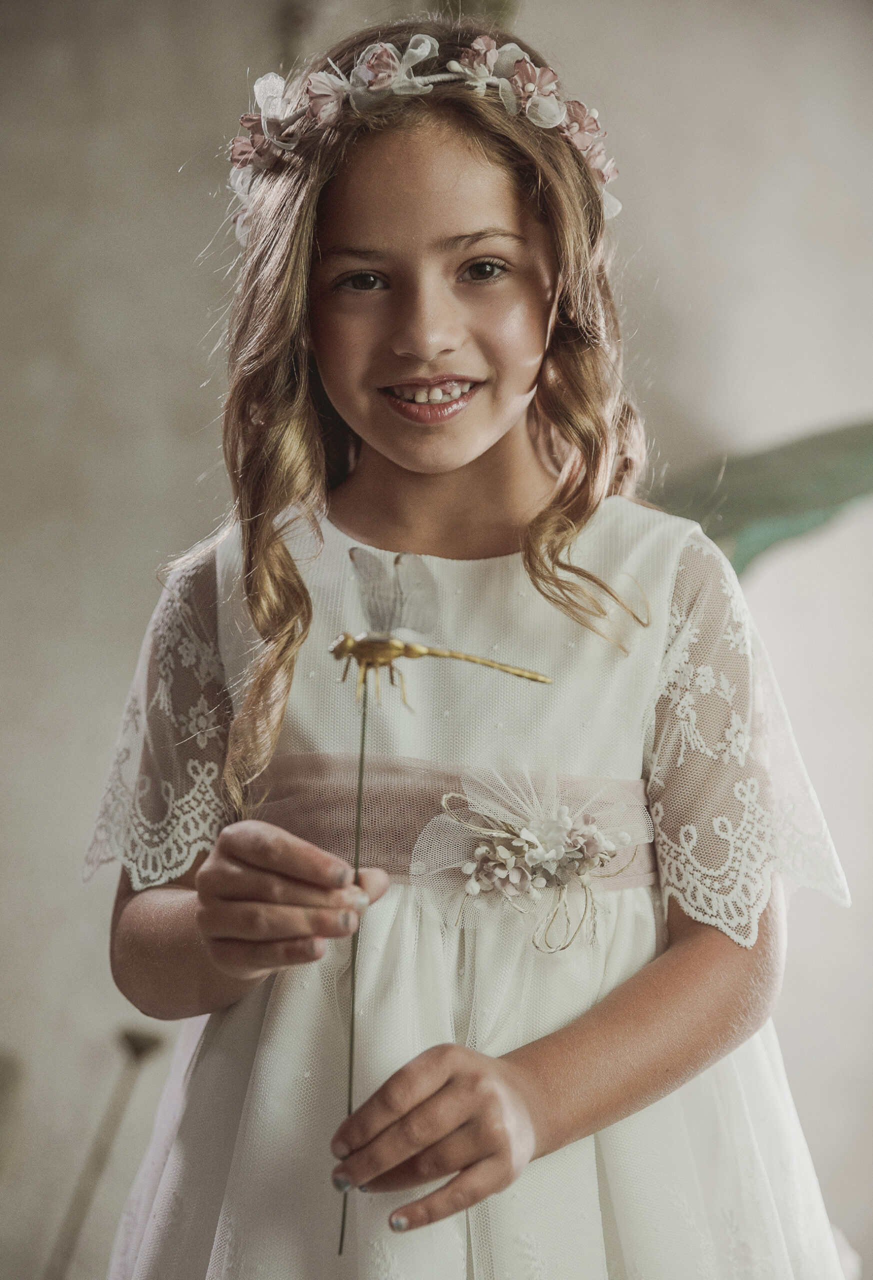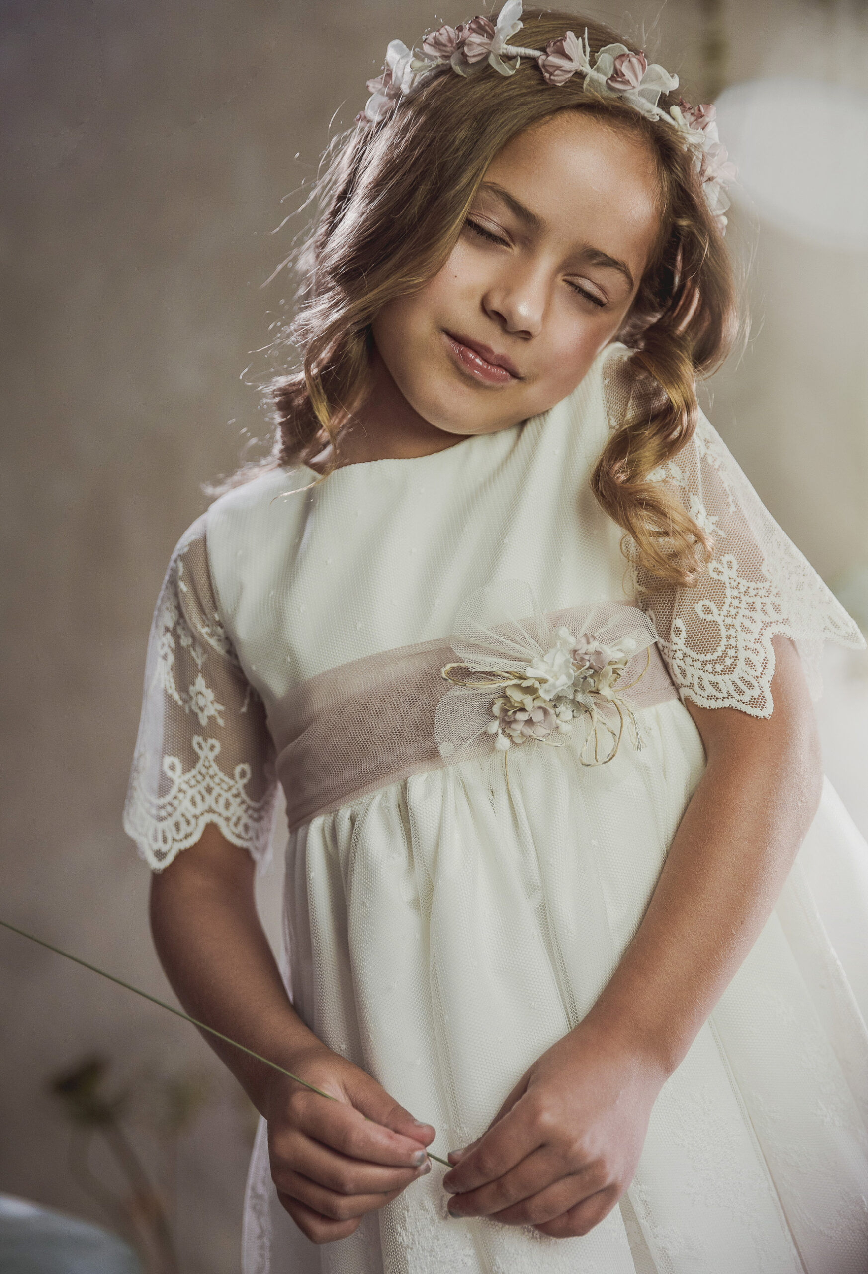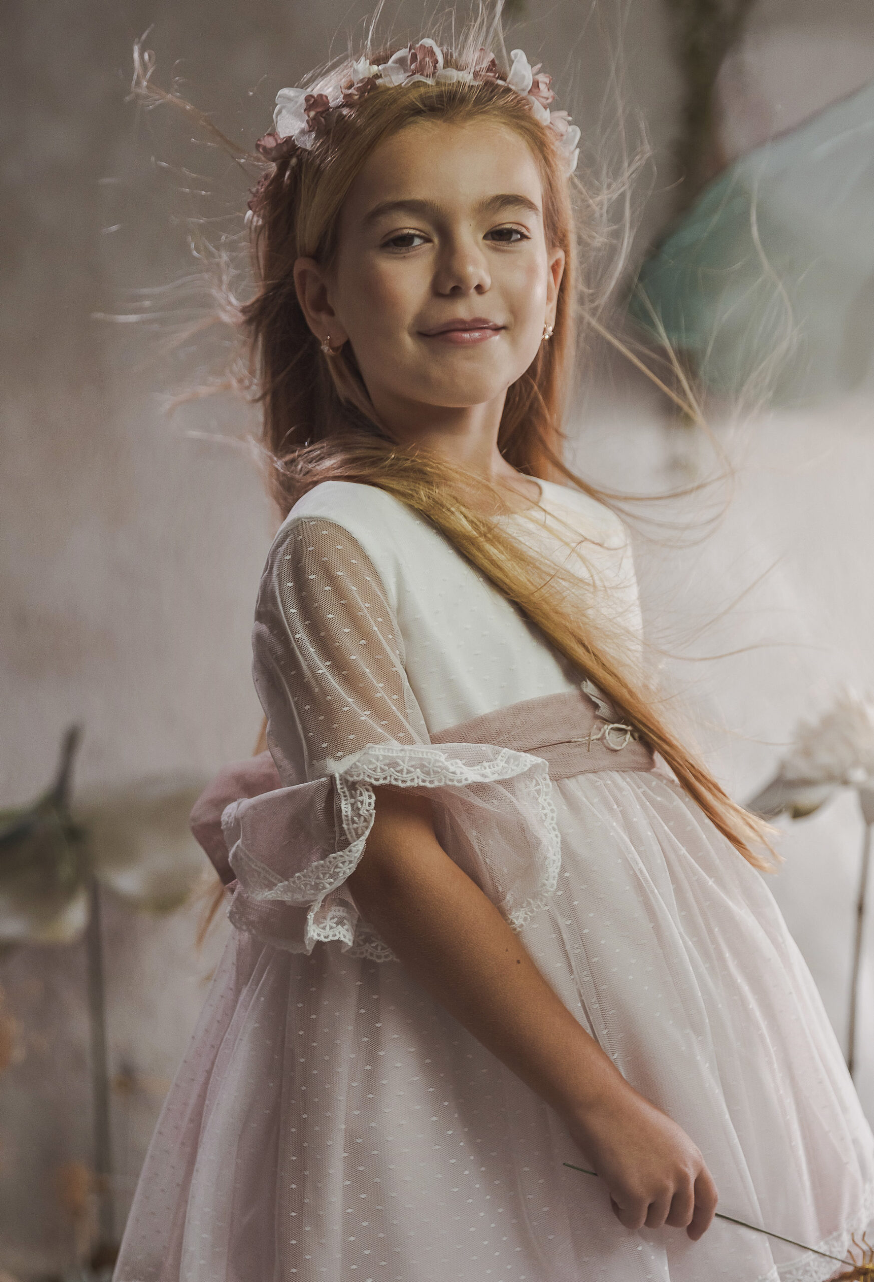 Vestido de ceremonia en tul dibujo. Todo es en blanco roto y el fajín es en tono rosa. La manga es francesa y el fajín en tul rosa. La espalda lleva escote a pico.