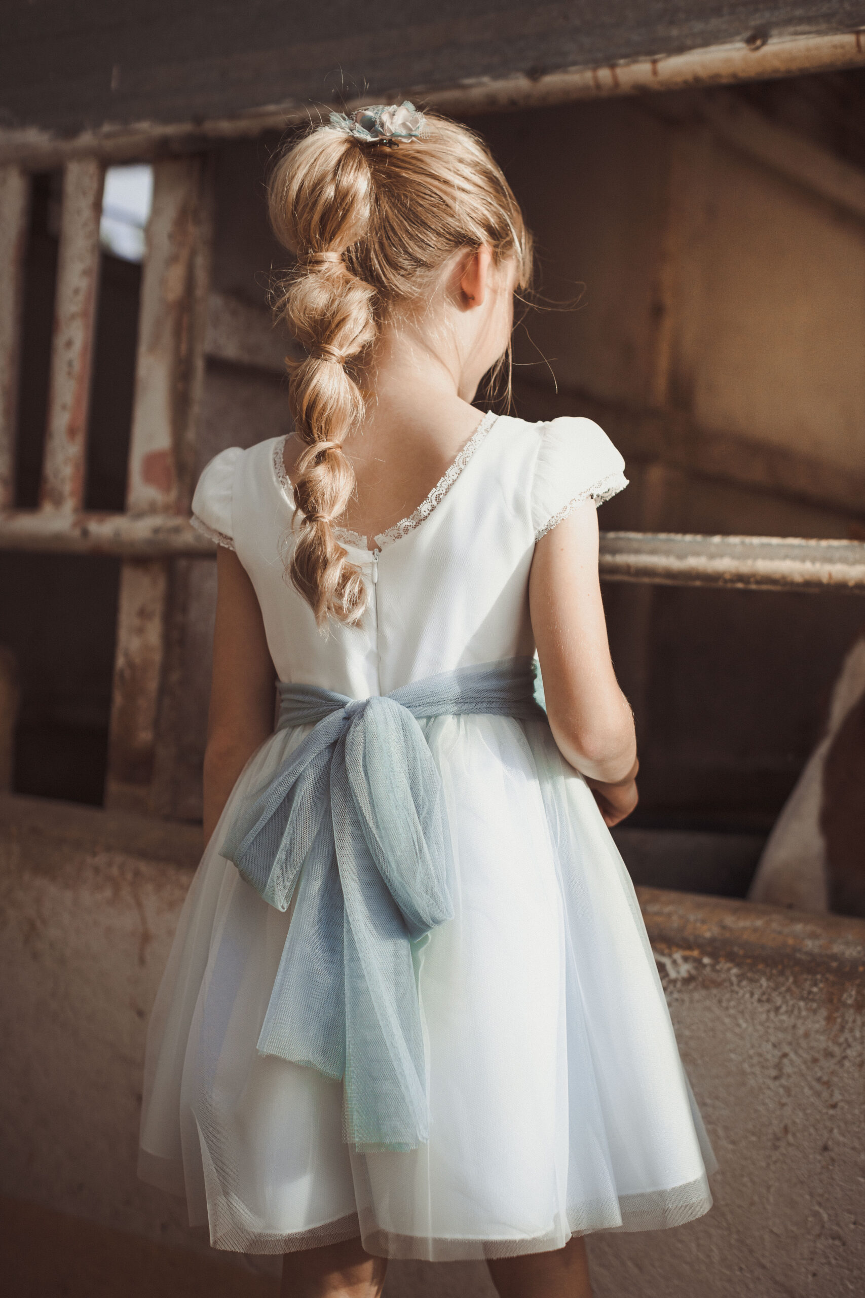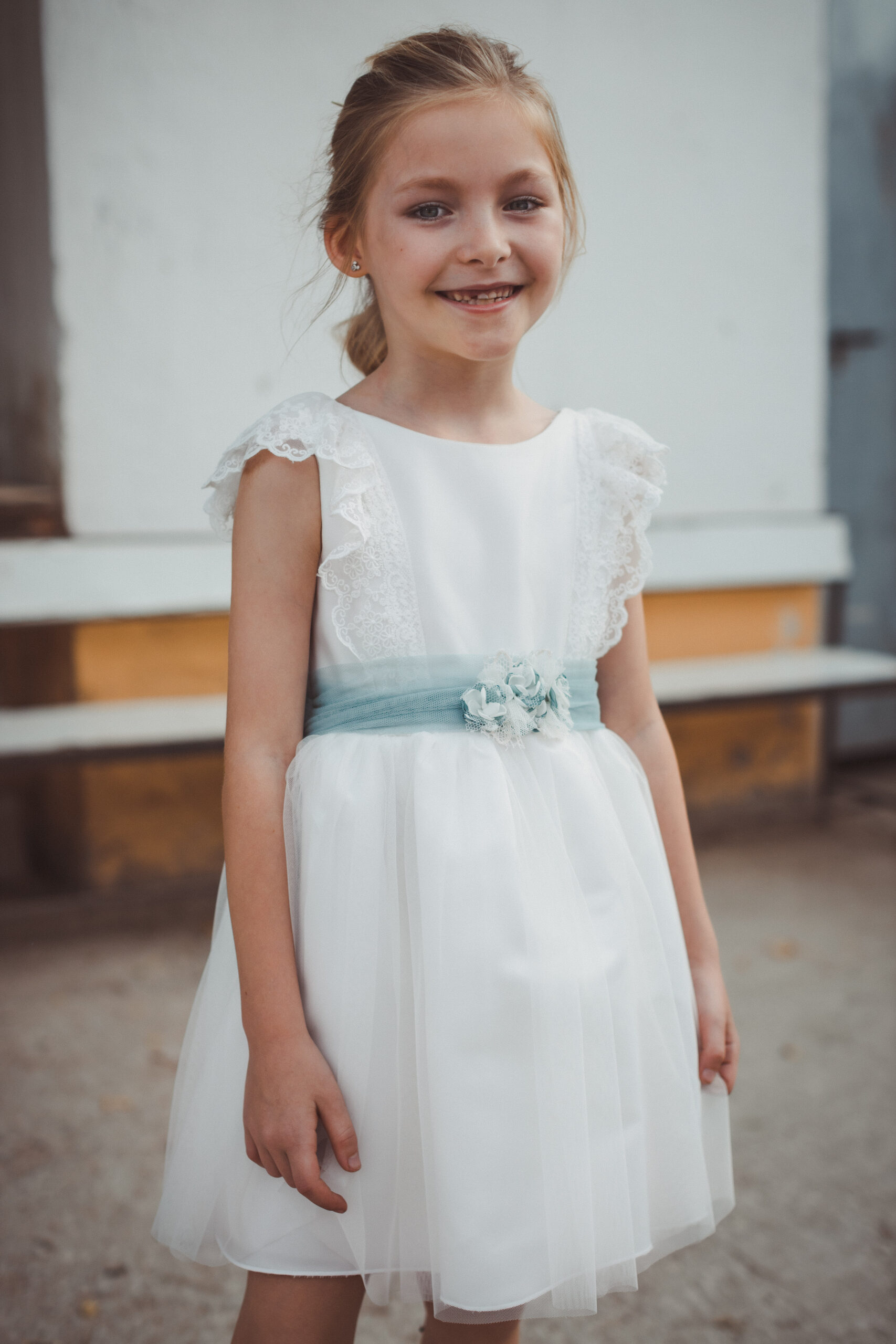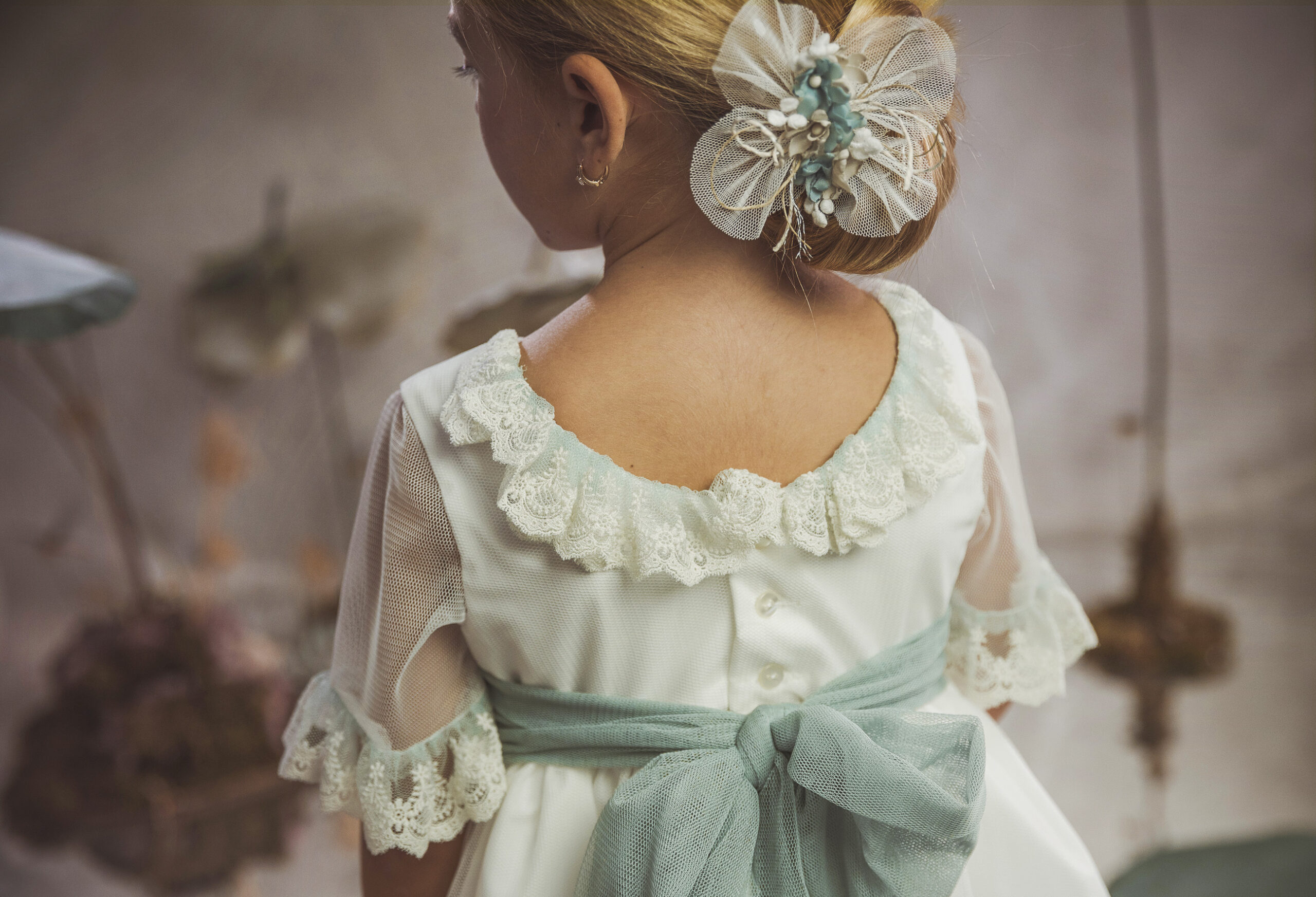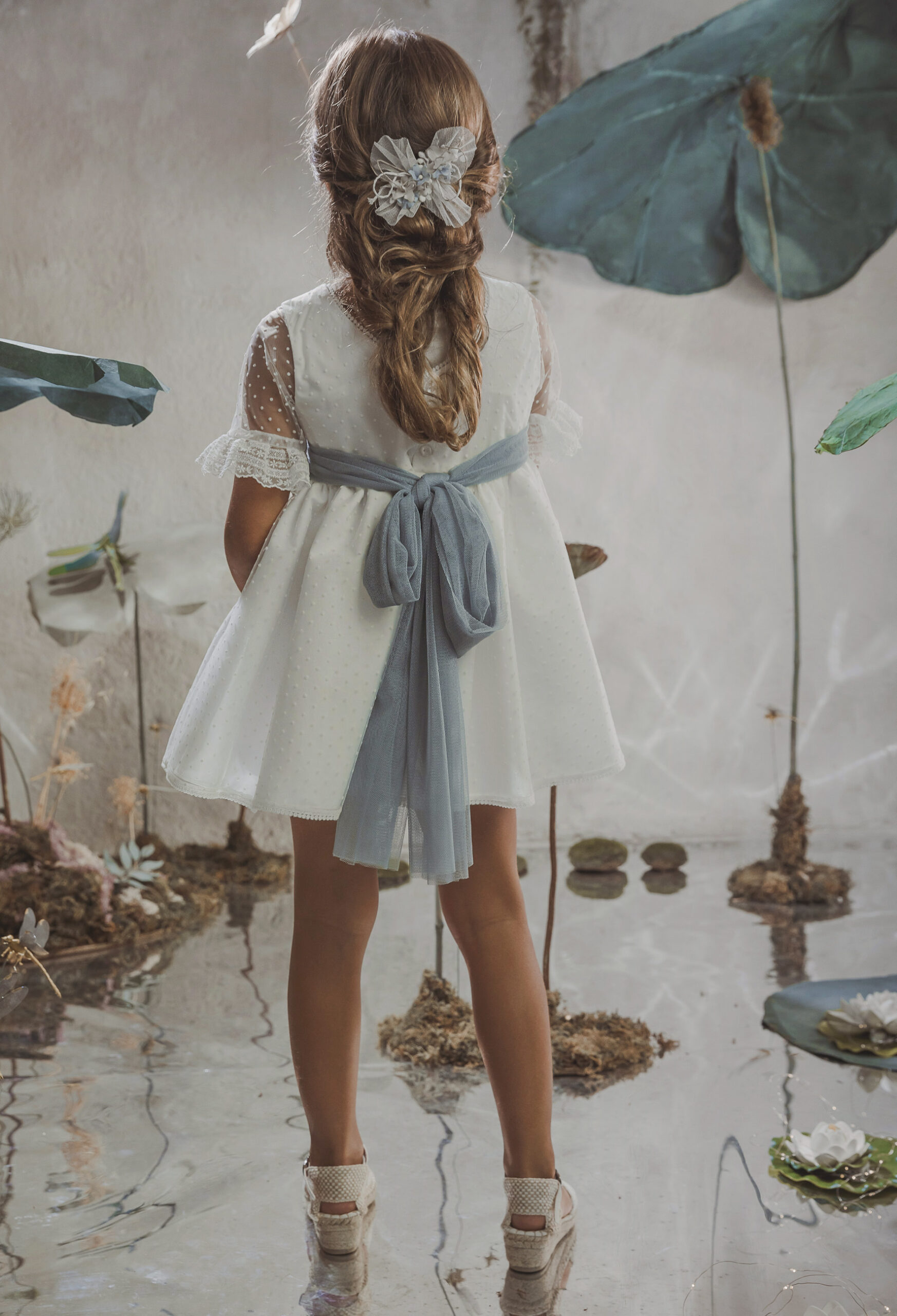 Vestido de ceremonia en tul motitas. Todo es en blanco roto y el fajín es en tono azula. La manga es francesa y el fajín en tul azul. La espalda lleva escote a pico.