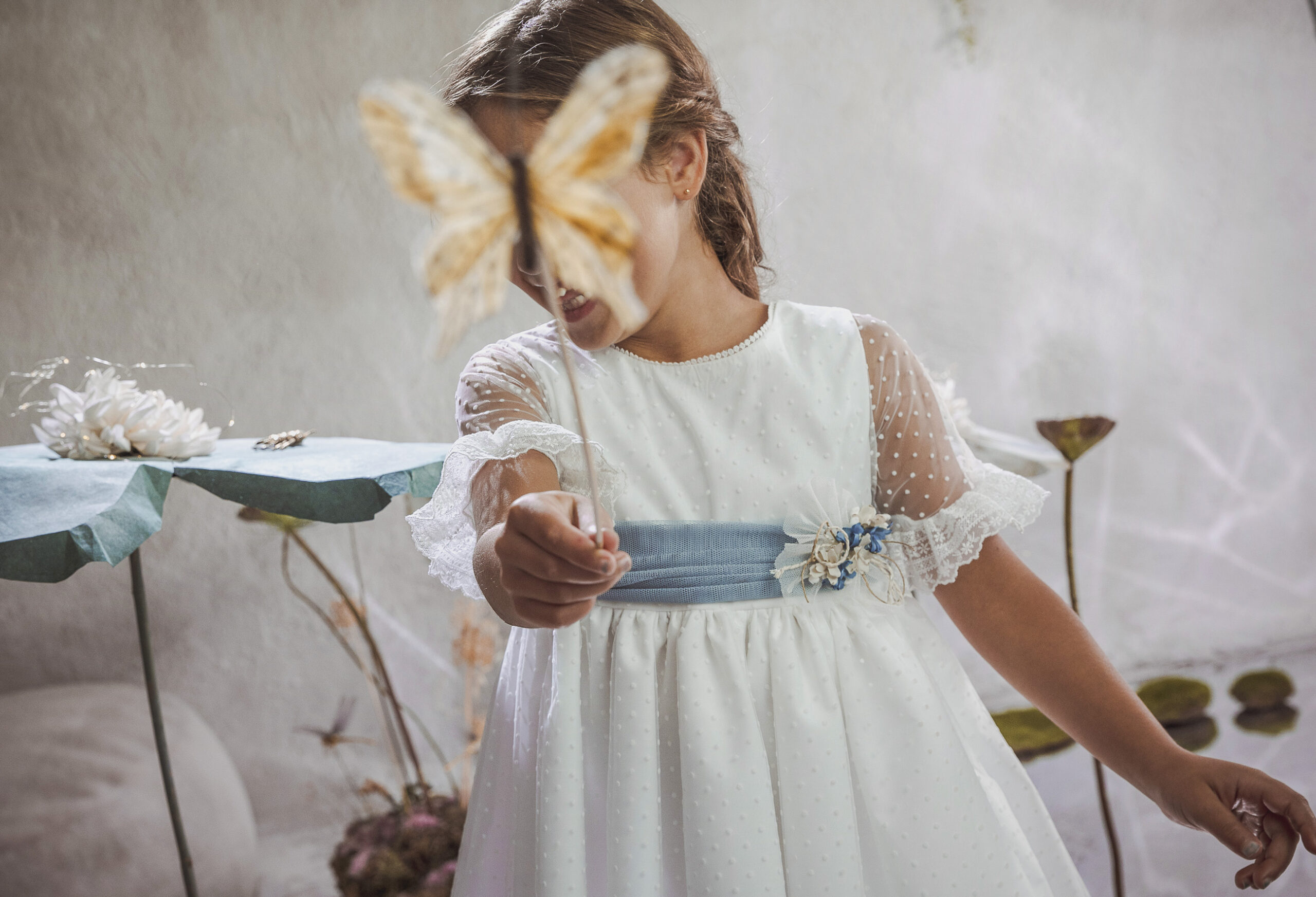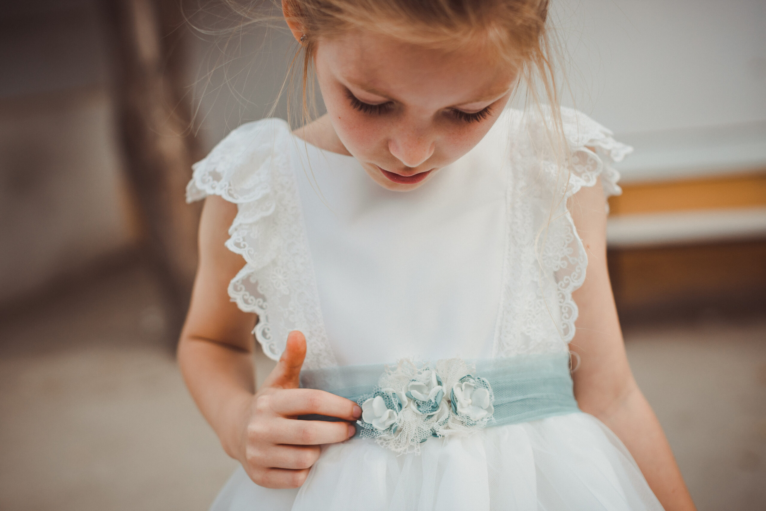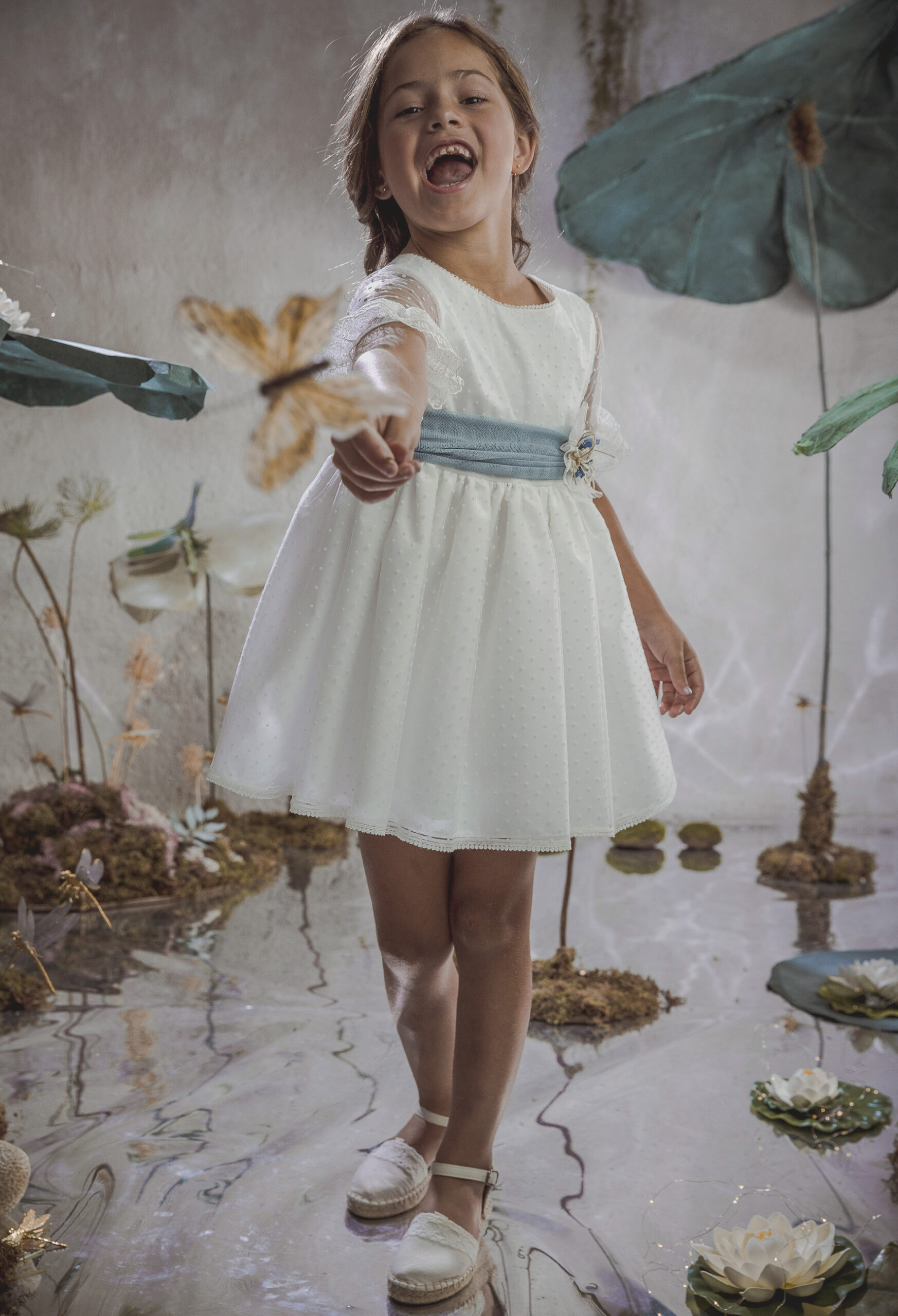 Vestido de ceremonia en tul motitas. Todo es en blanco roto y el fajín es en tono azula. La manga es francesa y el fajín en tul azul. La espalda lleva escote a pico.