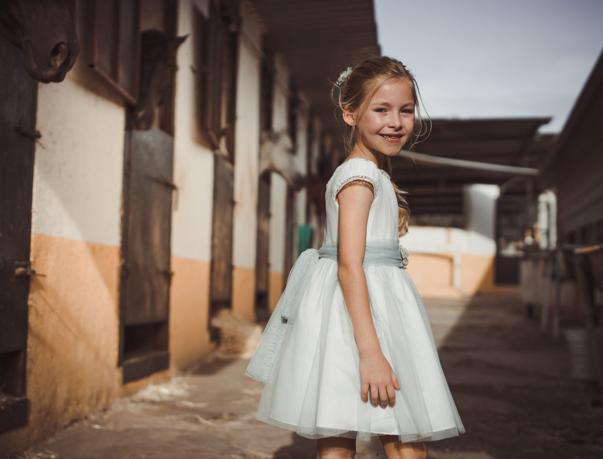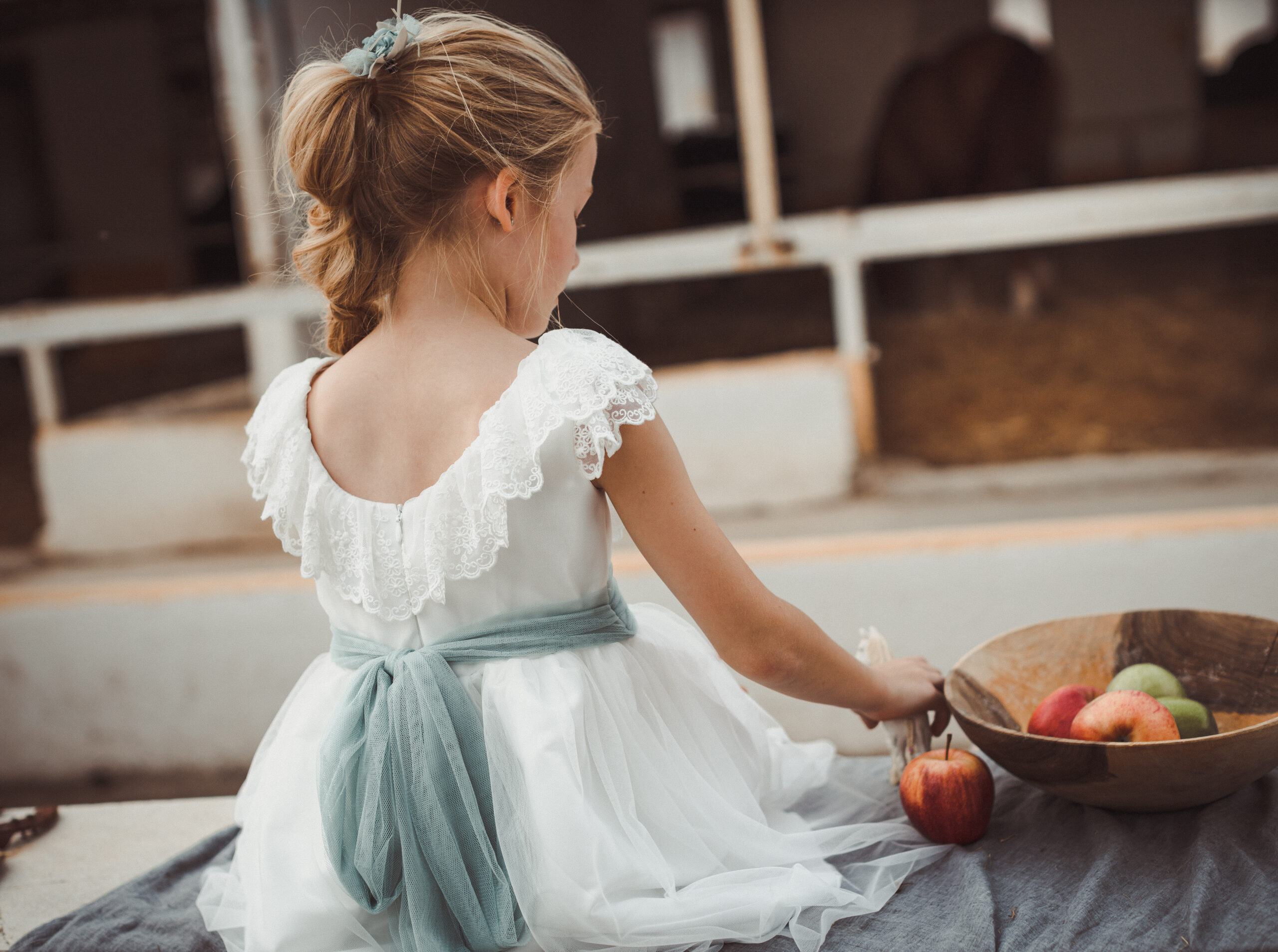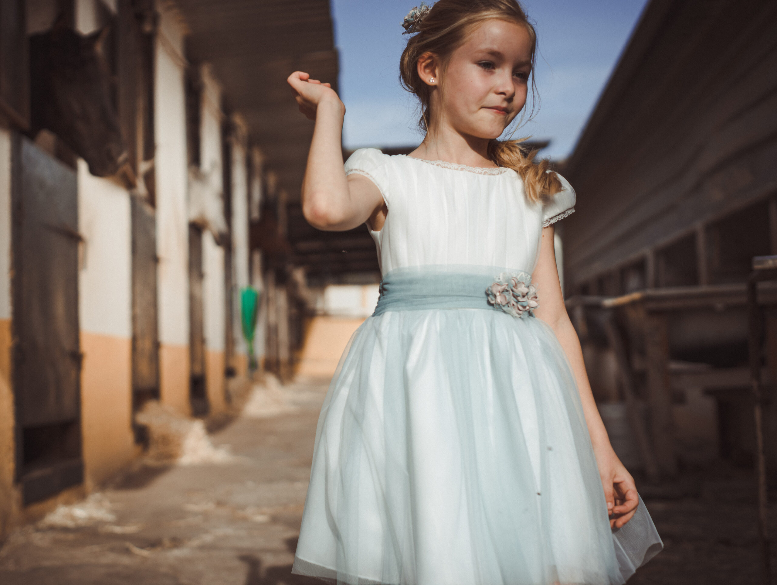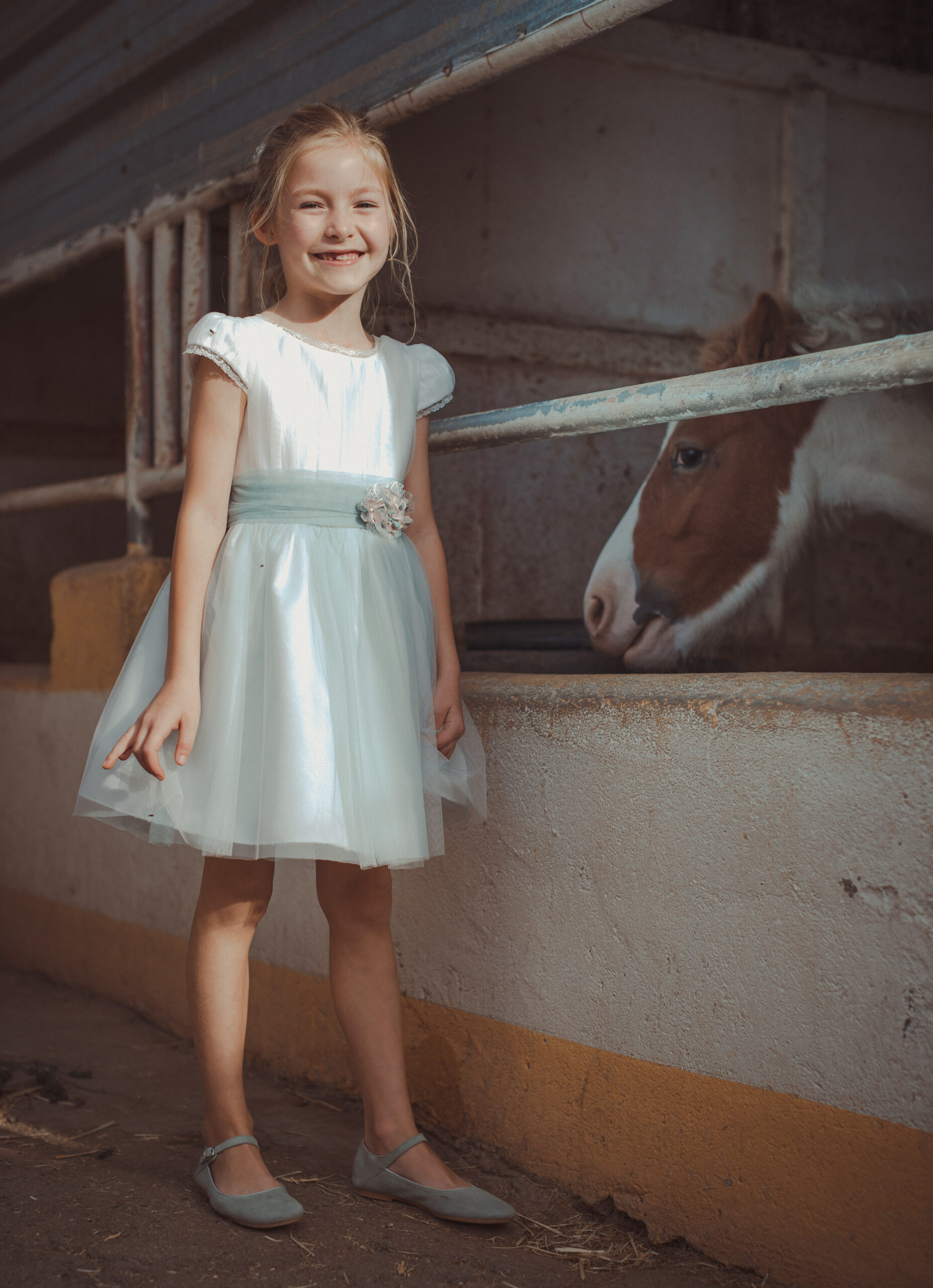 Vestido de ceremonia en tul motitas. Todo es en blanco roto y el fajín es en tono azula. La manga es francesa y el fajín en tul azul. La espalda lleva escote a pico.