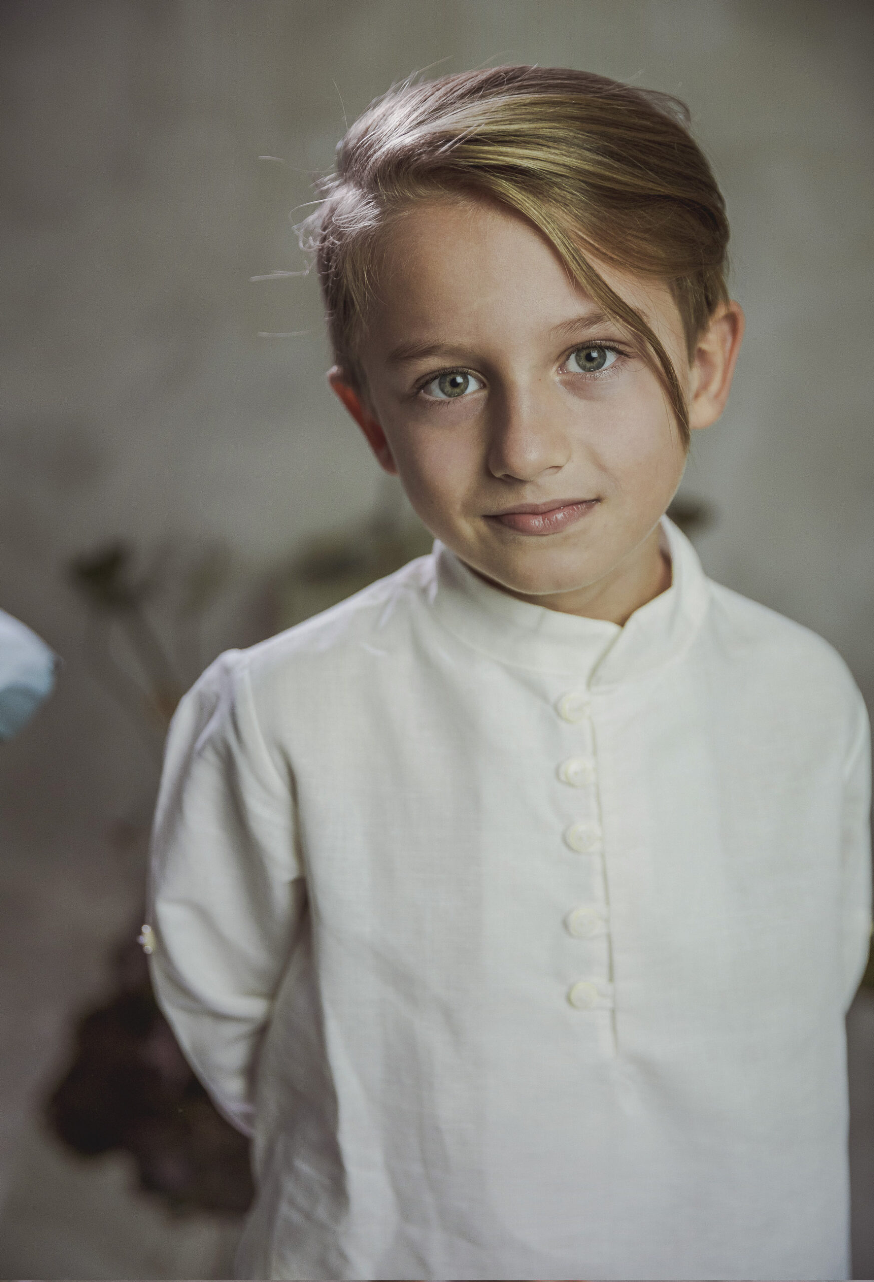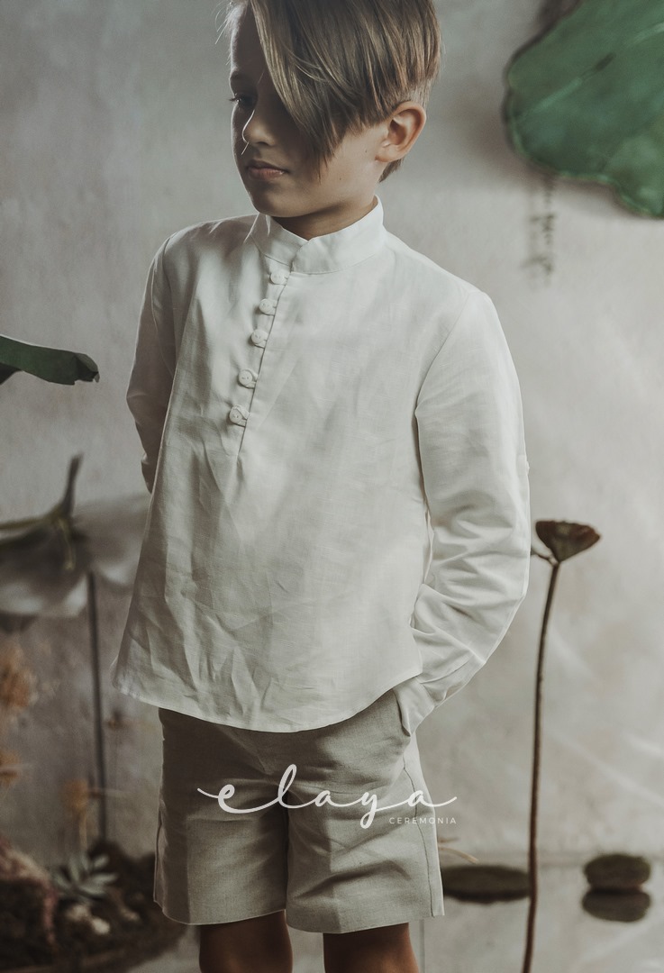 Conjunto de lino niño. Camisa de cuello mao tipo casaca en lino crudo y pantalón  de lino tostado