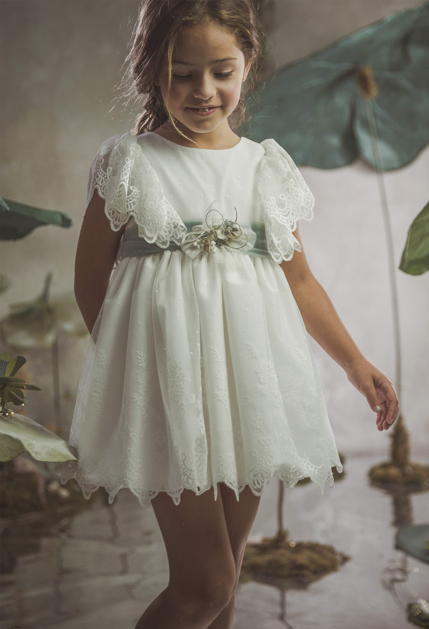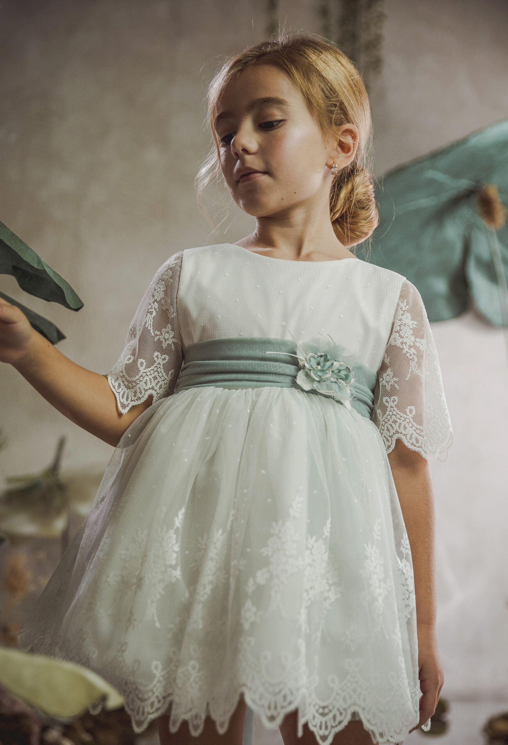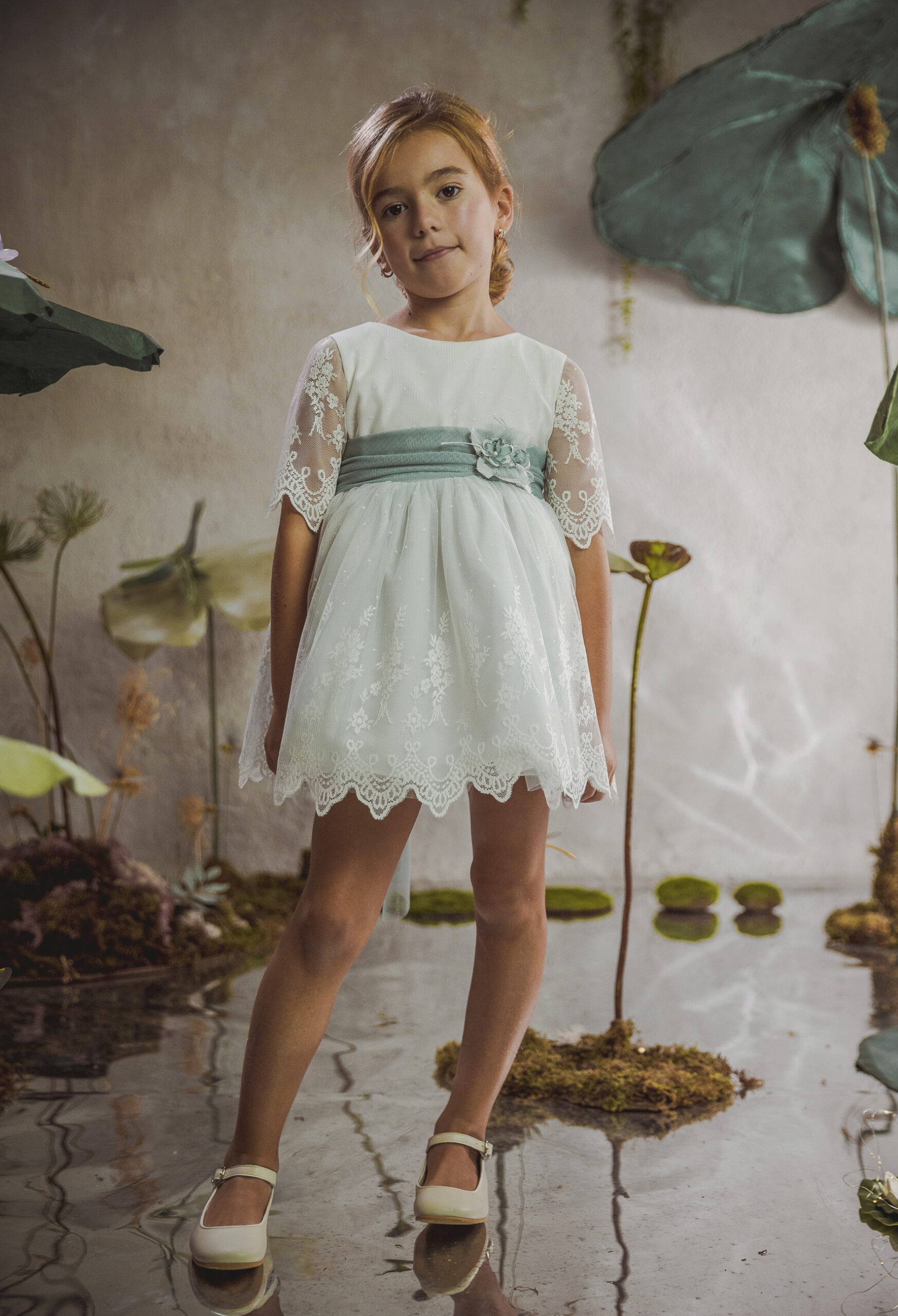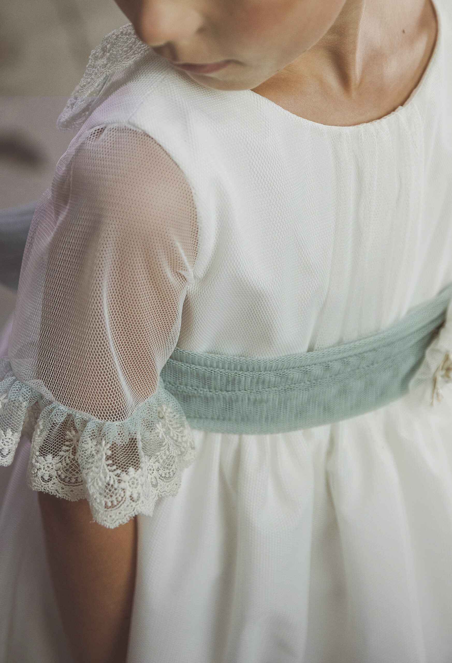 Vestido de ceremonia en tul liso. Lleva una manga de volante de puntilla, con cinturón en tul liso verde agua