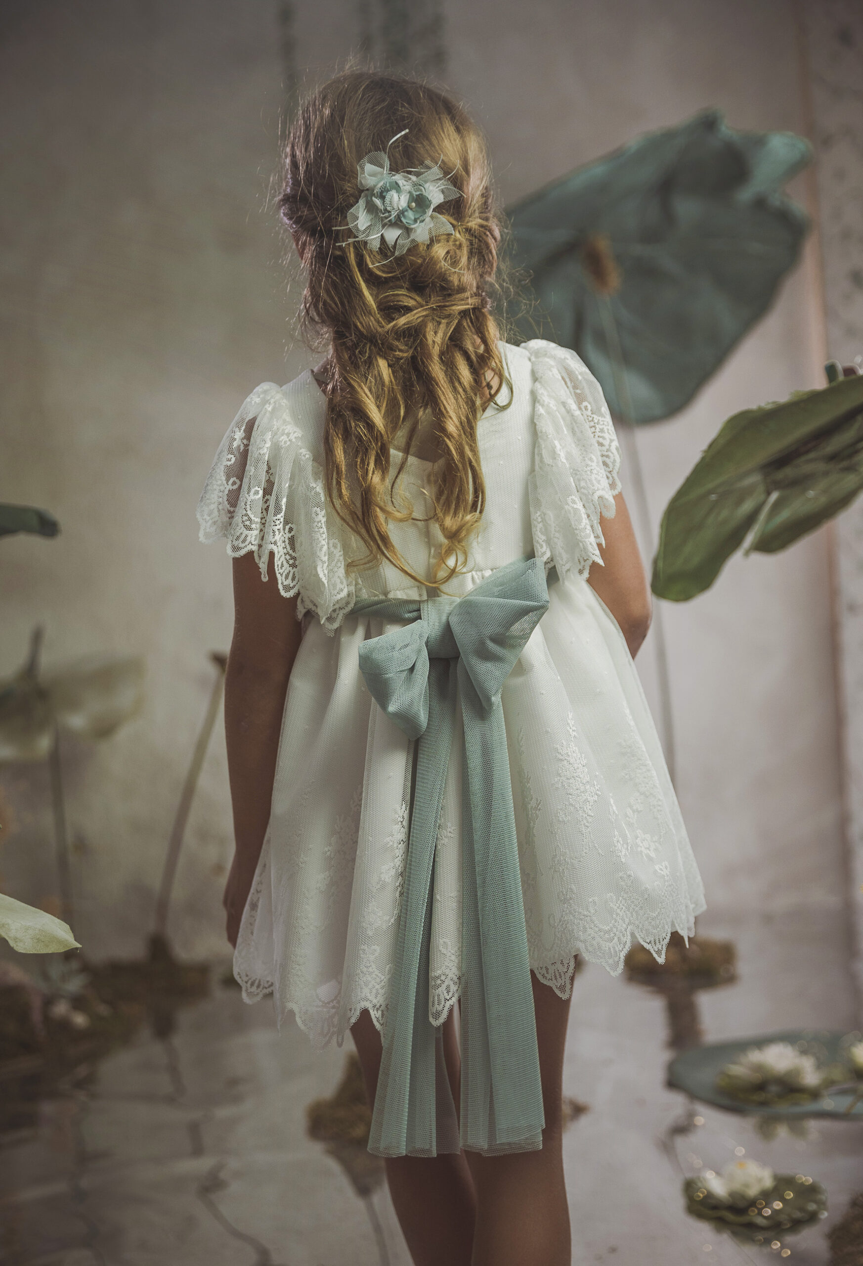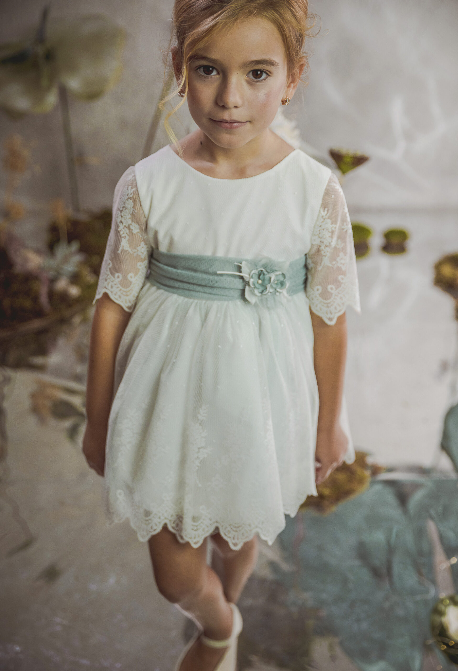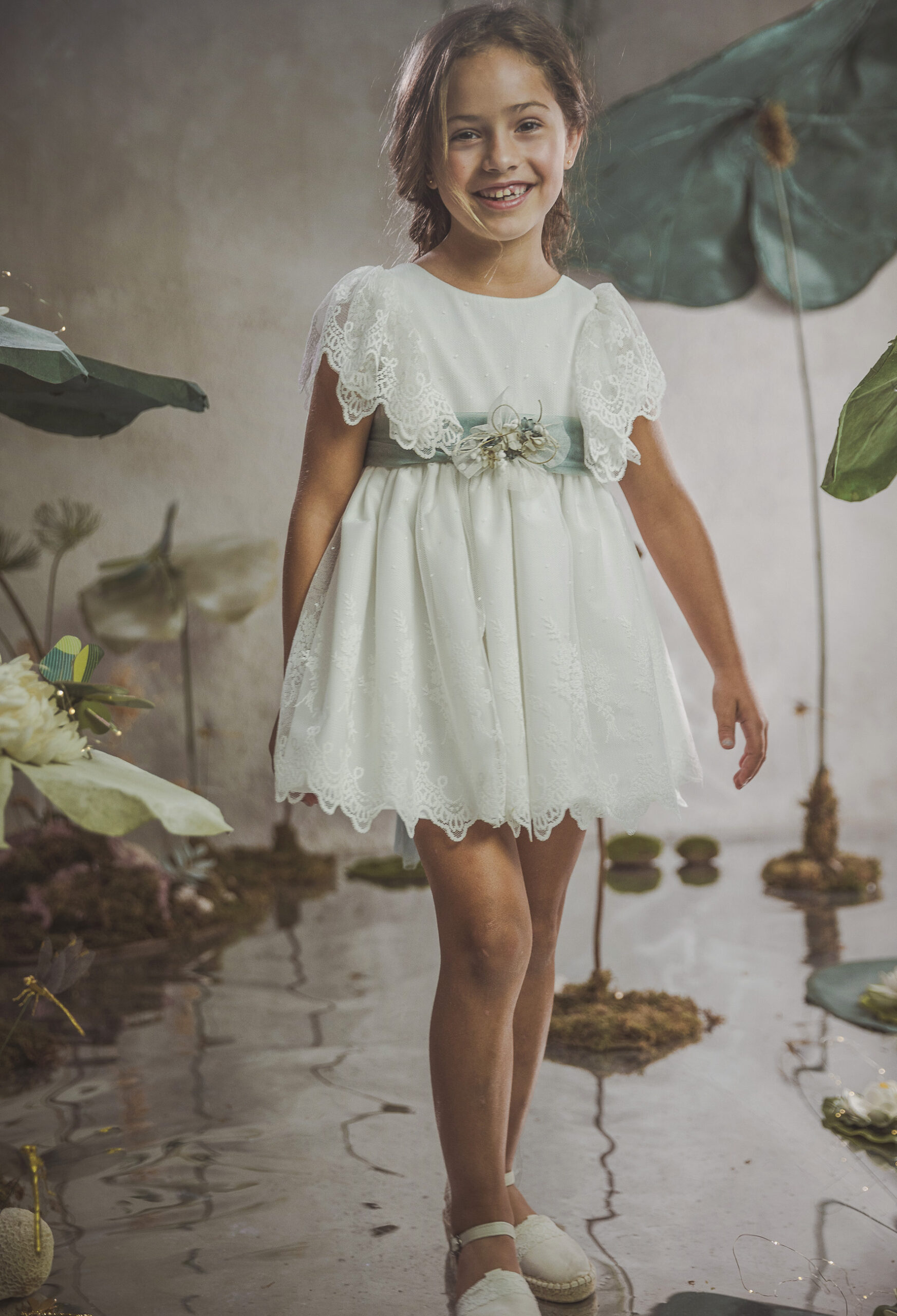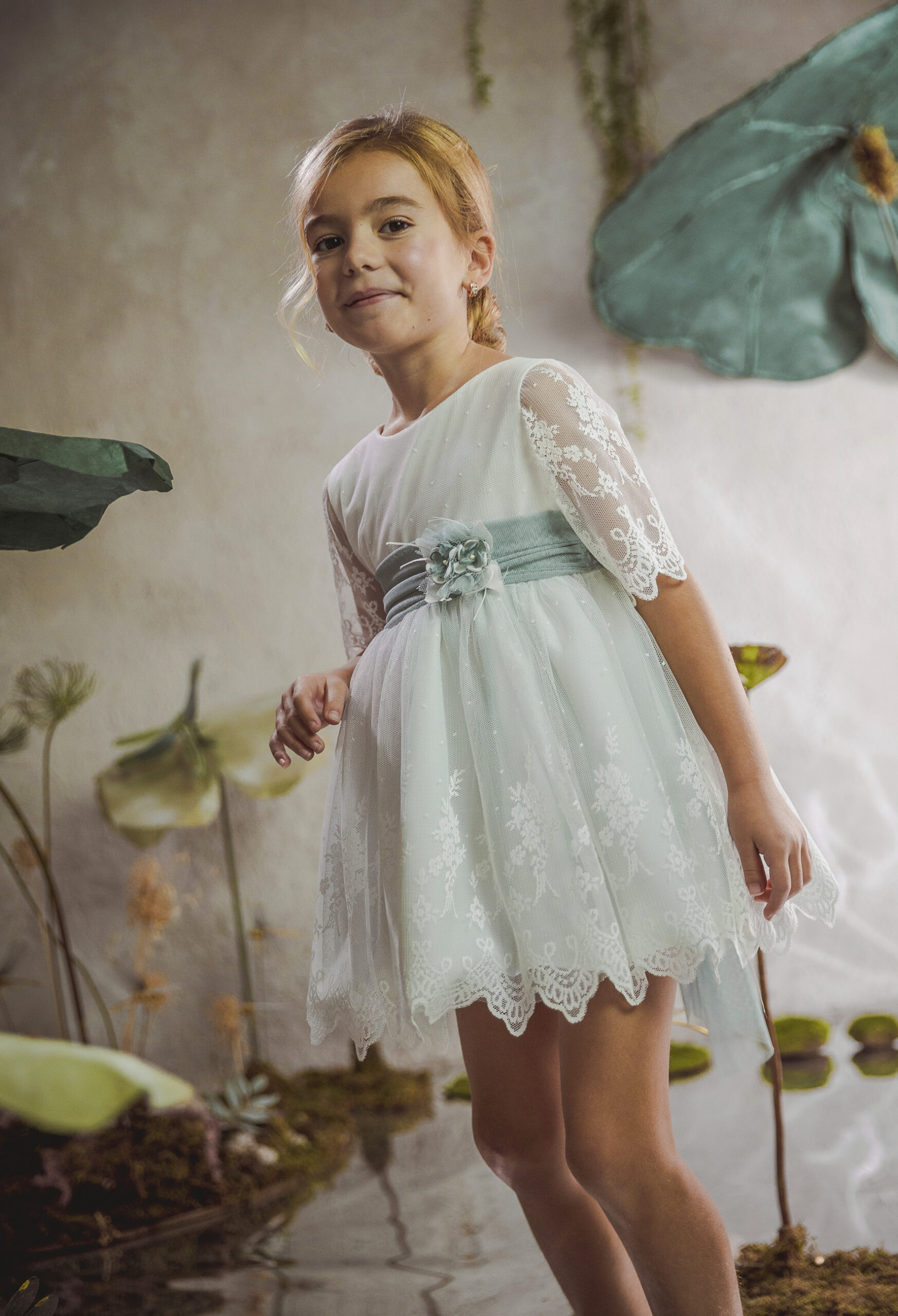 Vestido de ceremonia en tul liso. Lleva una manga de volante de puntilla, con cinturón en tul liso verde agua