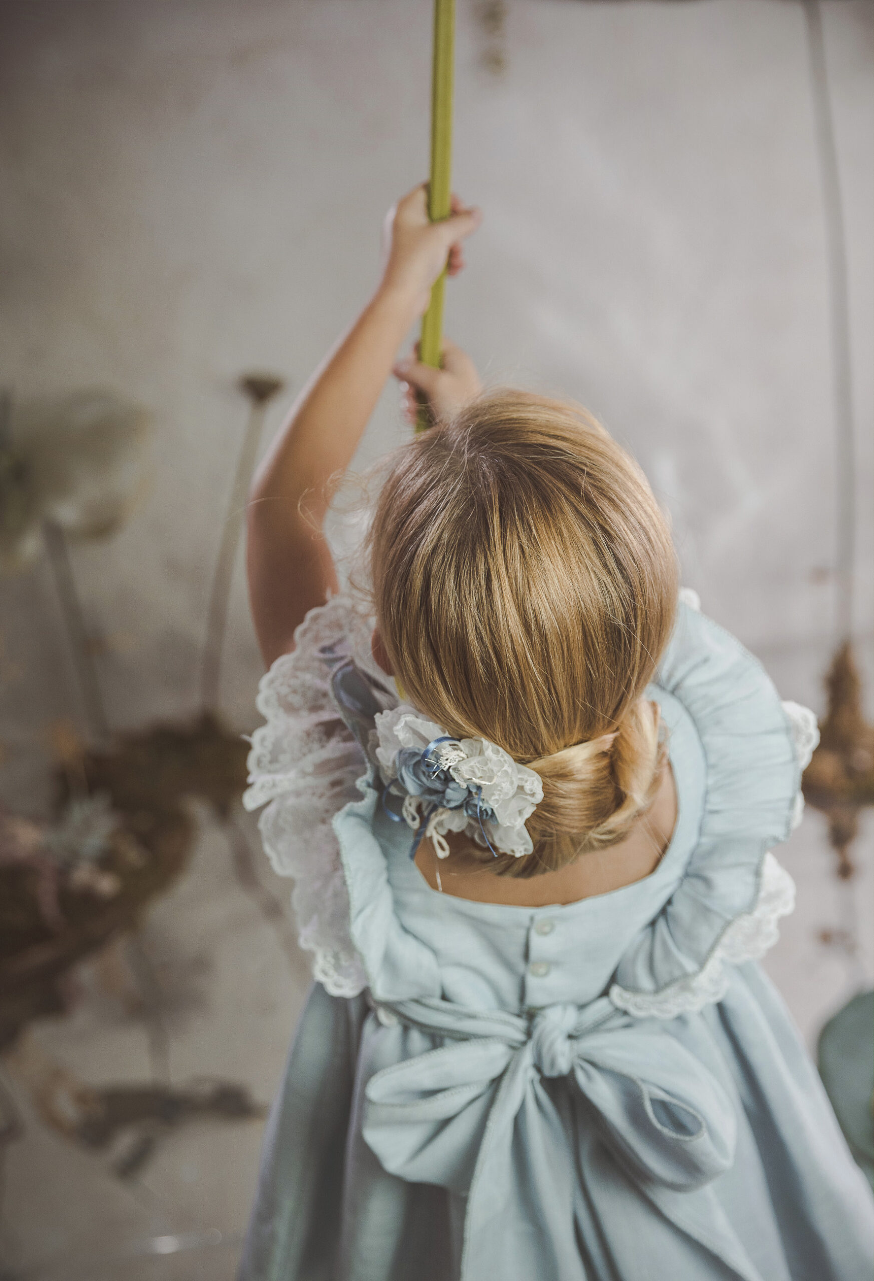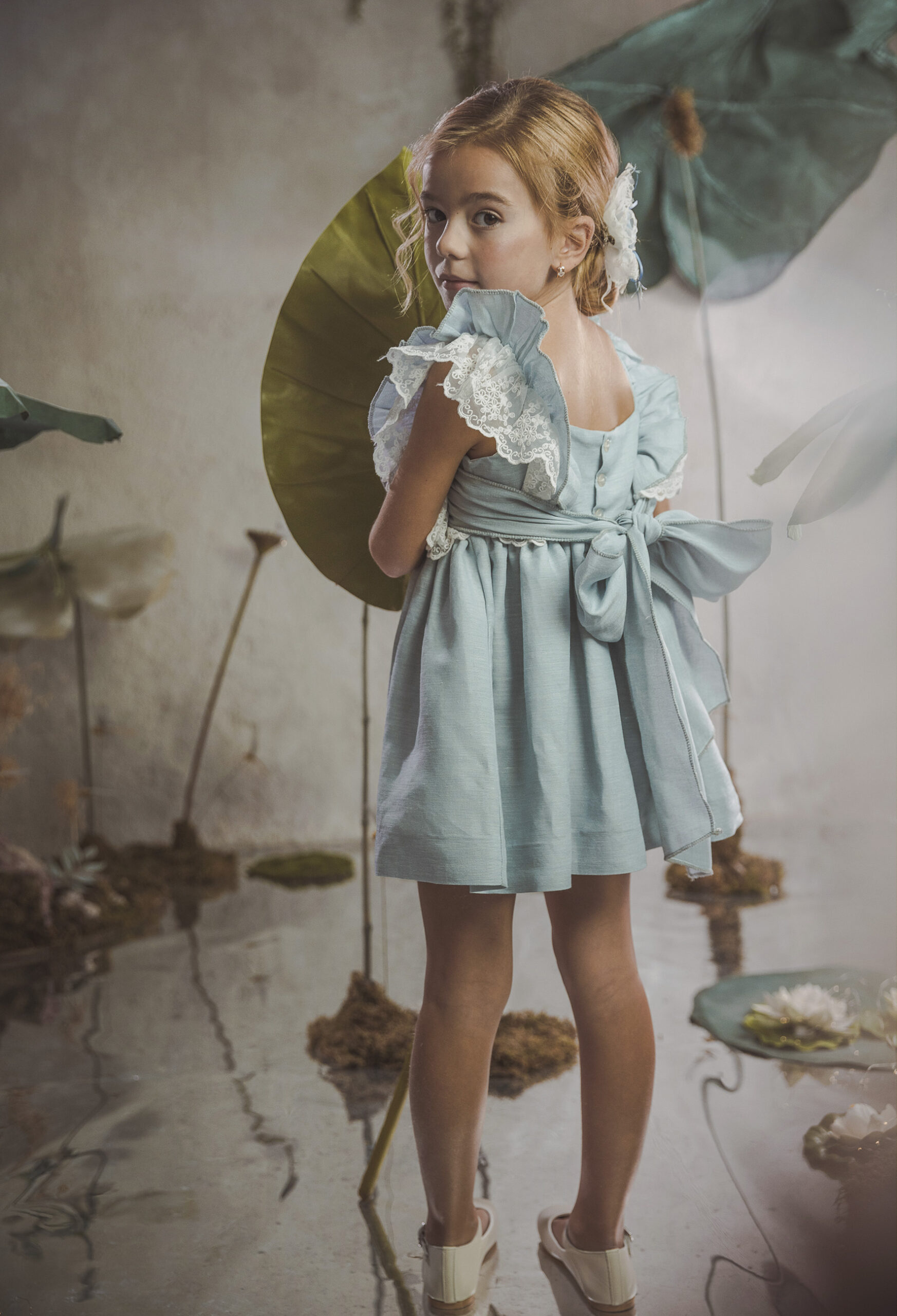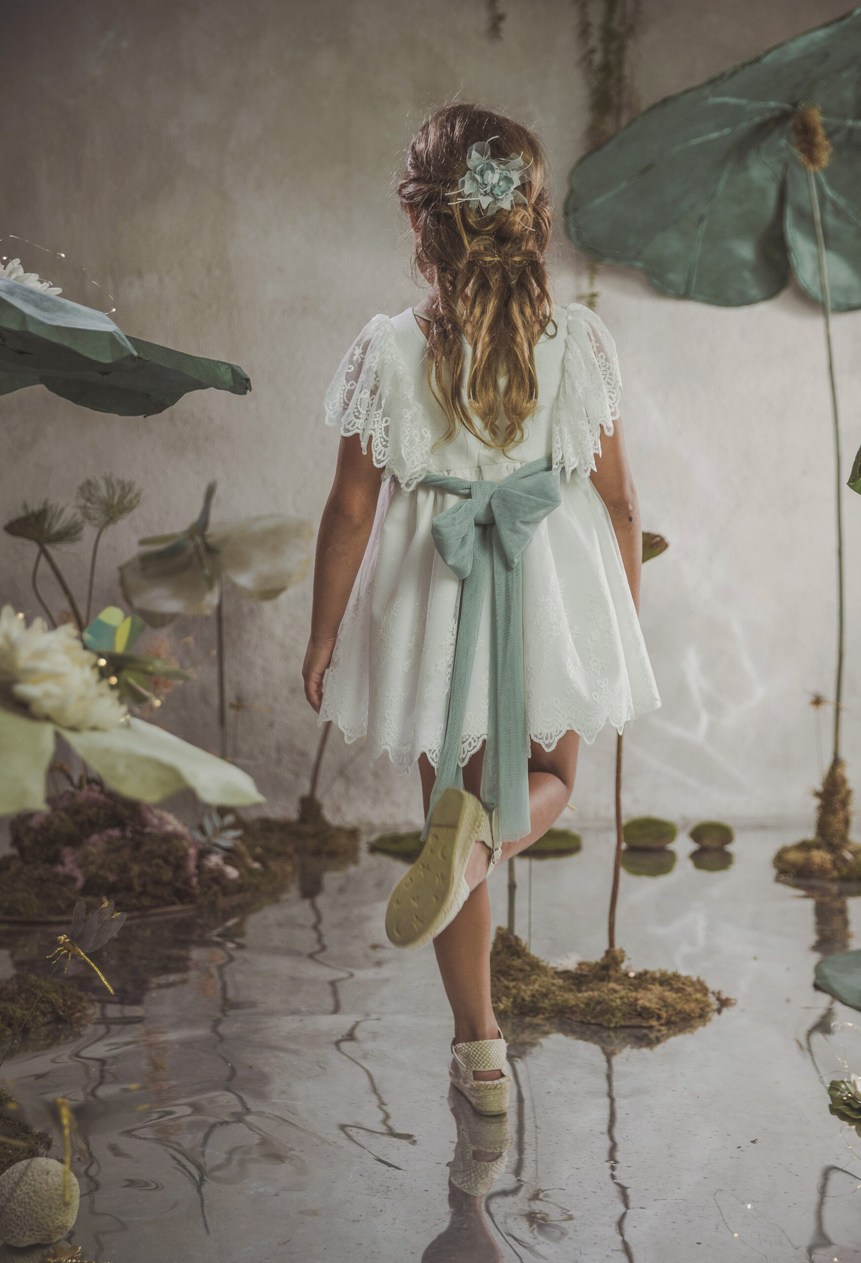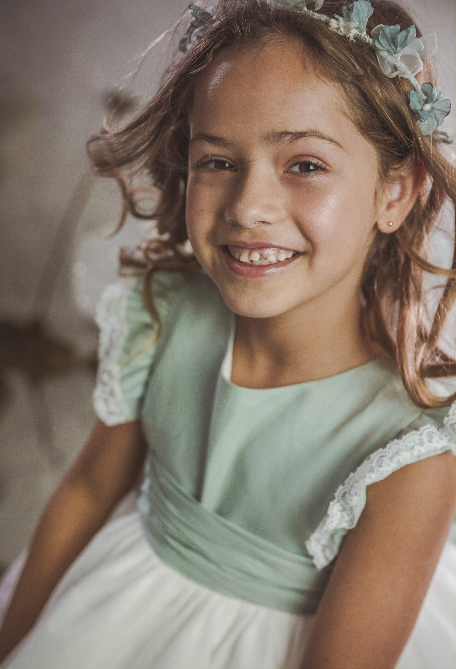 Vestido de ceremonia en tul liso. Lleva una manga de volante de puntilla, con cinturón en tul liso verde agua