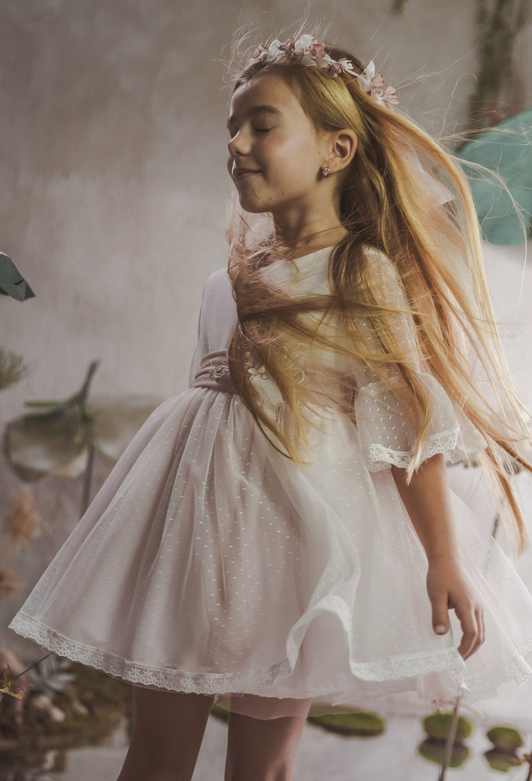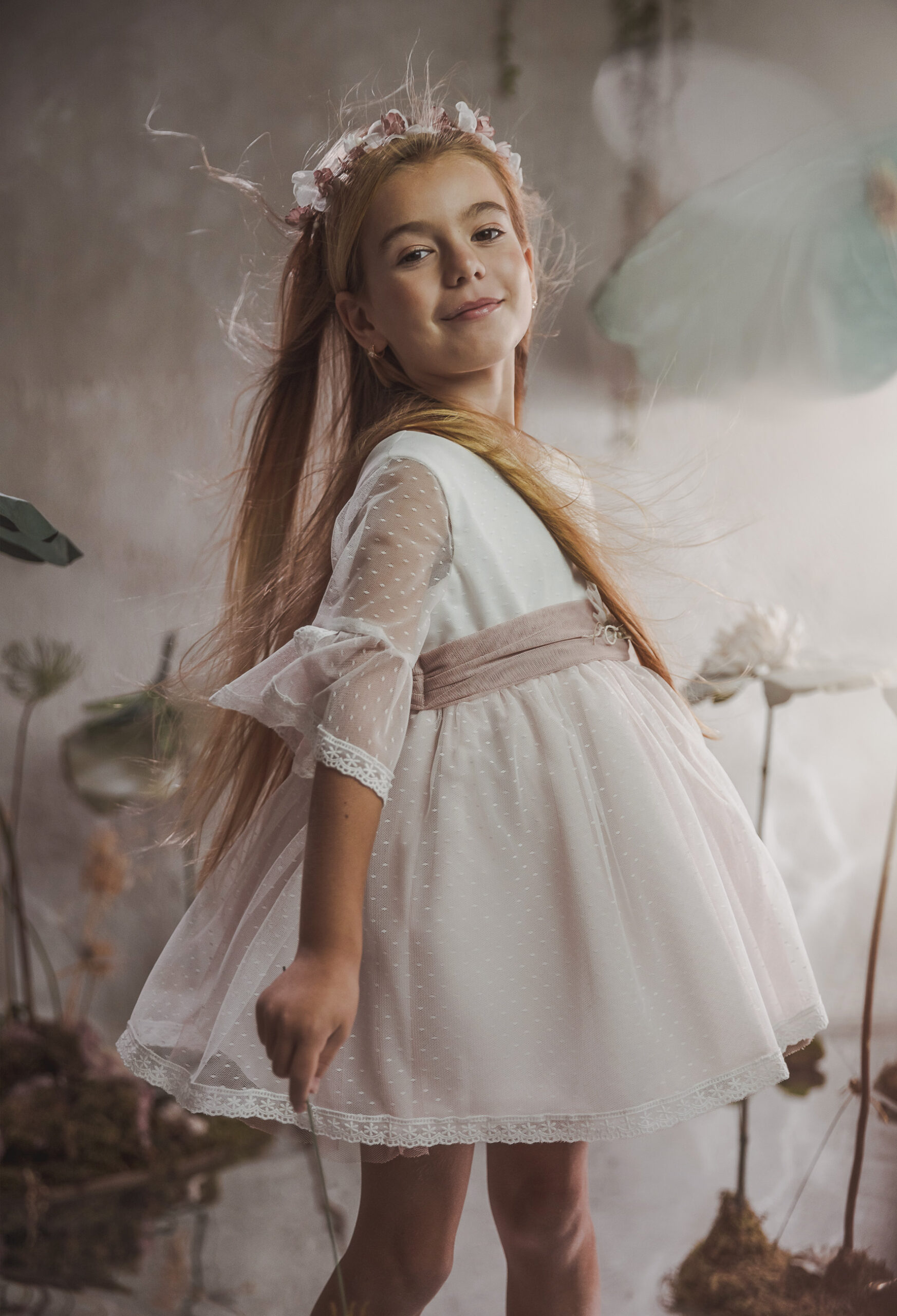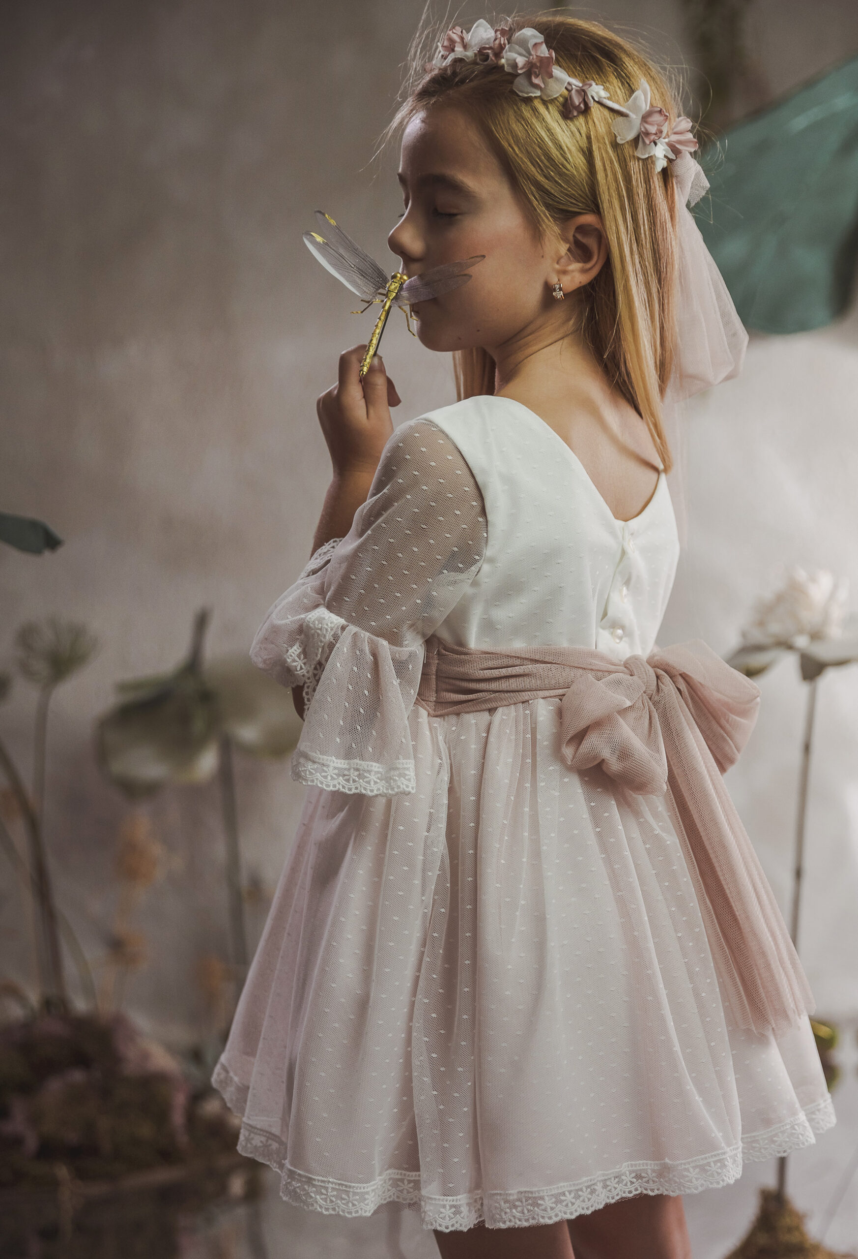Vestido de ceremonia en tul chispitas. El cuerpo es en blanco roto y la falda lleva un tono rosa. La manga es francesa con un toque rosa en el volante de la manga. La espalda lleva escote a pico redondeado.