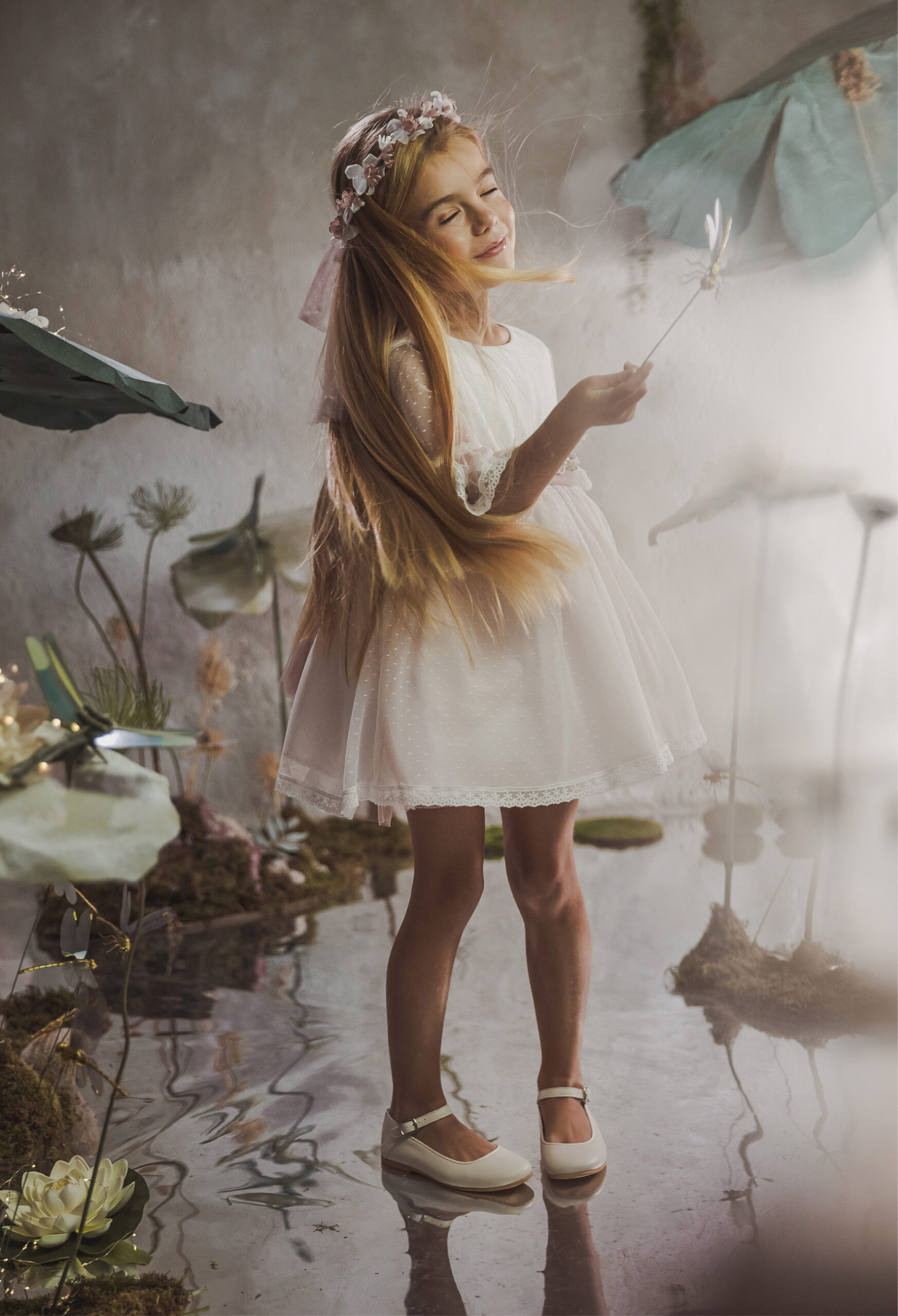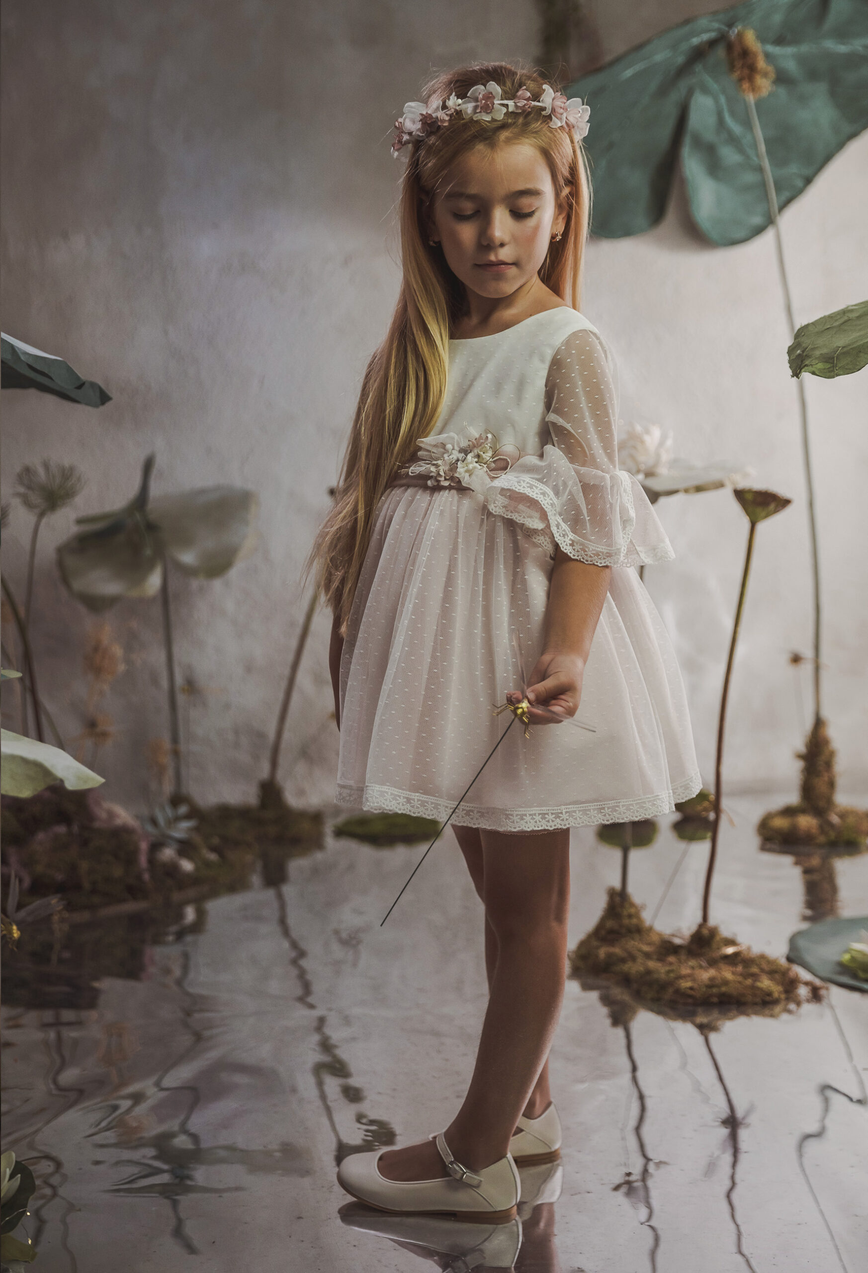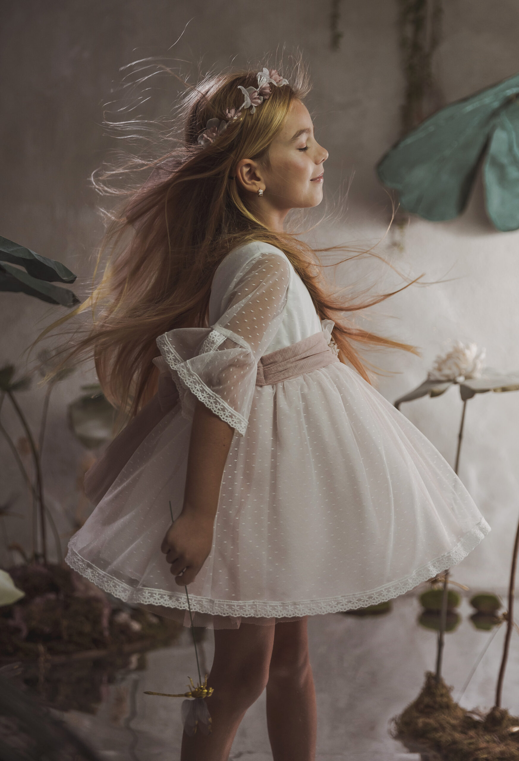 Vestido de ceremonia en tul chispitas. El cuerpo es en blanco roto y la falda lleva un tono rosa. La manga es francesa con un toque rosa en el volante de la manga. La espalda lleva escote a pico redondeado.