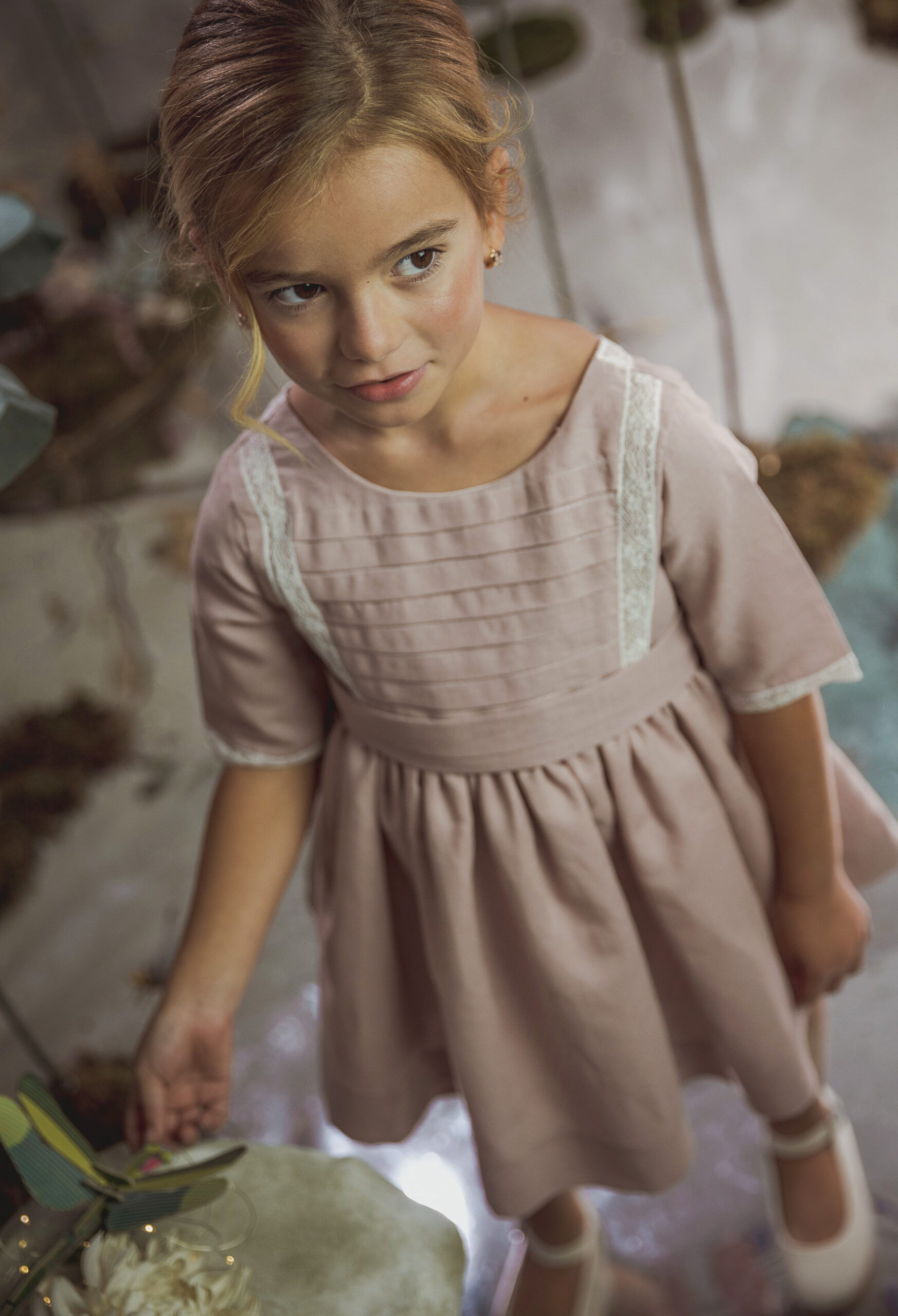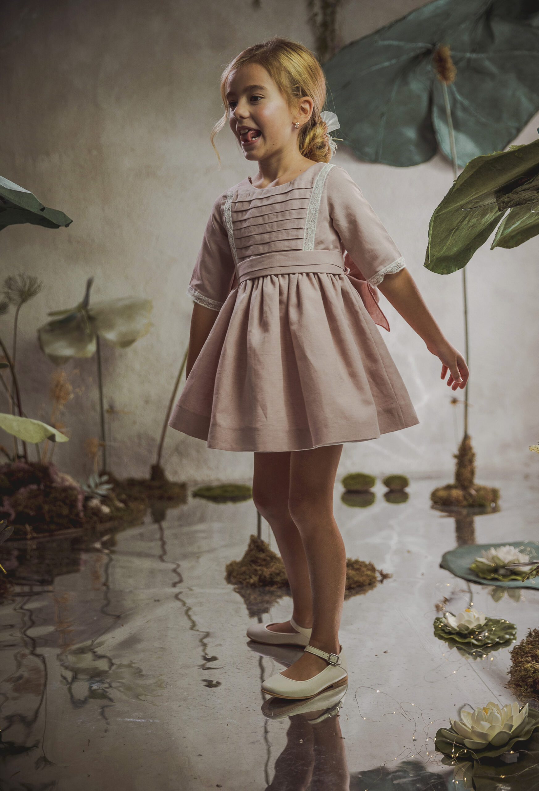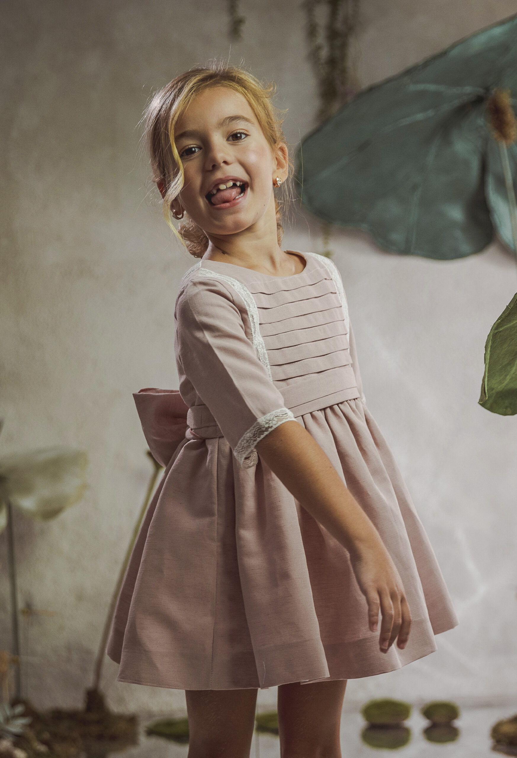 Vestido de ceremonia en lino rosa maquillaje. Lleva el cuerpo de tablas horizontales, decorado por unas bonitas puntillas, al igual que en escote de la espalda.