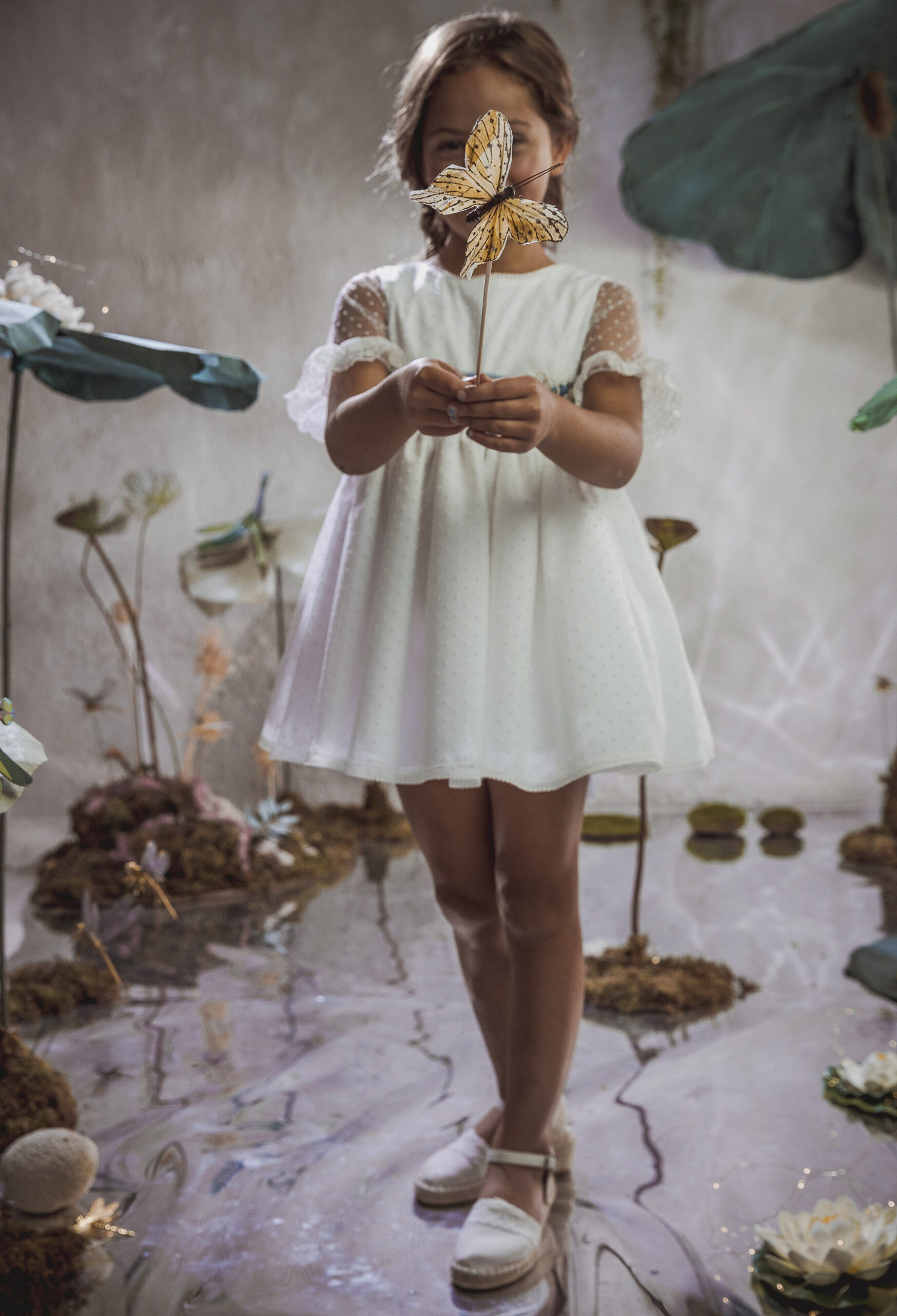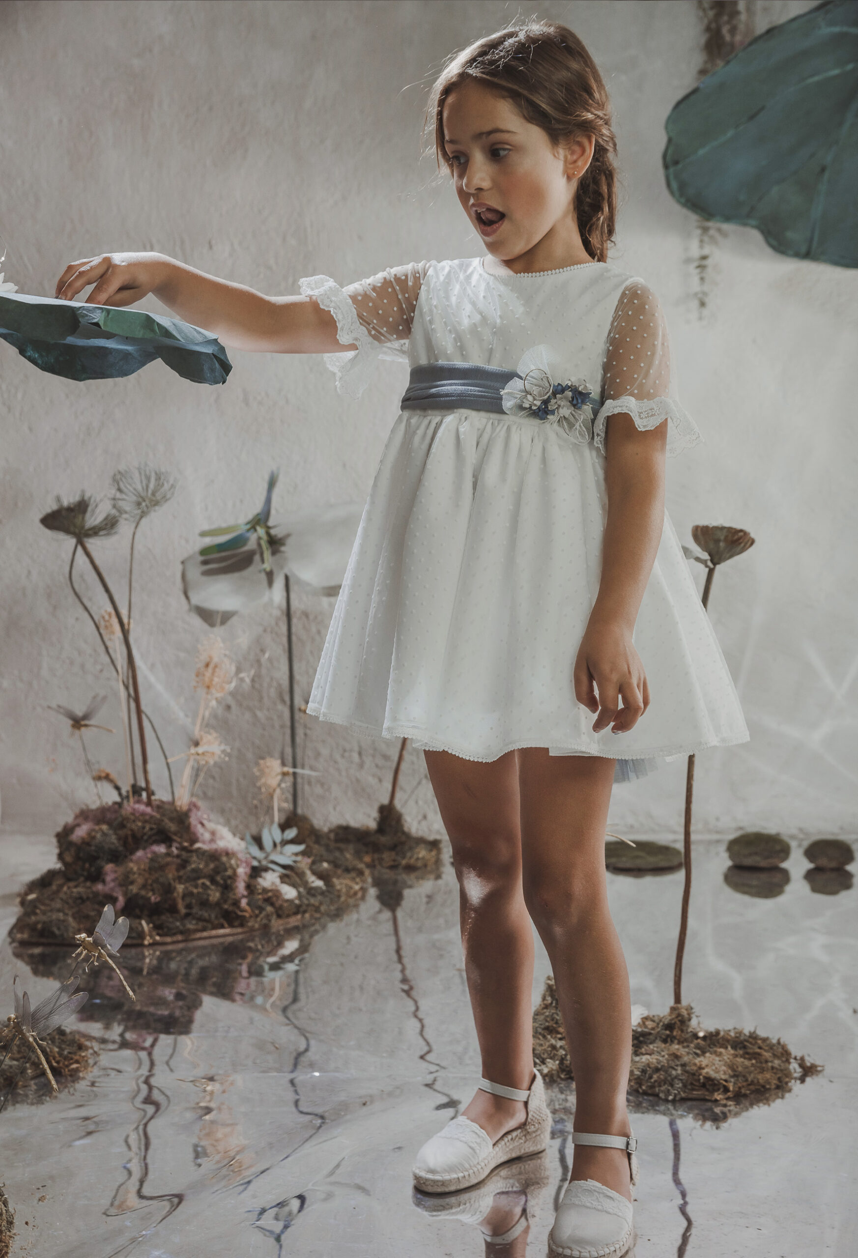 Vestido de ceremonia en plumeti bambula. Todo en un tejido con caída de bambula de plumeti, lo que le da mucho movimiento y elegancia, es un vestido con un cuello redondo con una fina puntilla, que termina en el escote a pico que lleva en la espalda. De corte a la cintura, con una falda fruncida rematada con una puntilla, al igual que el remate de la manga francesa.