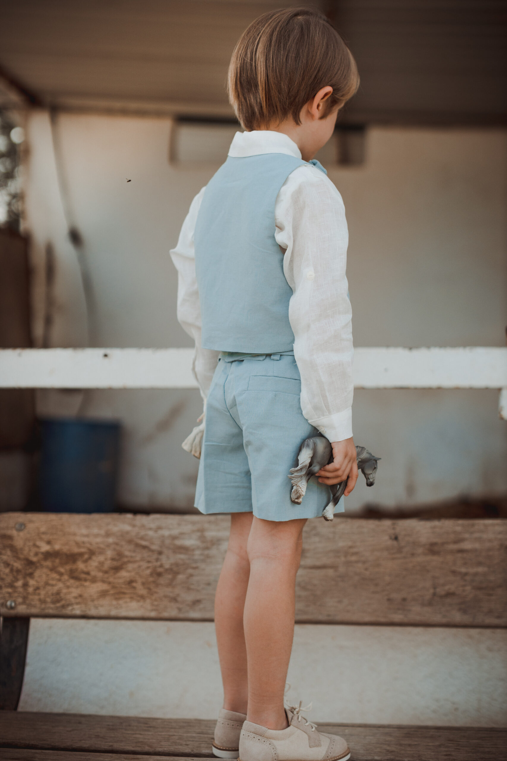Conjunto de lino niño. Camisa de cuello mao en lino crudo y pantalón y fajín de jaretas de lino azul.
