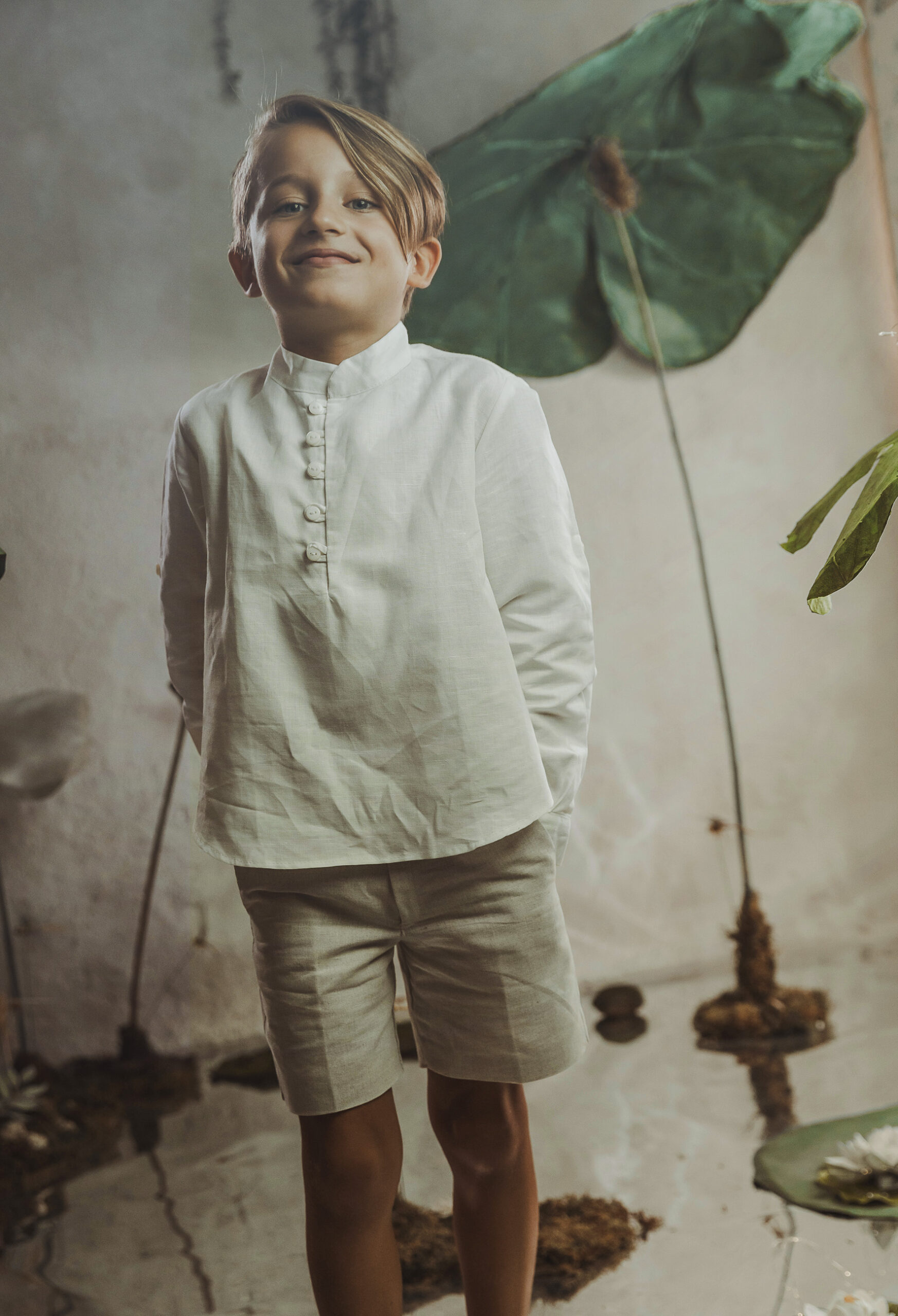 Conjunto de lino niño. Camisa de cuello mao en lino crudo y pantalón y fajín de jaretas de lino crudo.